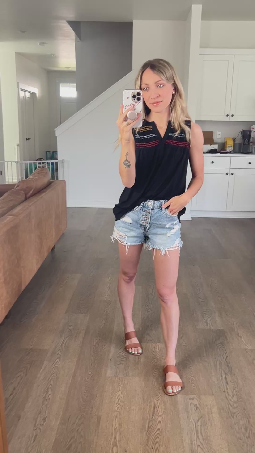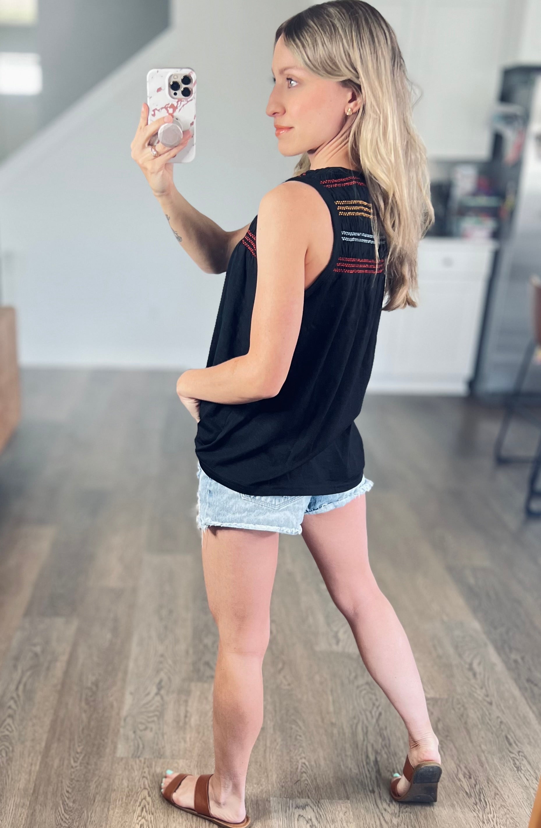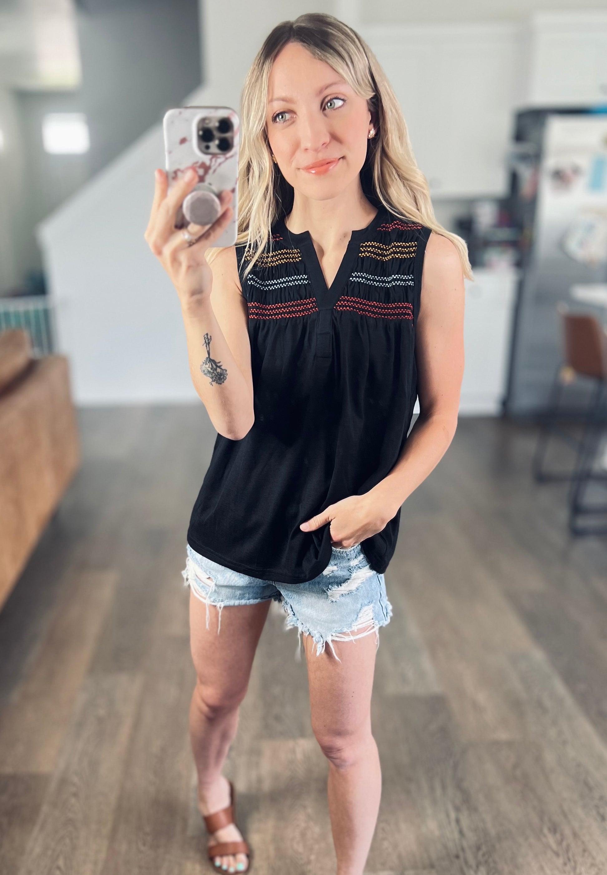 This top features beautiful embroidery with a classic tank silhouette. It’s the perfect summer to fall transition style! Flowy and easy to wear.