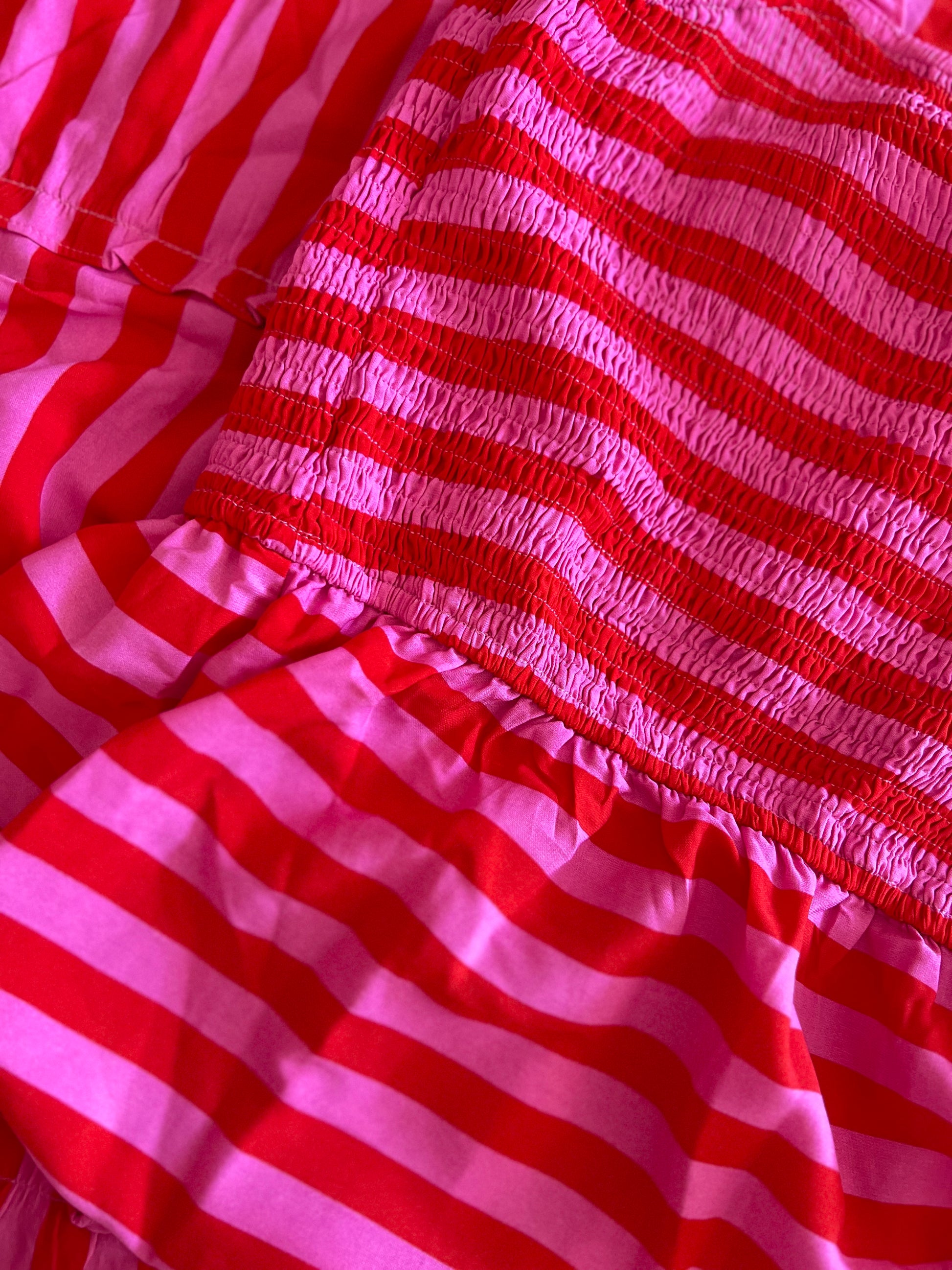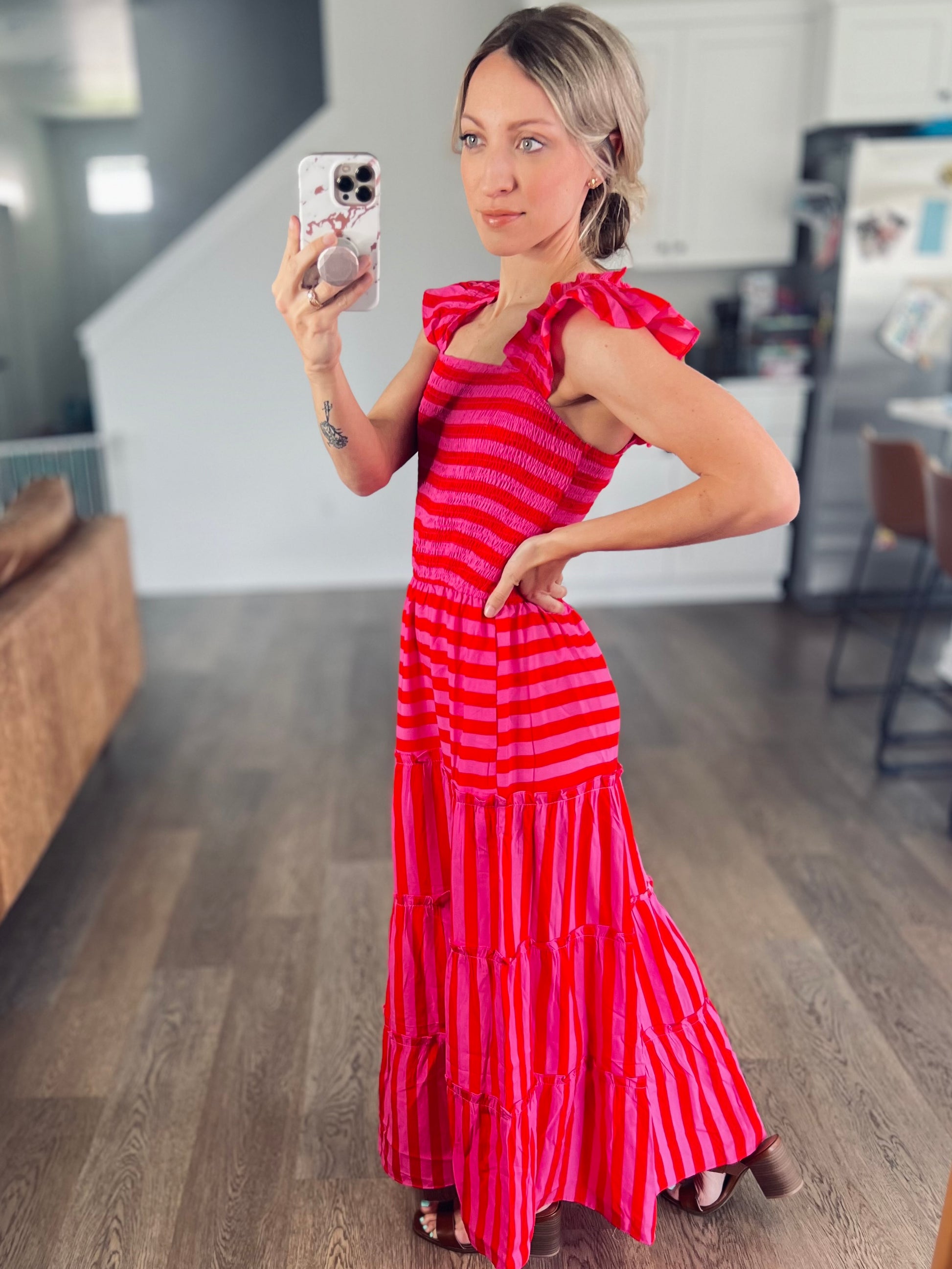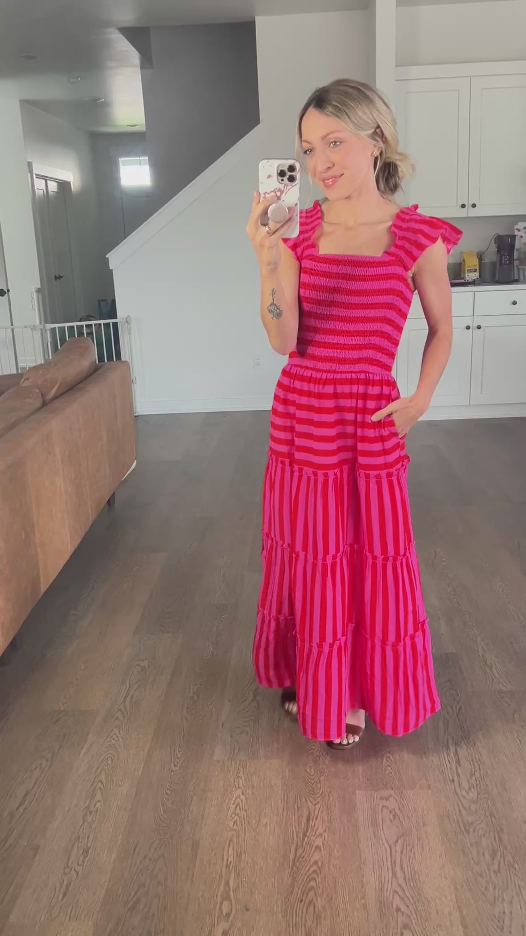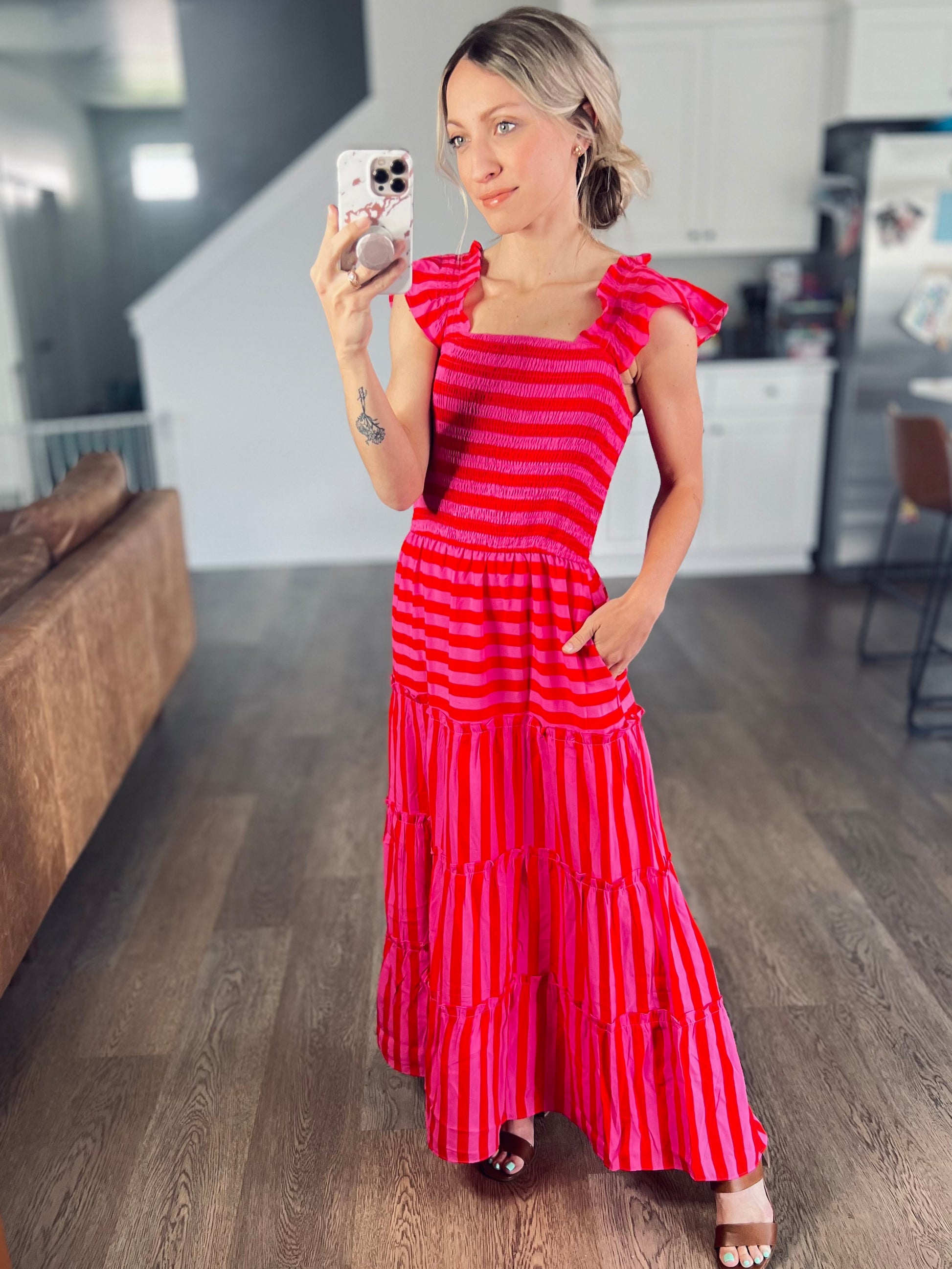 Bright, bold, and ready for sunshine! This red and pink striped maxi brings the fun with ruffle sleeves, a stretchy smocked top, and a twirl-worthy tiered skirt. Comfy, colorful, and has POCKETS!