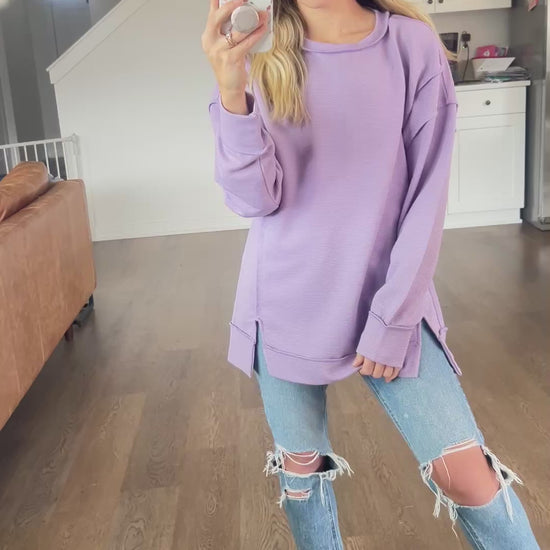Cute, easy, and never goes out of style! This relaxed pullover features a ribbed material with exposed sems and that perfect lived-in feel.
