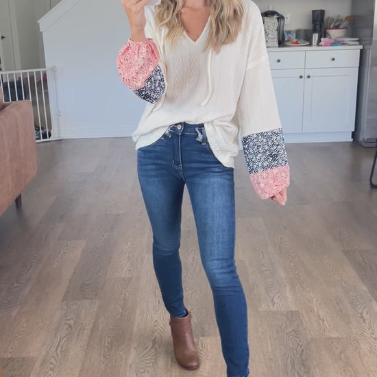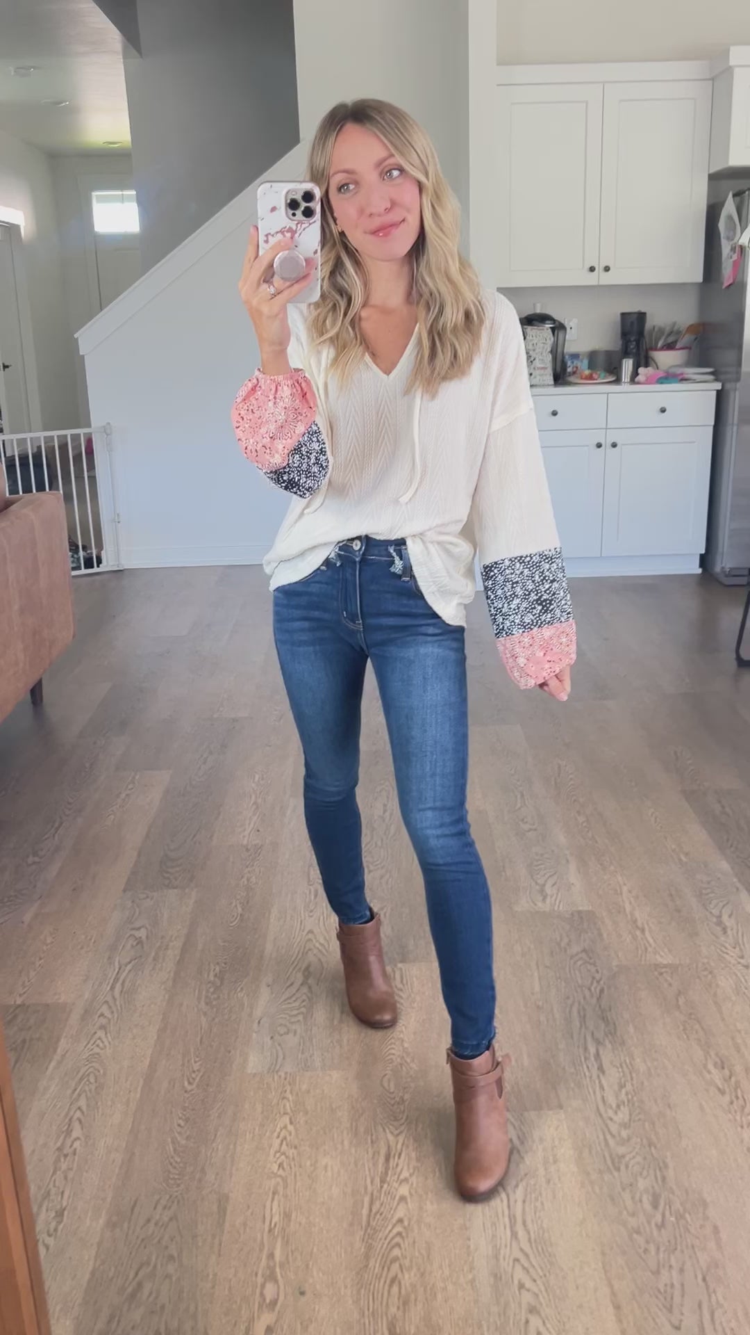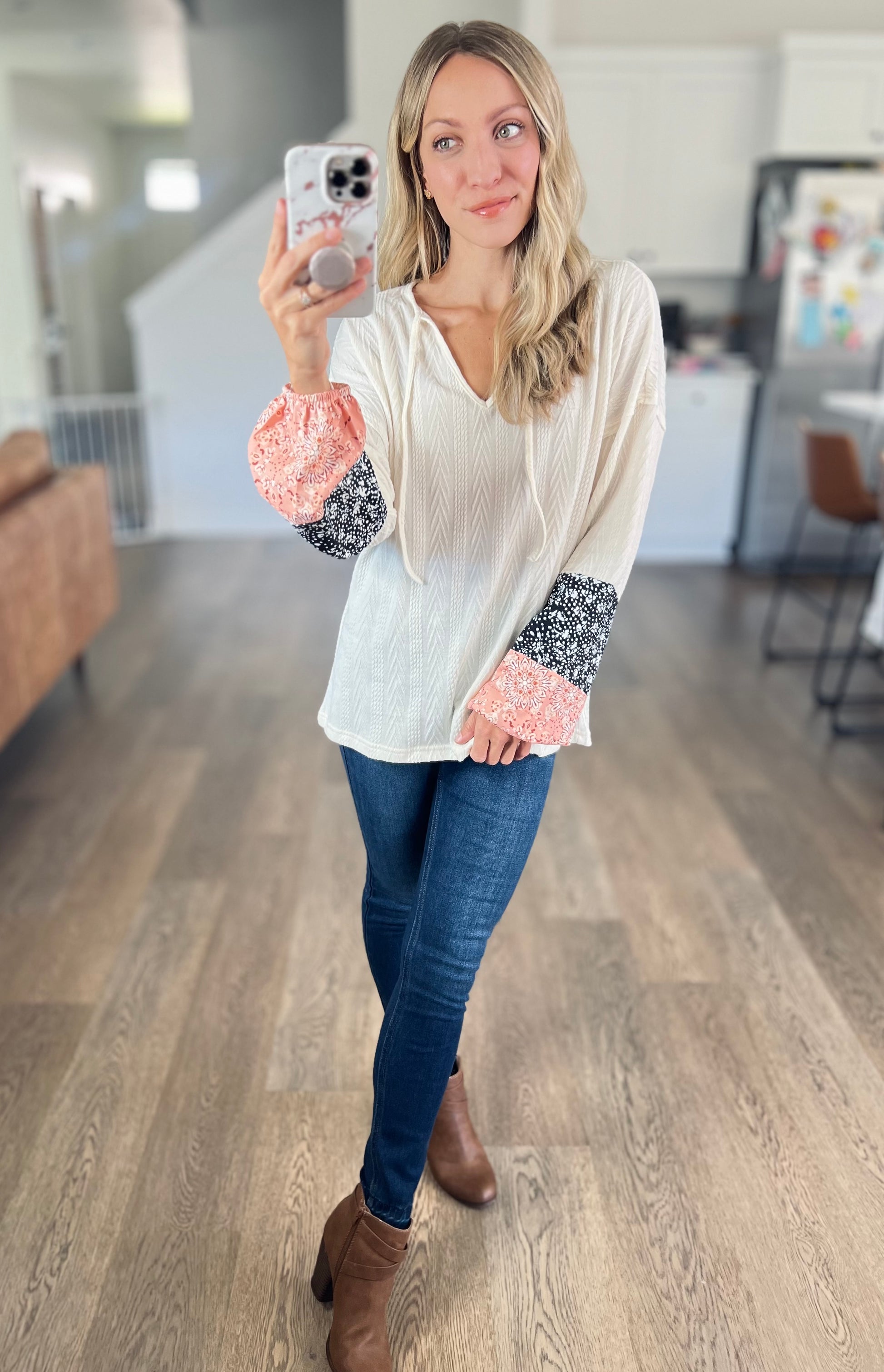 Goodness this top is beautiful! Featuring a textured material with boho details. I love the mixed patterns on the sleeves and the overall vibe this top gives!