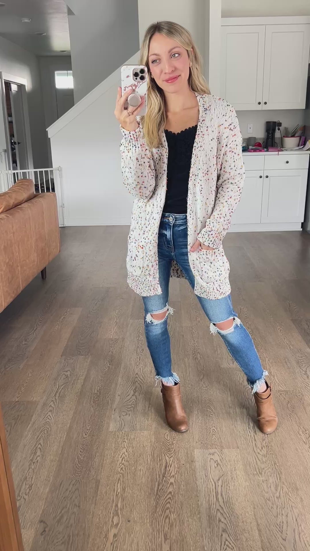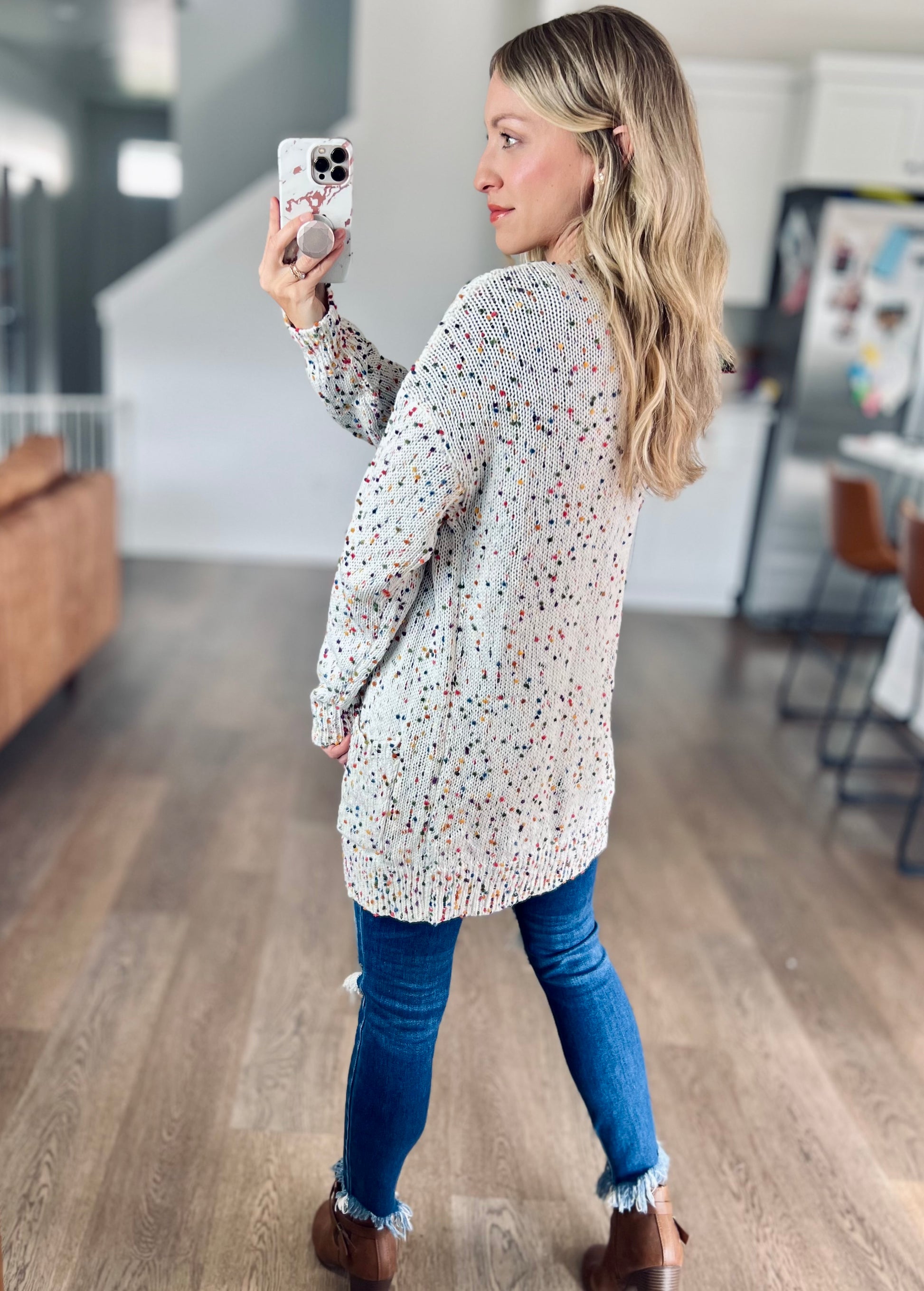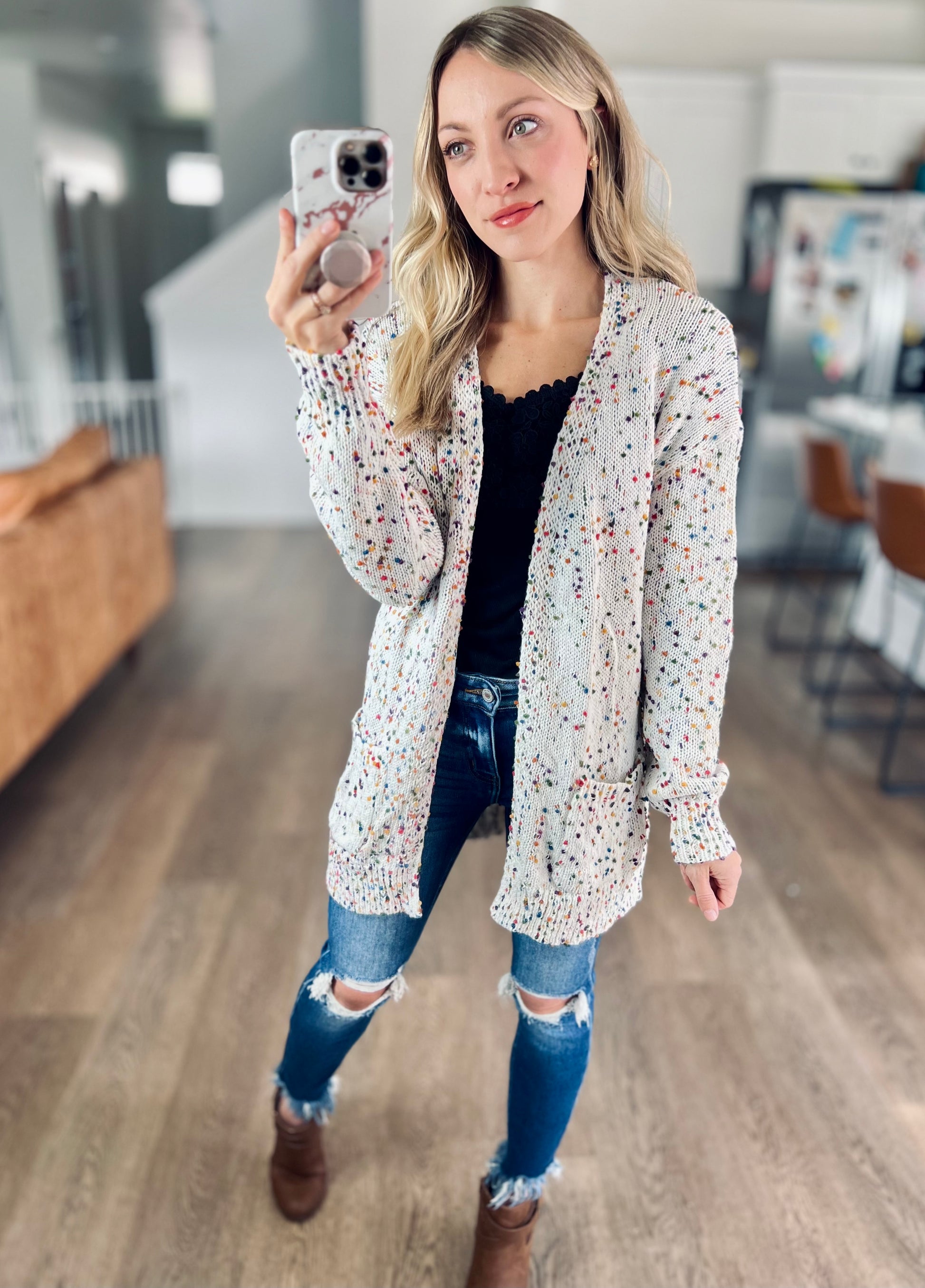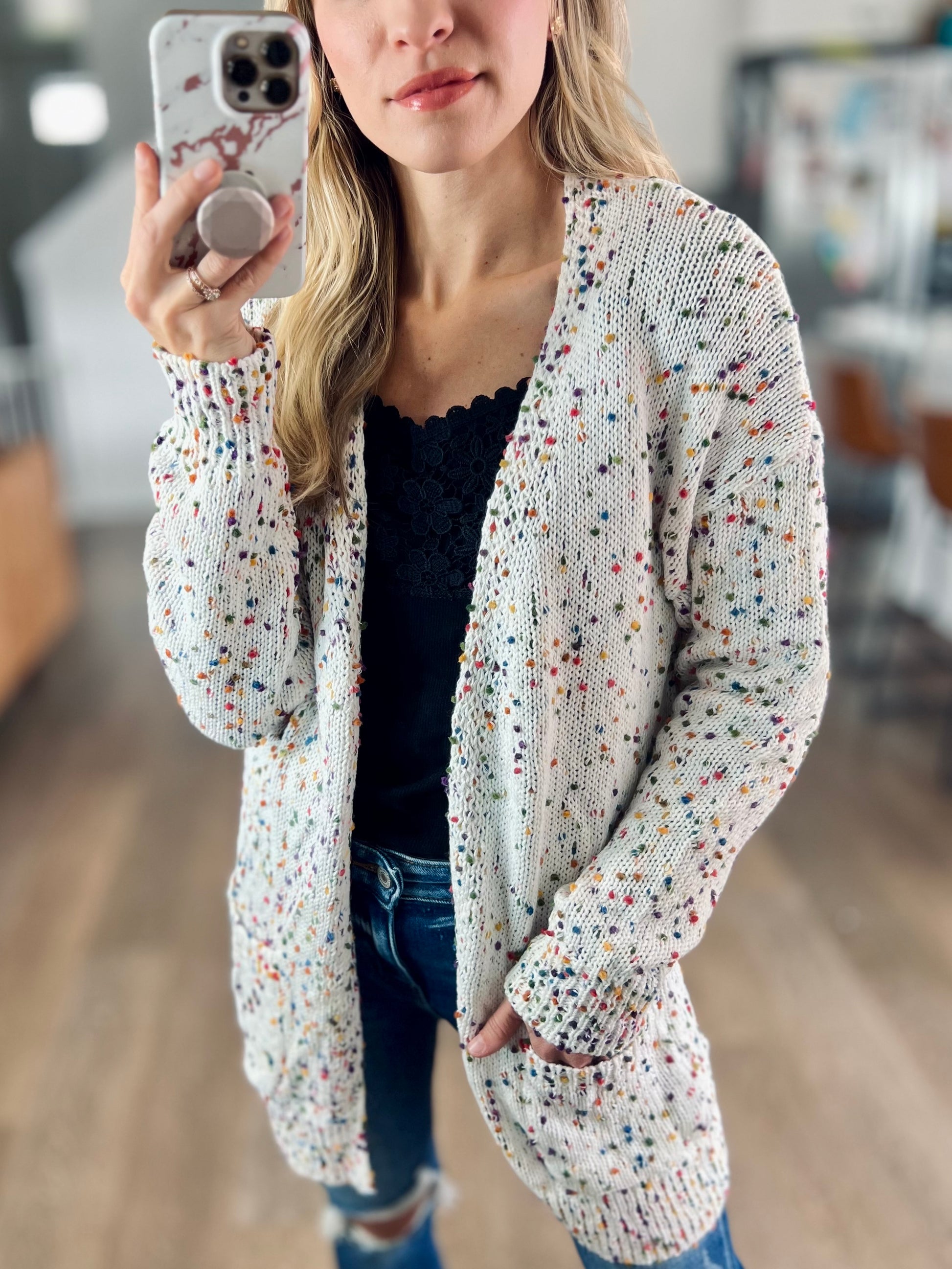 Always in love with anything in a confetti knit! This one has a soft feel, fun rainbow flecks throughout, pockets, and will be something you’ll get tons of compliments on! Always easy to throw on and look cute in :)