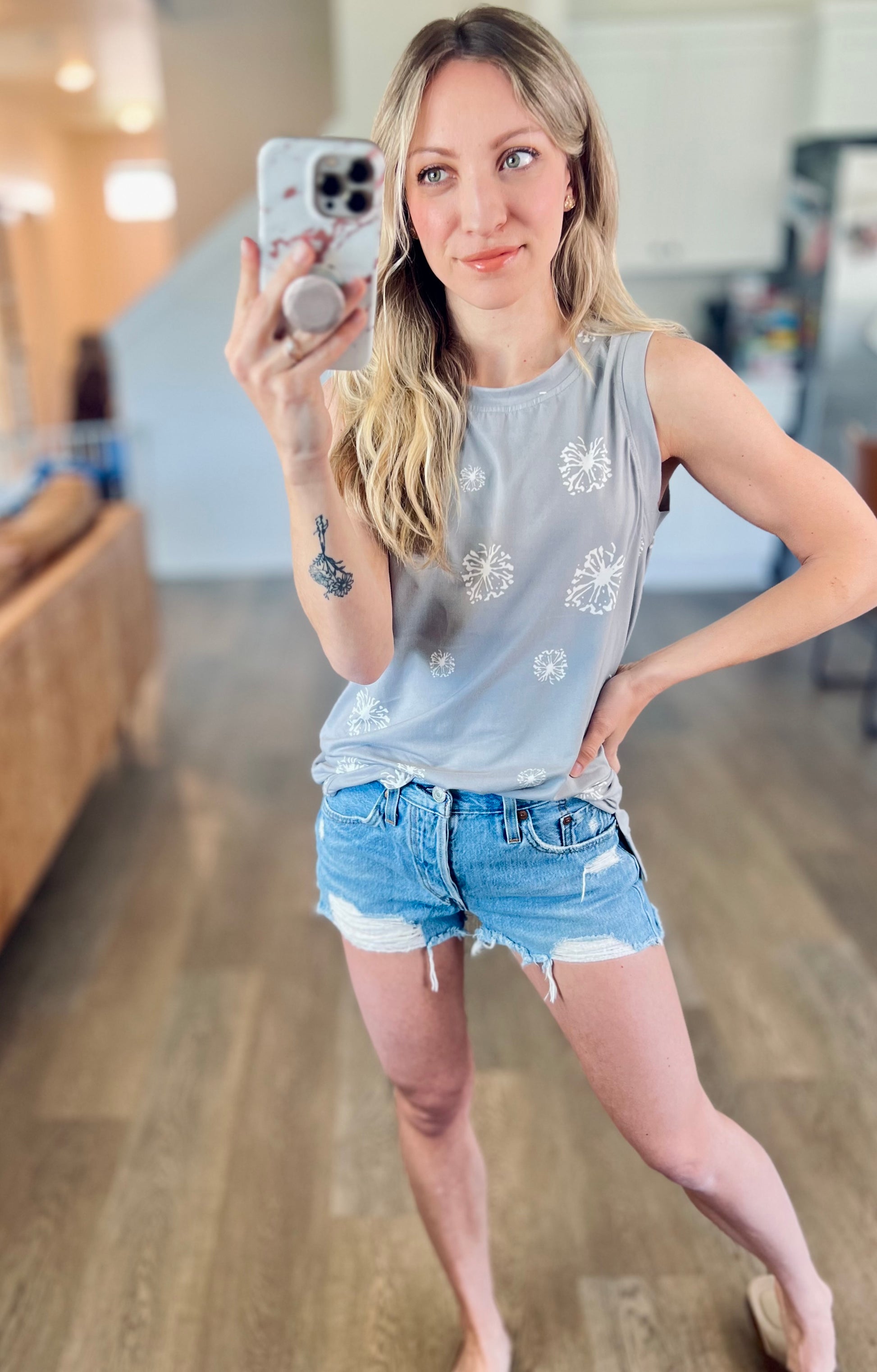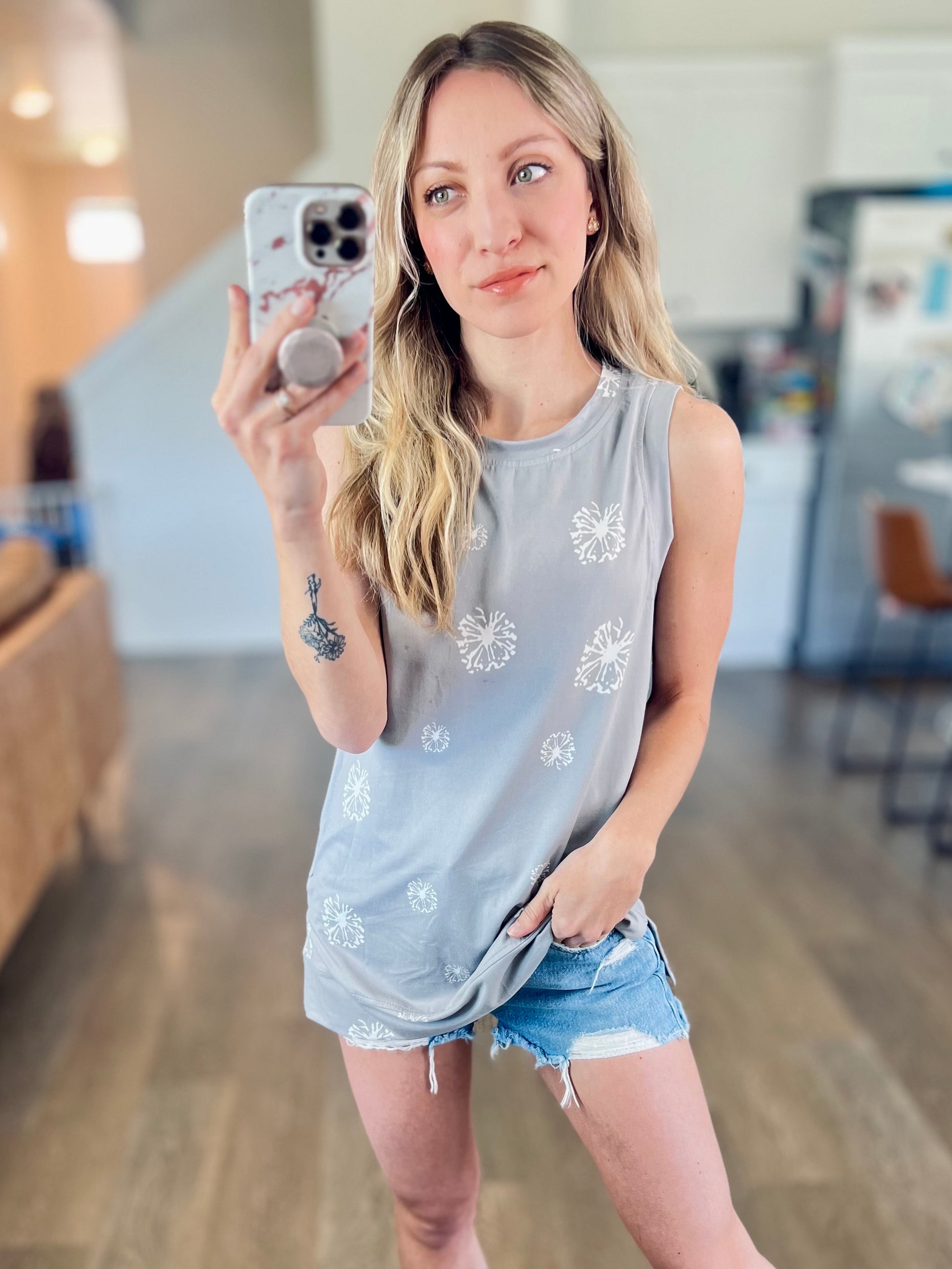 This tank is sooo SOFT! I love that it’s something different than the norm. Grey with dandelion design. True to size and really stretchy!