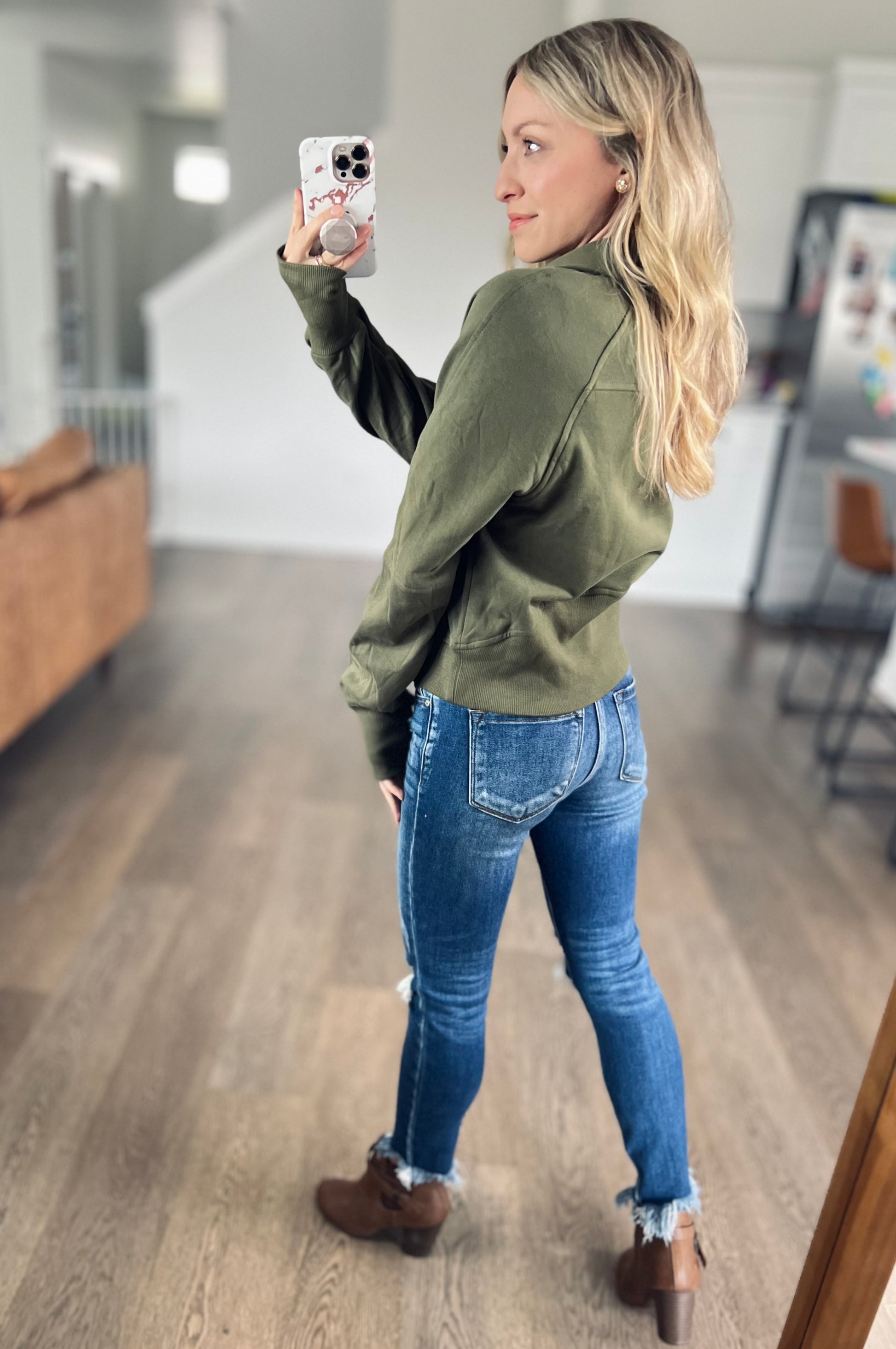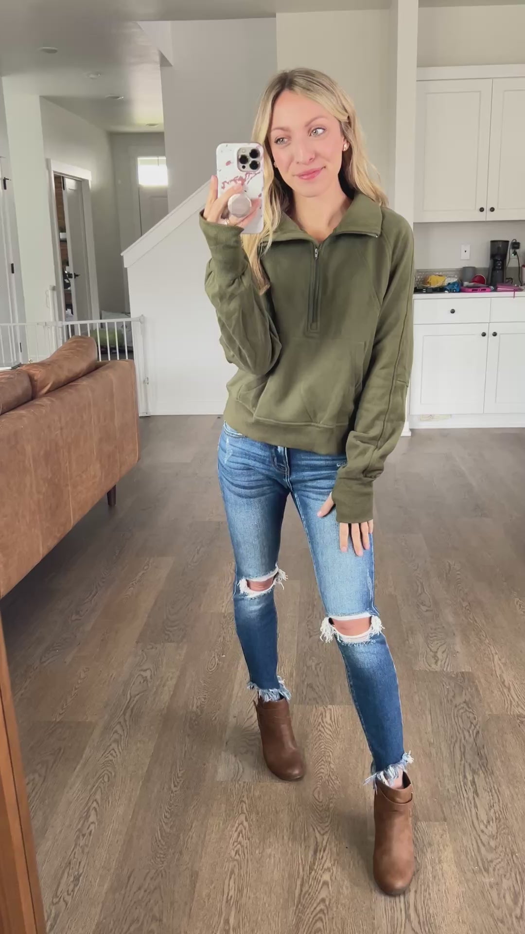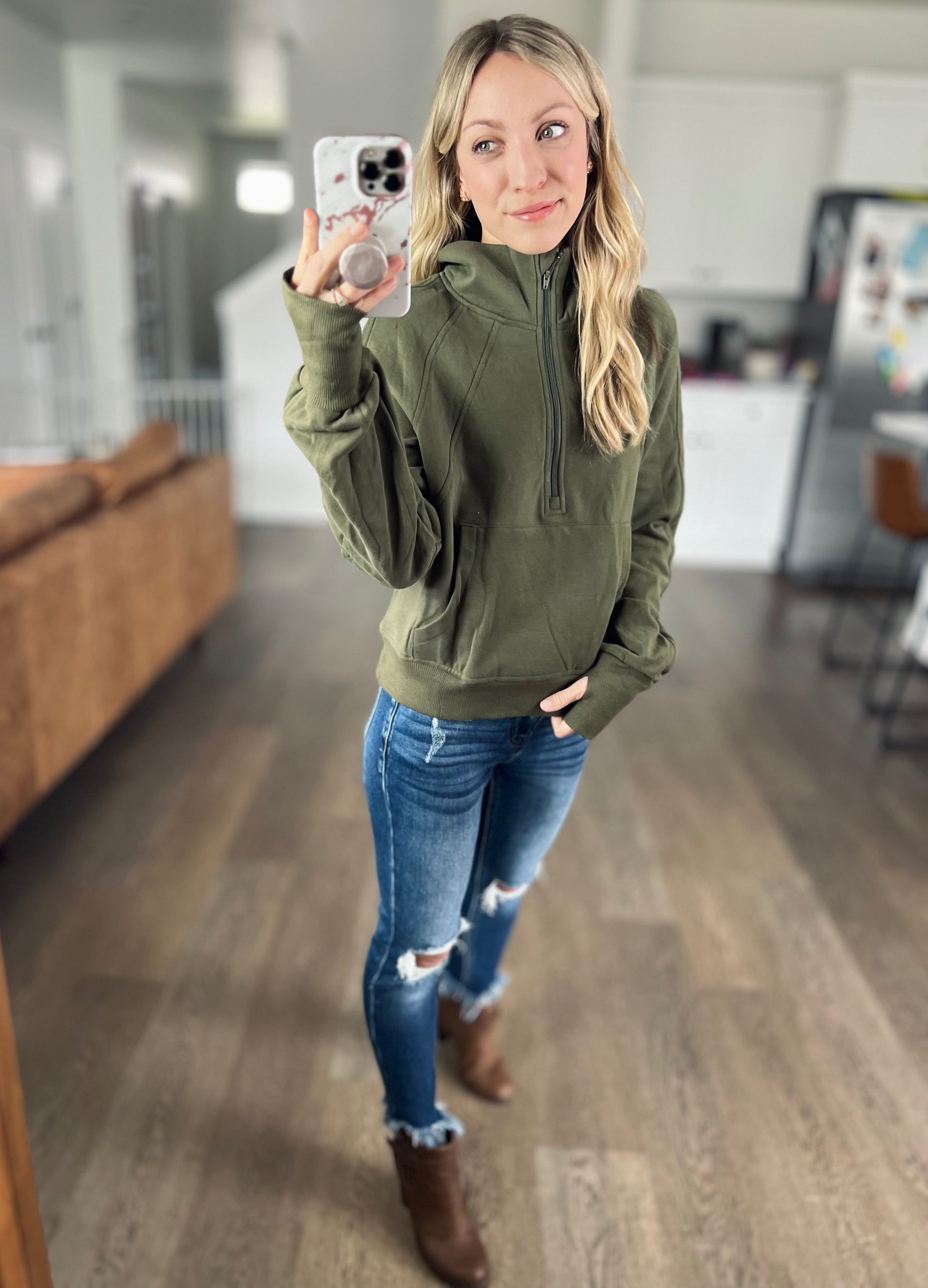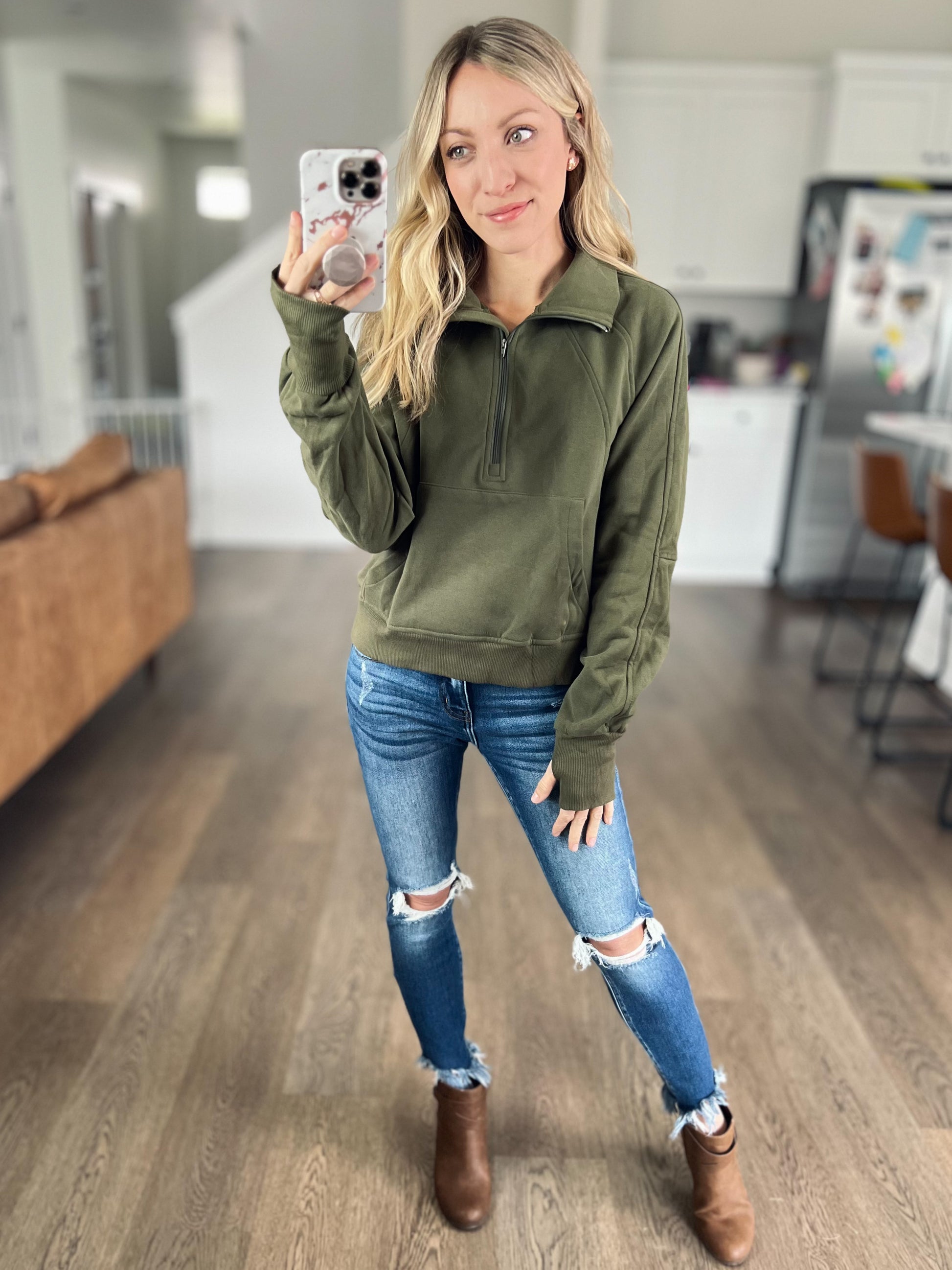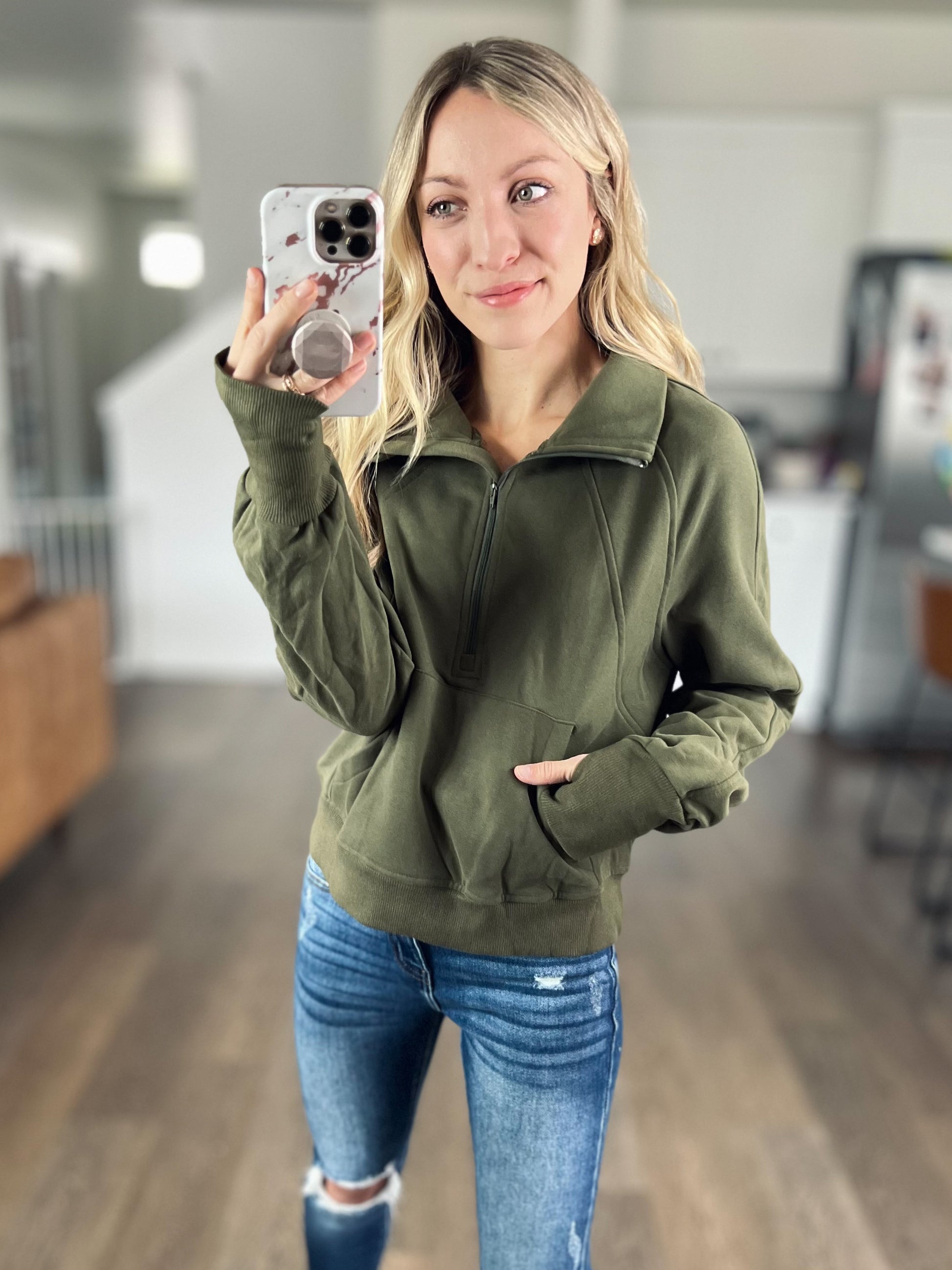 Pullover perfection. We had this in a couple other colors previously so if you grabbed one of those then you know this is a need! This 1/2 zip is so comfortable! It’s features a light fleece lining, front kangaroo pocket, and thumbholes! The outer of the pullover feels luxe and soft.