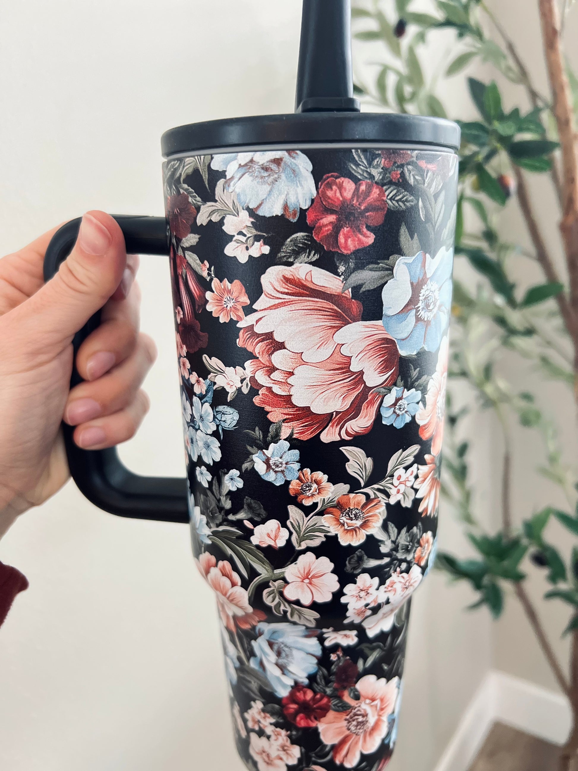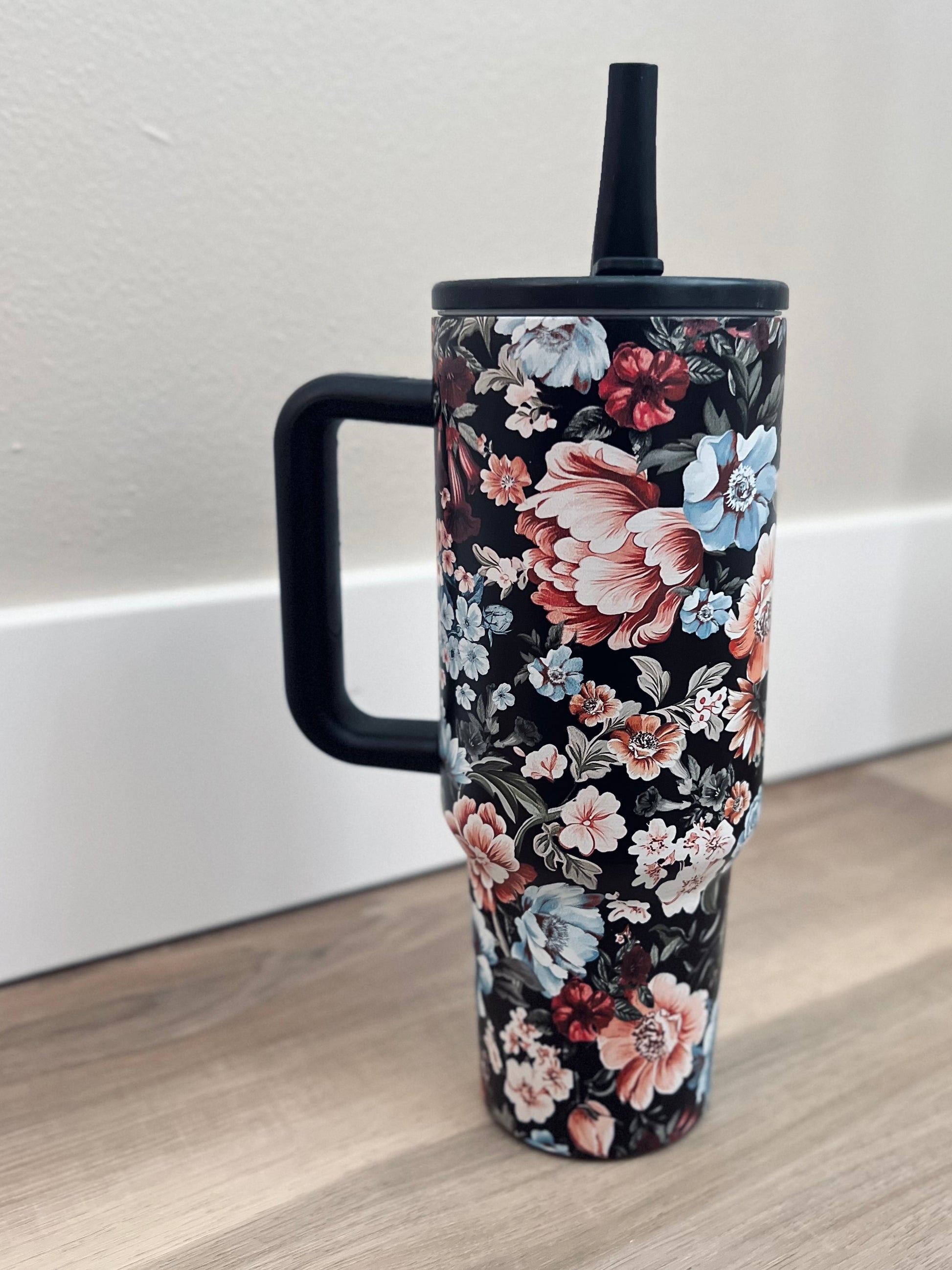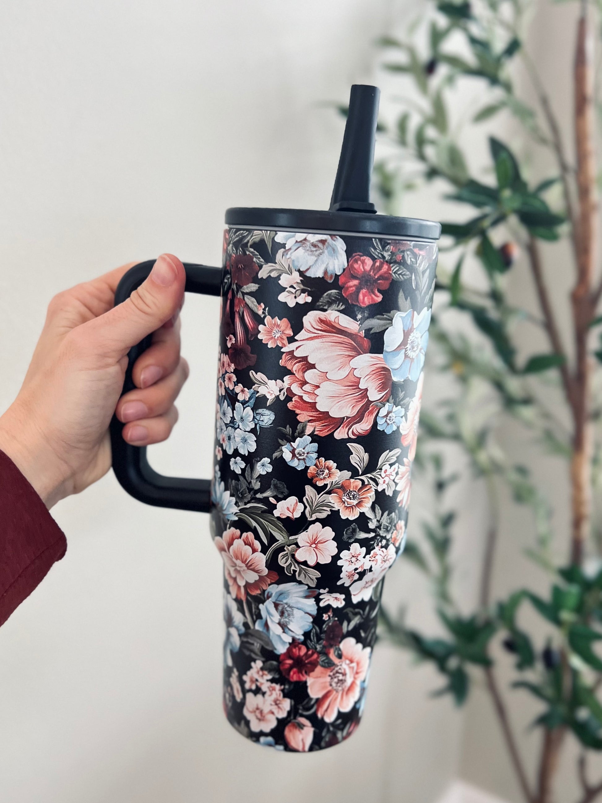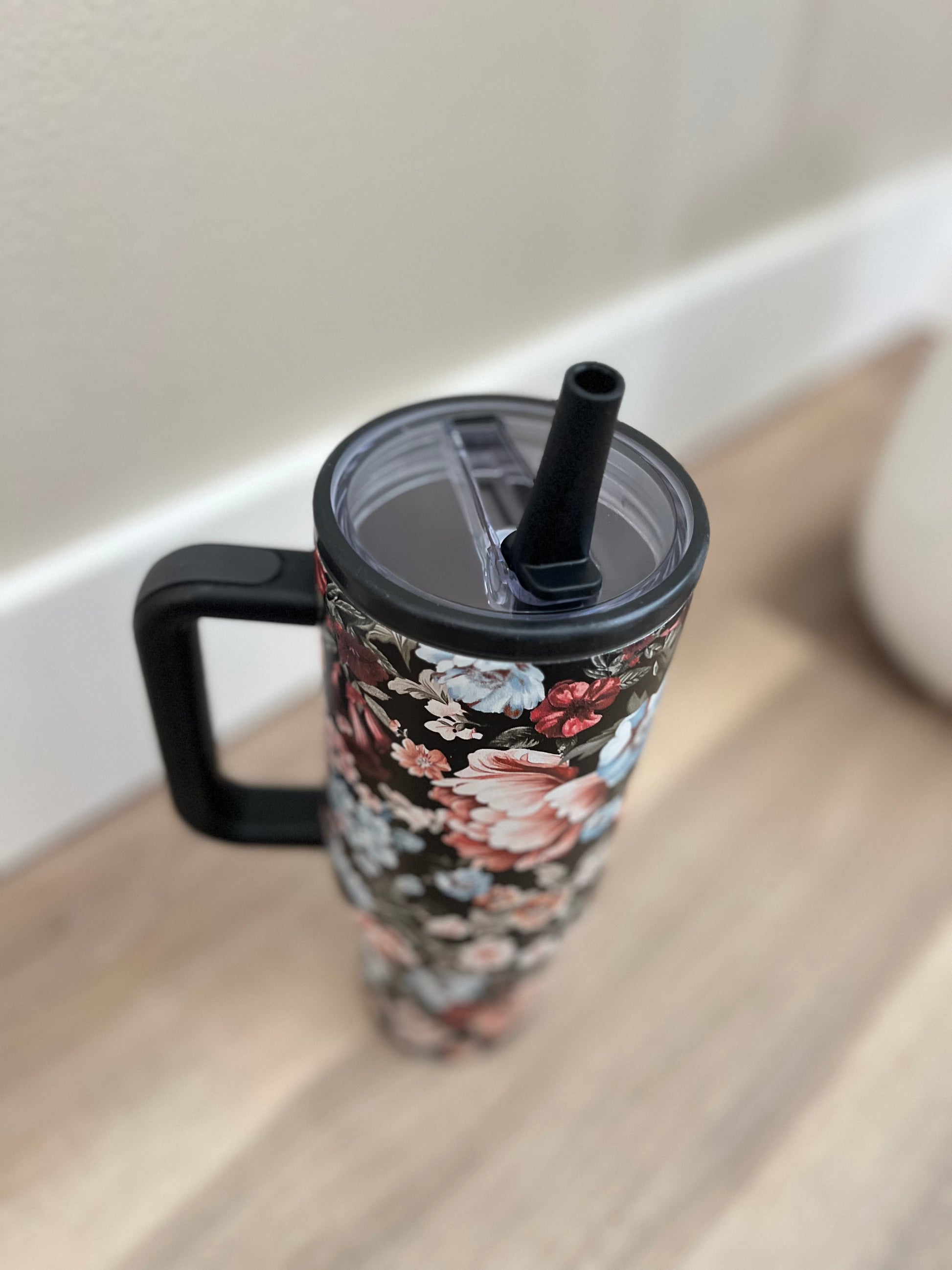 Enjoy your drinks in style with a beautiful flower print design. Easy and comfortable to carry with the sturdy handle. Flip straw mouthpiece (folds down) with a straw included inside.