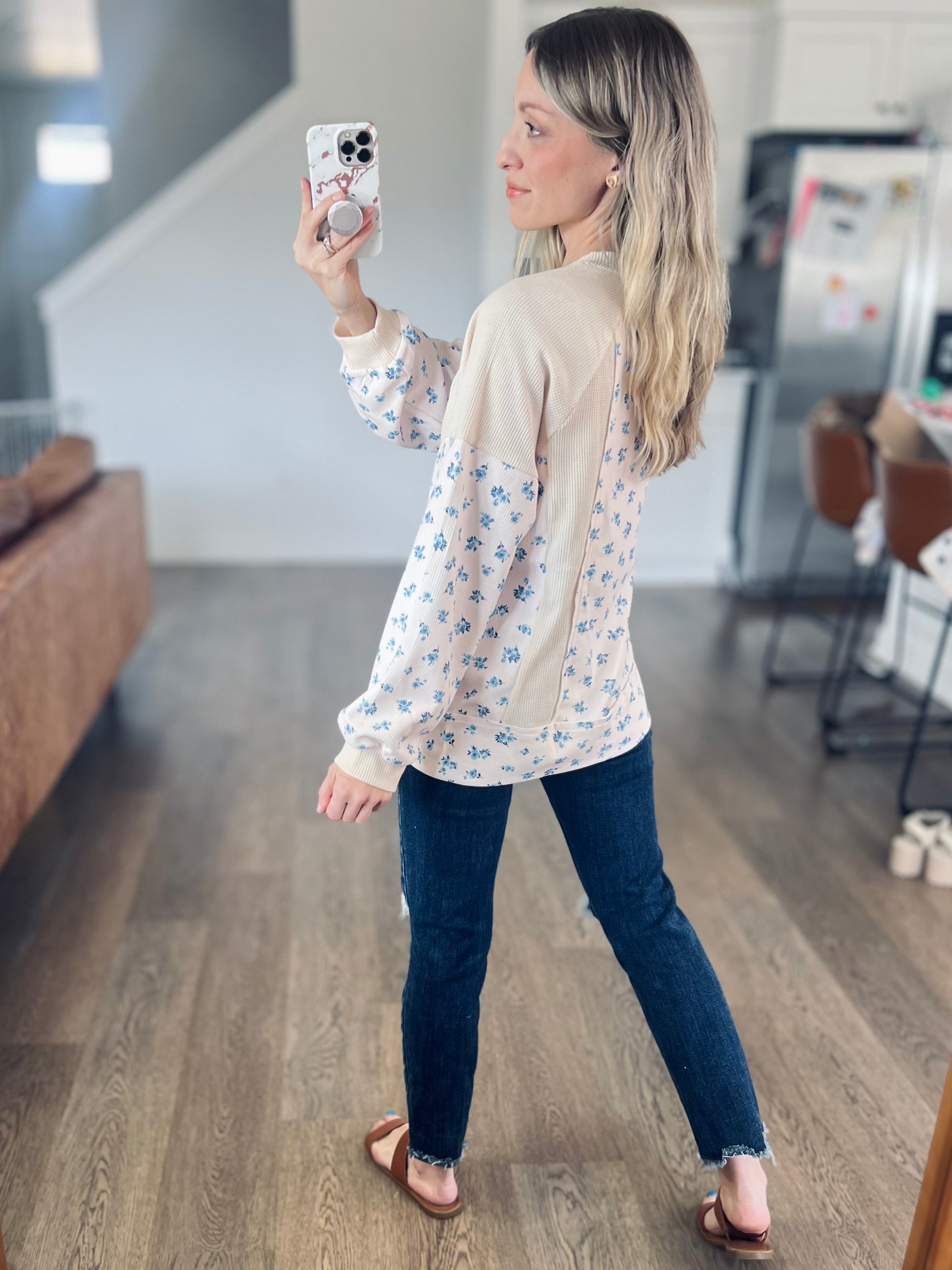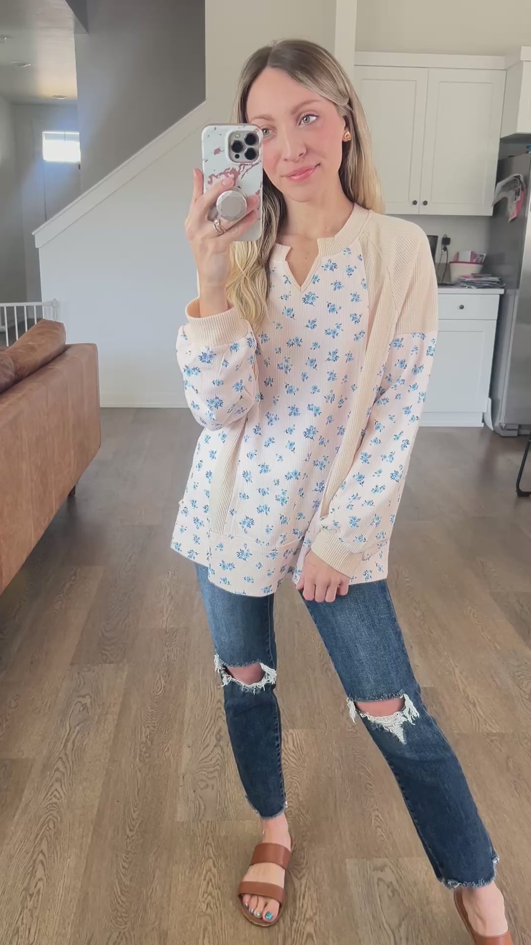 Featuring a sweet blue floral with colorblock style of a cream waffle knit. V front and relaxed fit. A perfect lightweight pullover option for spring/summer!