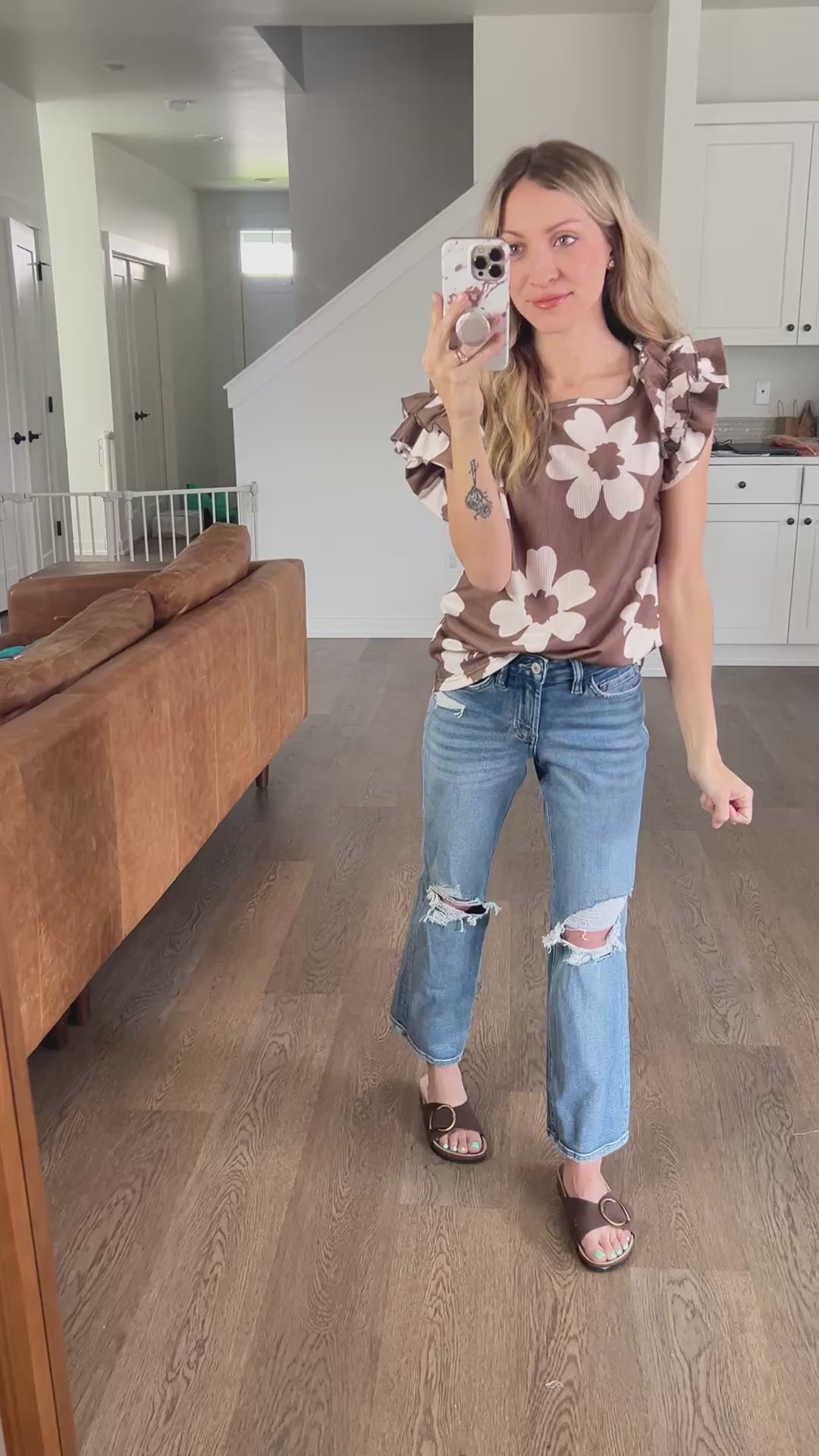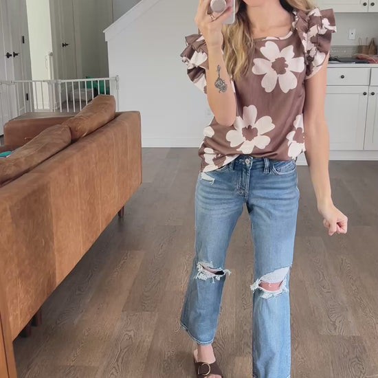 Fun, flirty, and happy! This floral top has sweet details to add a little something to your outfit. Featuring a rounded square neckline and ruffle sleeves to give it a feminine punch. Easy to dress up or down.