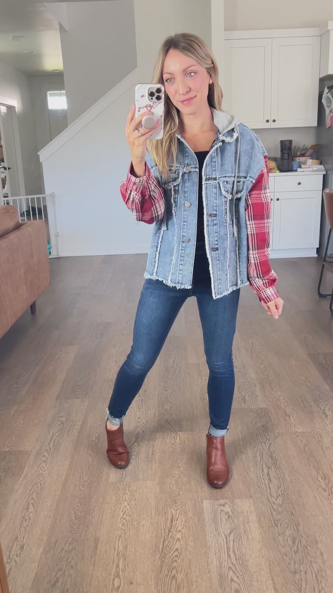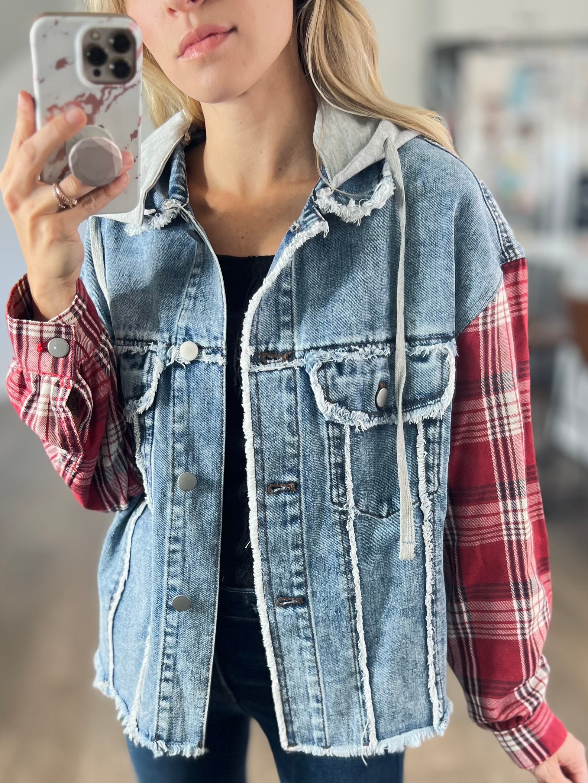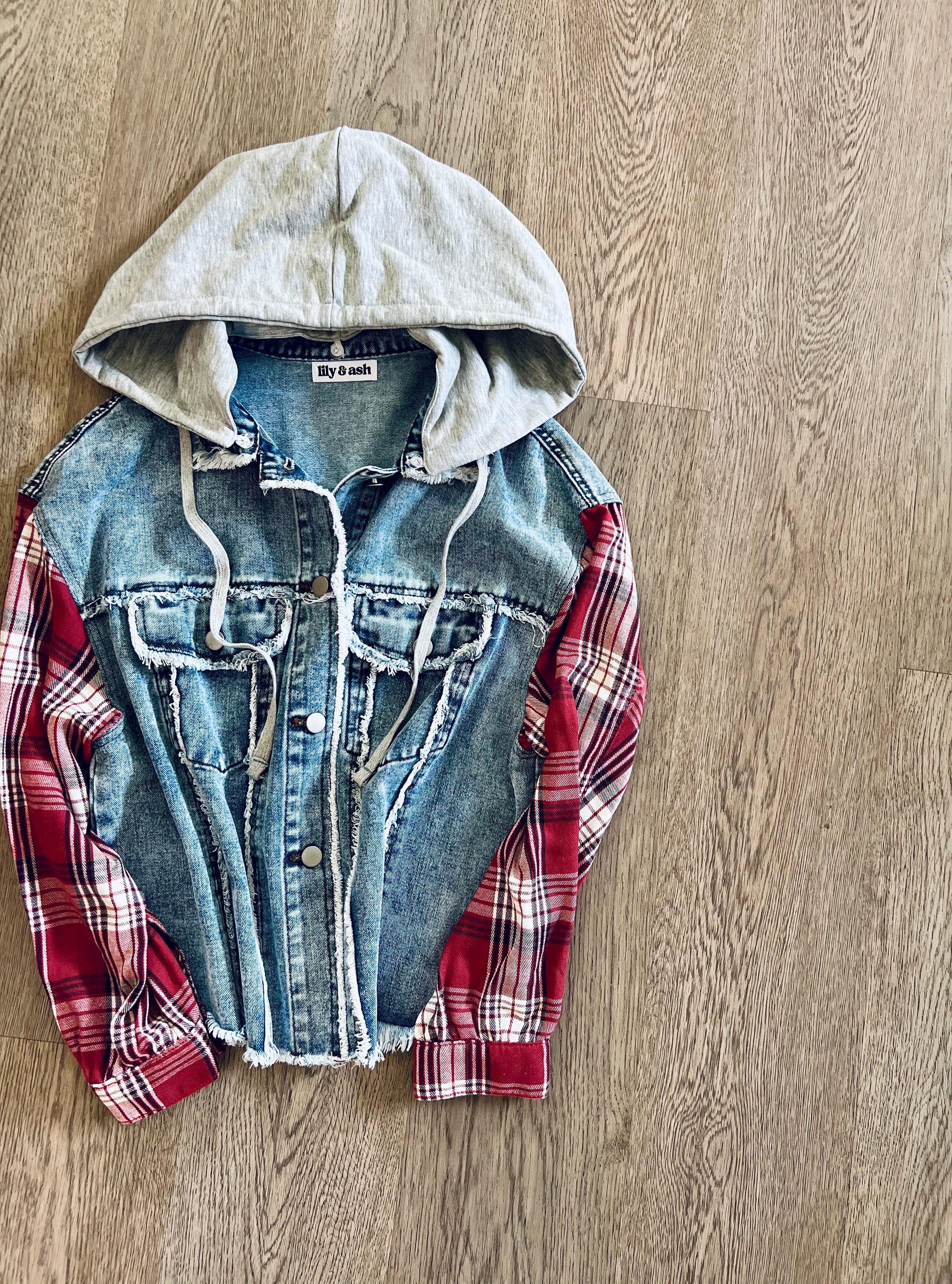 Gosh, it is cute! Amazing quality and a fun twist on a classic denim jacket. The sleeves are a soft plaid flannel, the body a classic denim with frayed seam detail, and a hood, that you can unbutton off if you choose!