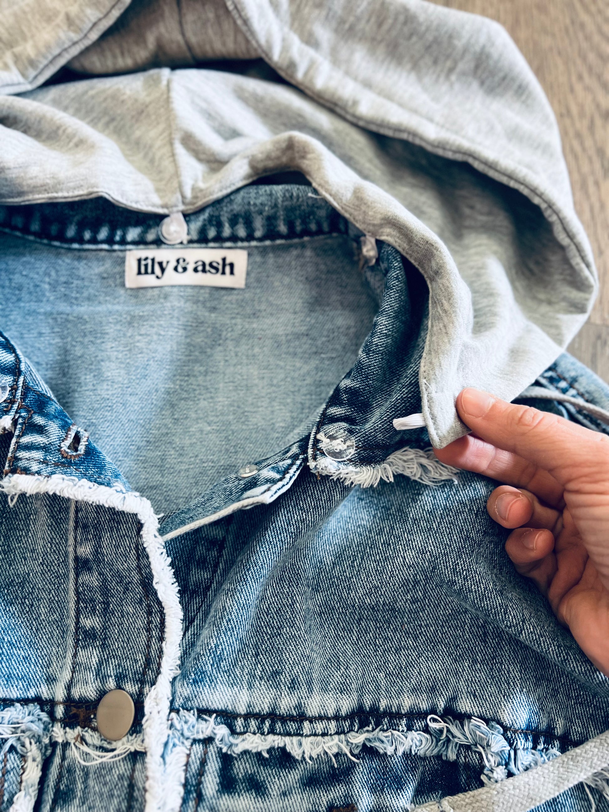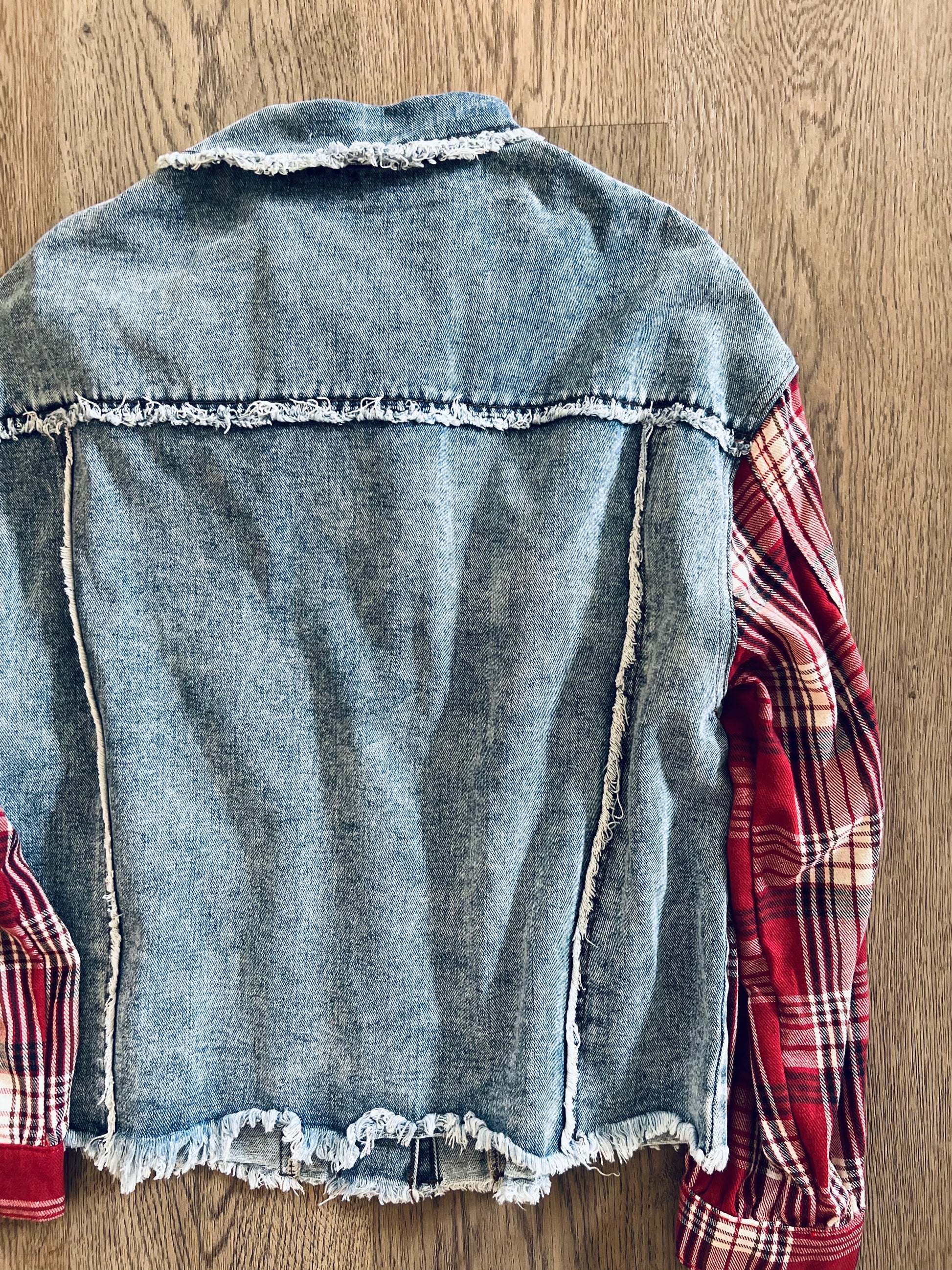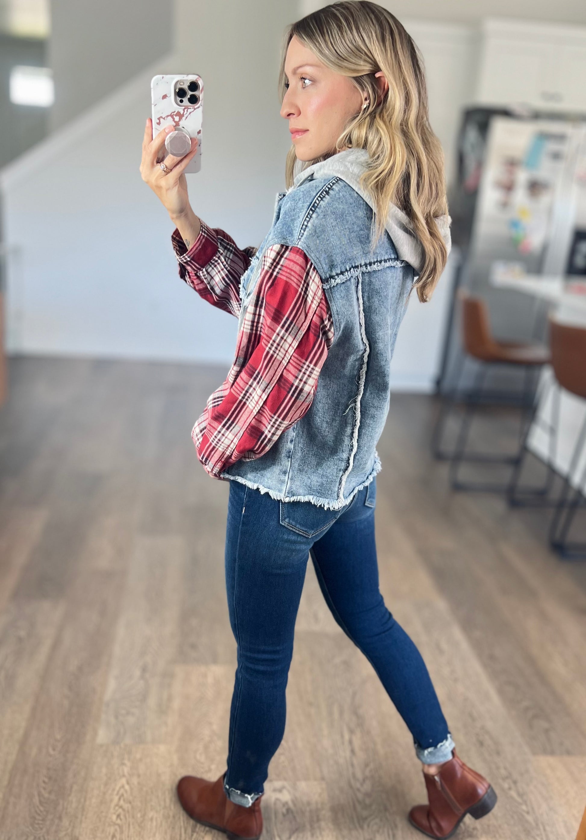 Gosh, it is cute! Amazing quality and a fun twist on a classic denim jacket. The sleeves are a soft plaid flannel, the body a classic denim with frayed seam detail, and a hood, that you can unbutton off if you choose!