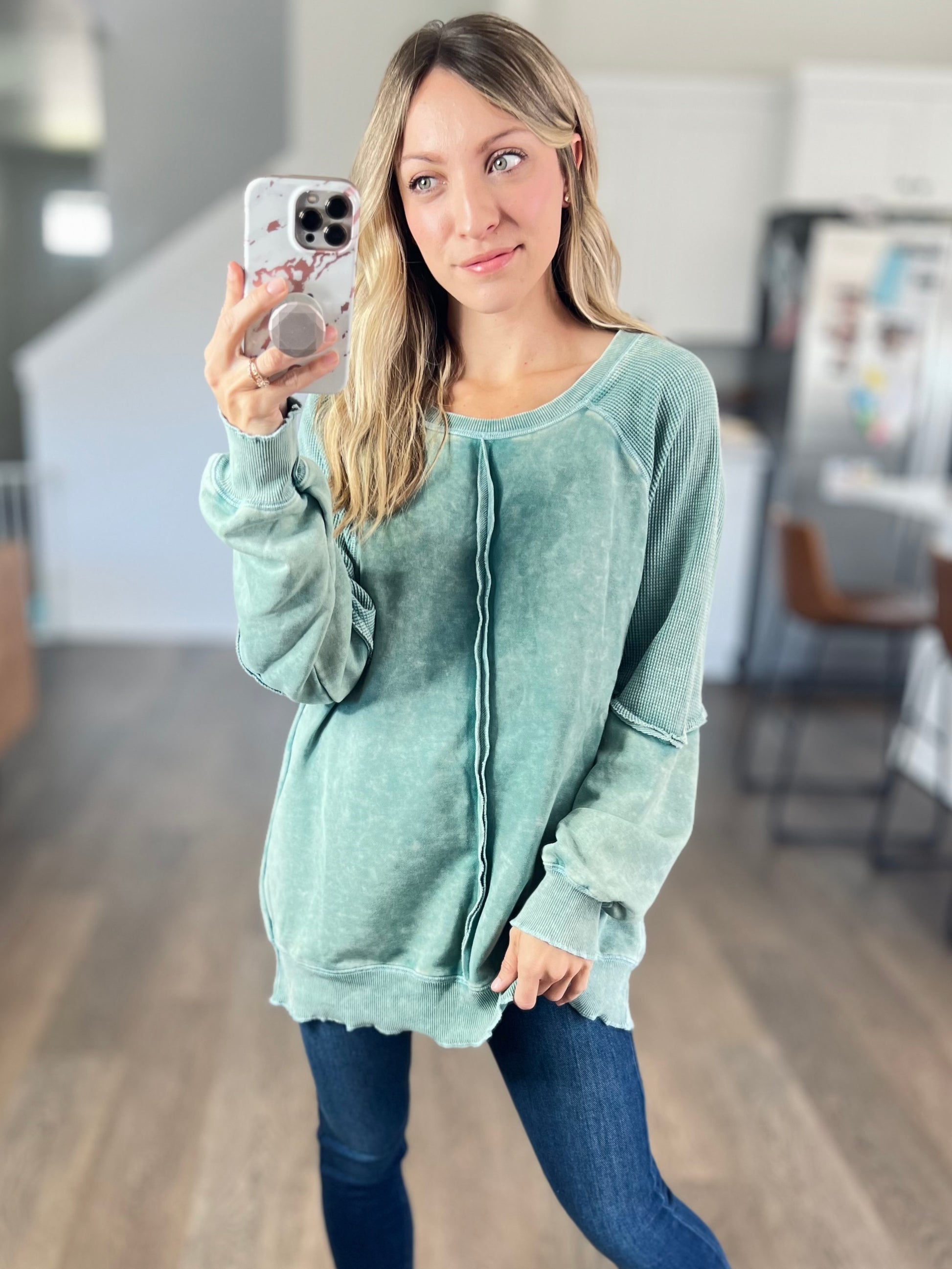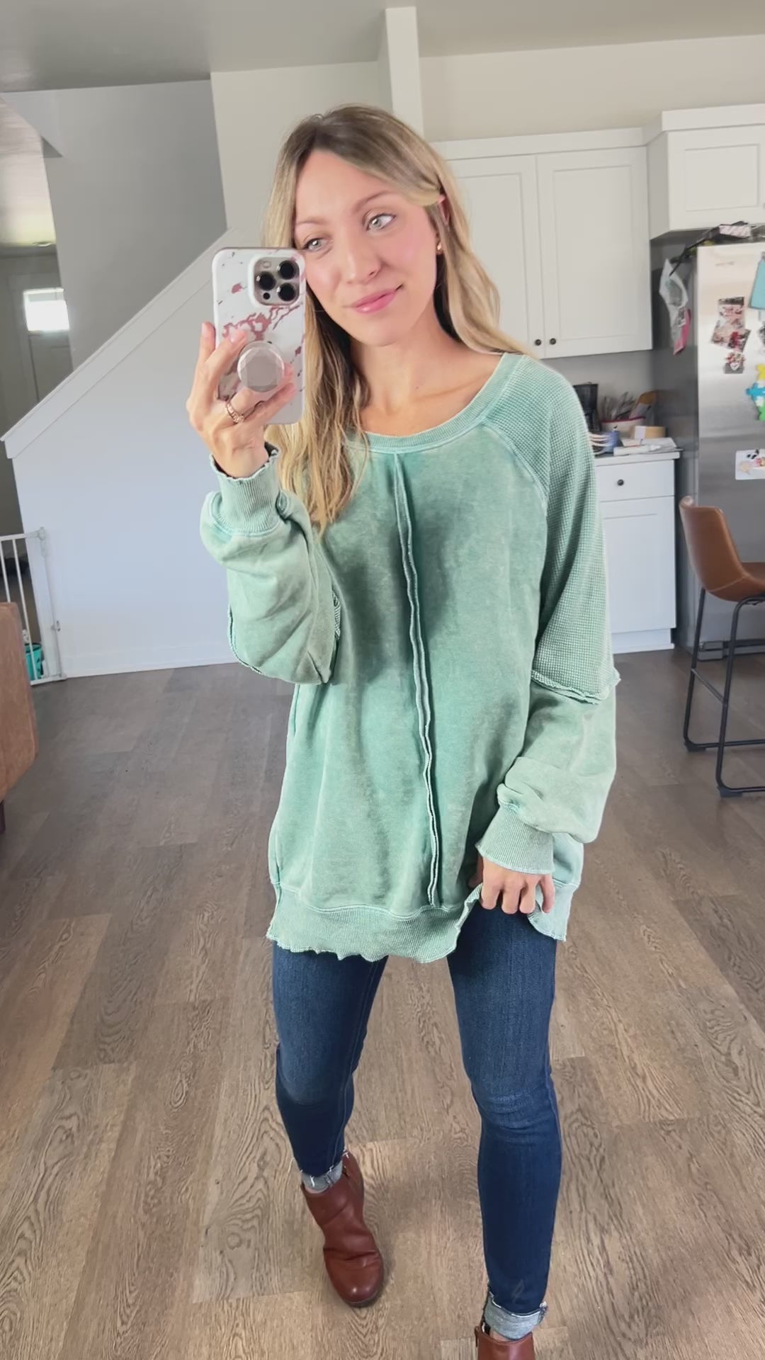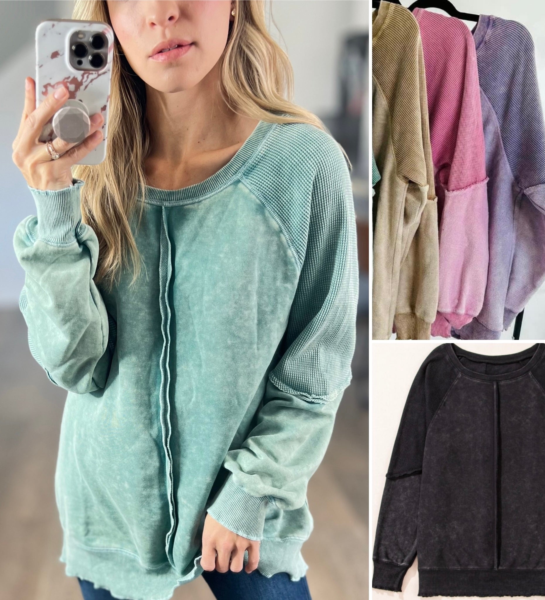 We are vintage/mineral lovers here and this pullover is going to be something you reach for time and time again! Its soft, medium weight, and has cool details that make it more than your average top! Thermal knit on the shoulders with exposed seams. Great length that works if you want to lounge in leggings too!