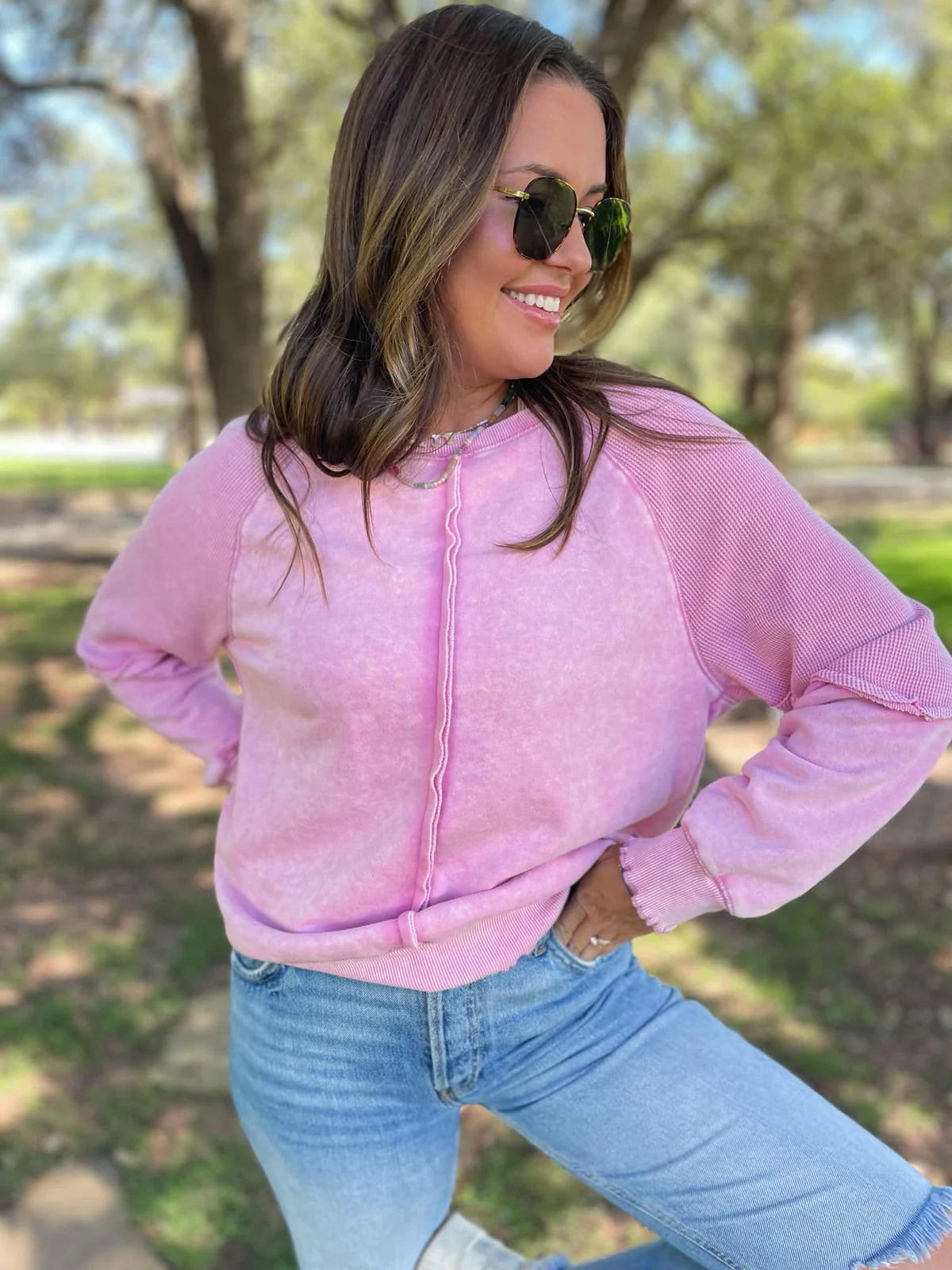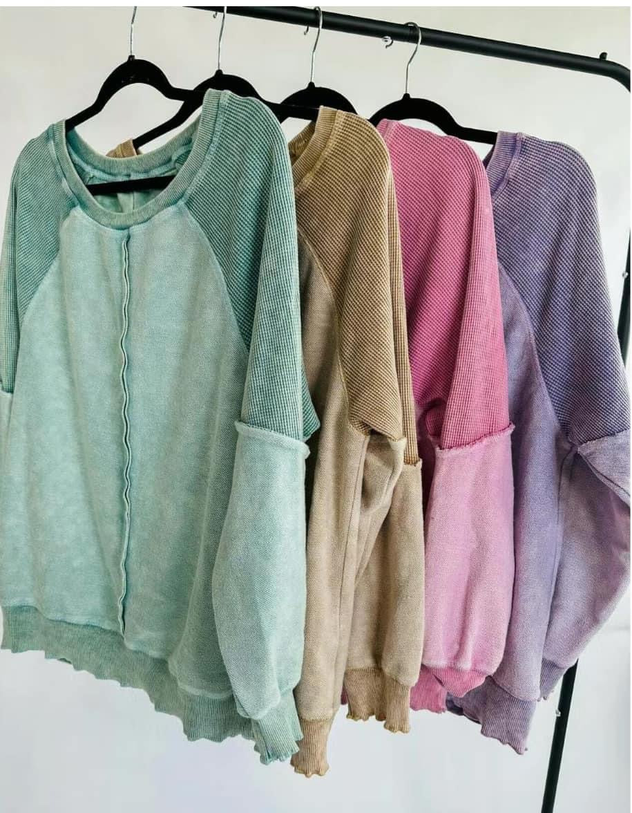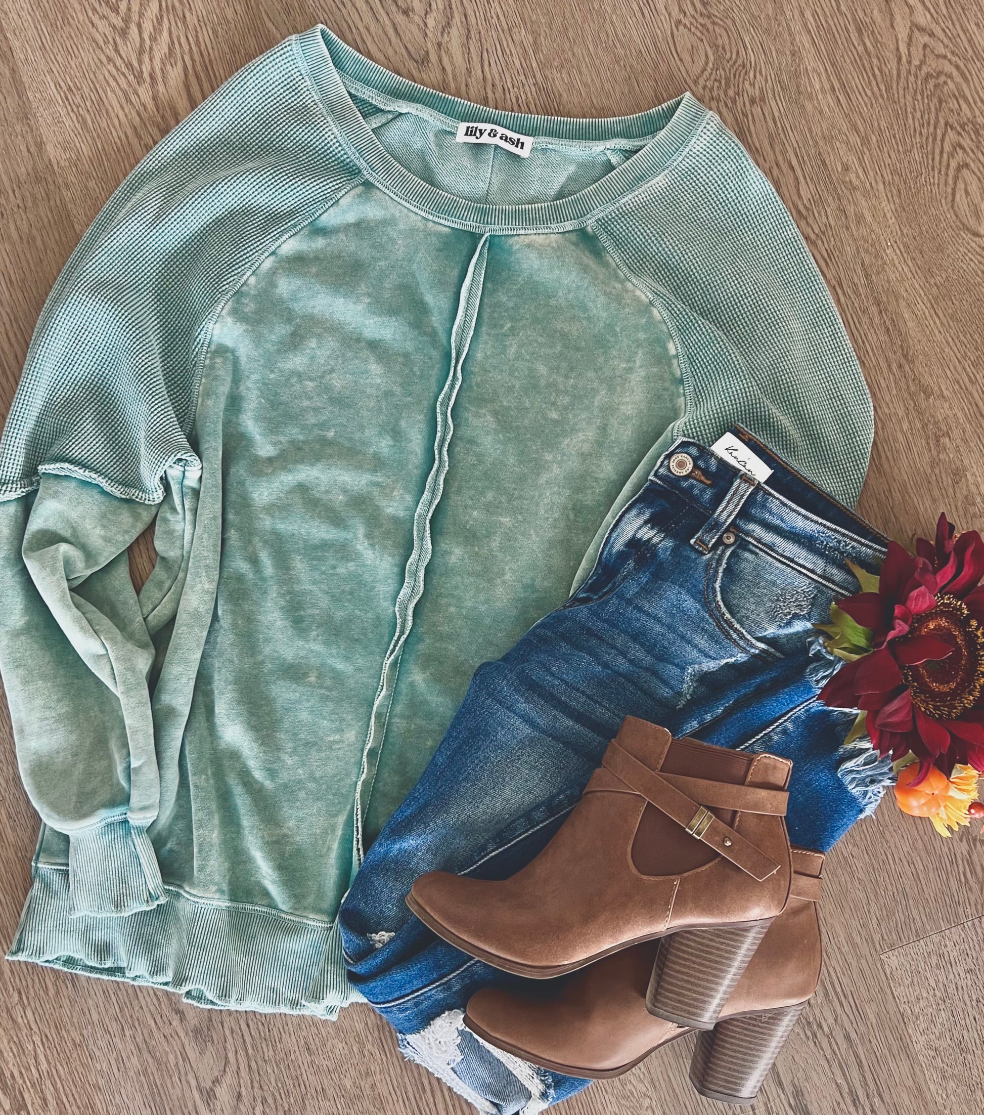 We are vintage/mineral lovers here and this pullover is going to be something you reach for time and time again! Its soft, medium weight, and has cool details that make it more than your average top! Thermal knit on the shoulders with exposed seams. Great length that works if you want to lounge in leggings too!