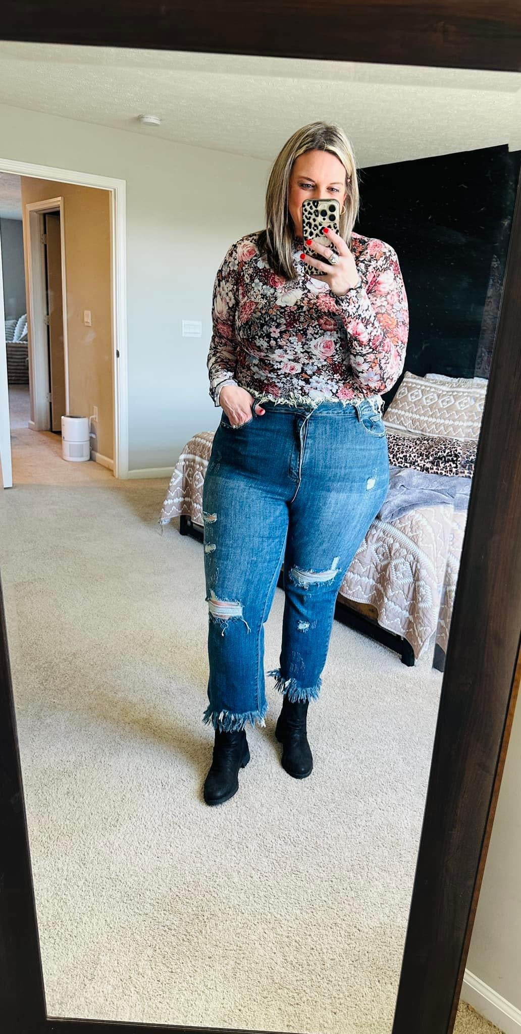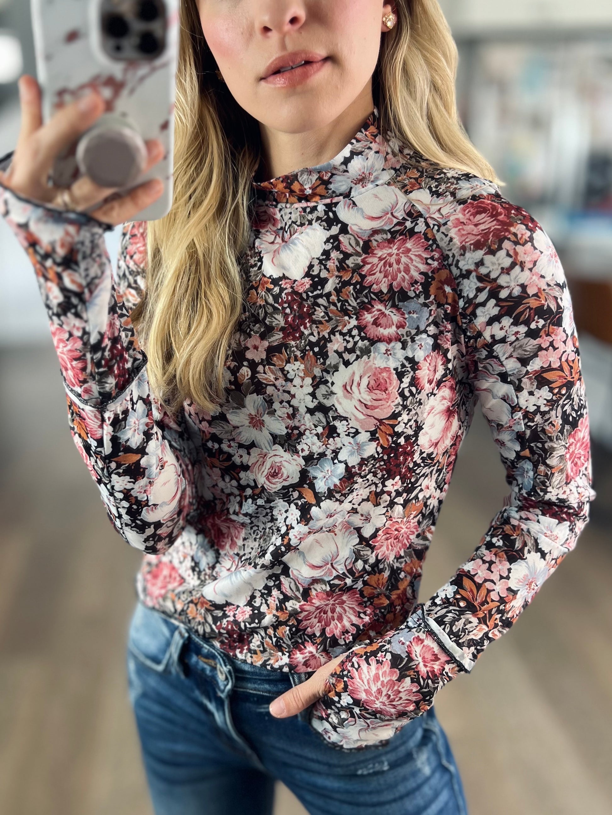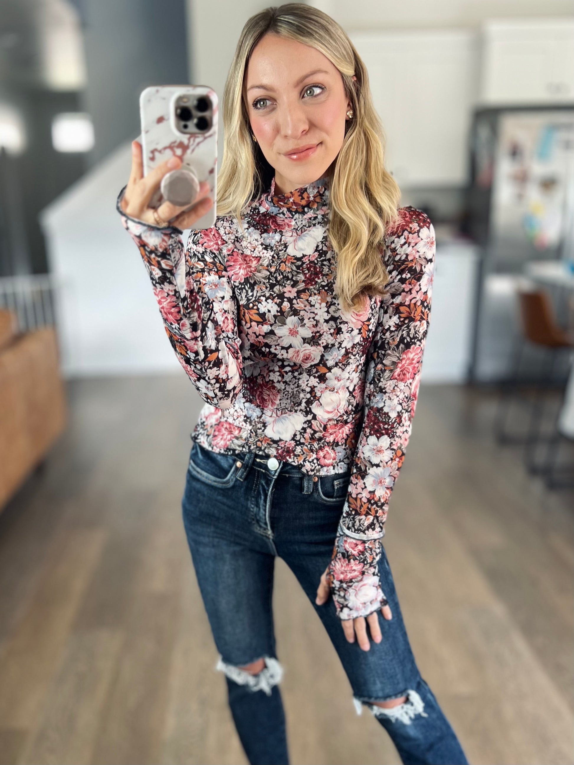 Quite possibly the prettiest floral we have ever had! To make it even better, it also has thumbholes! Wear it alone, under a romper, under a graphic tee, or under a cardi. It really is so versatile. It is the perfect length with high rise denim!
