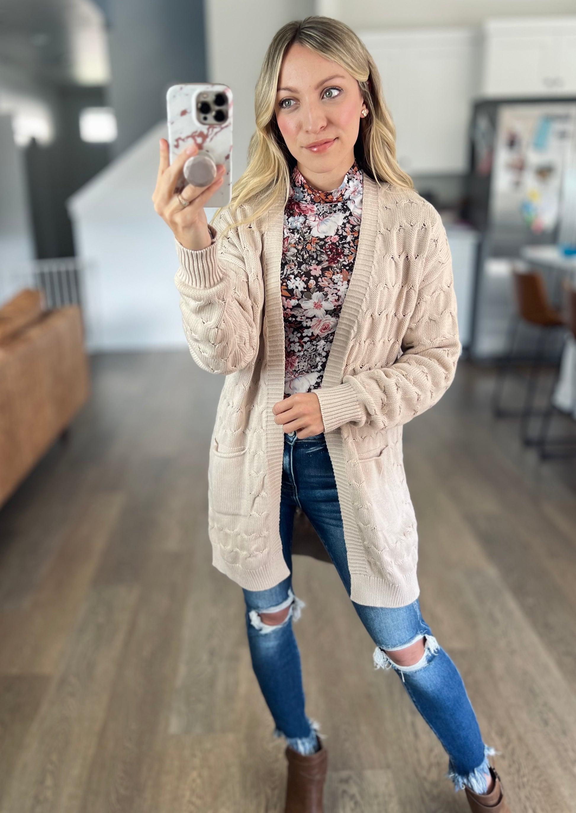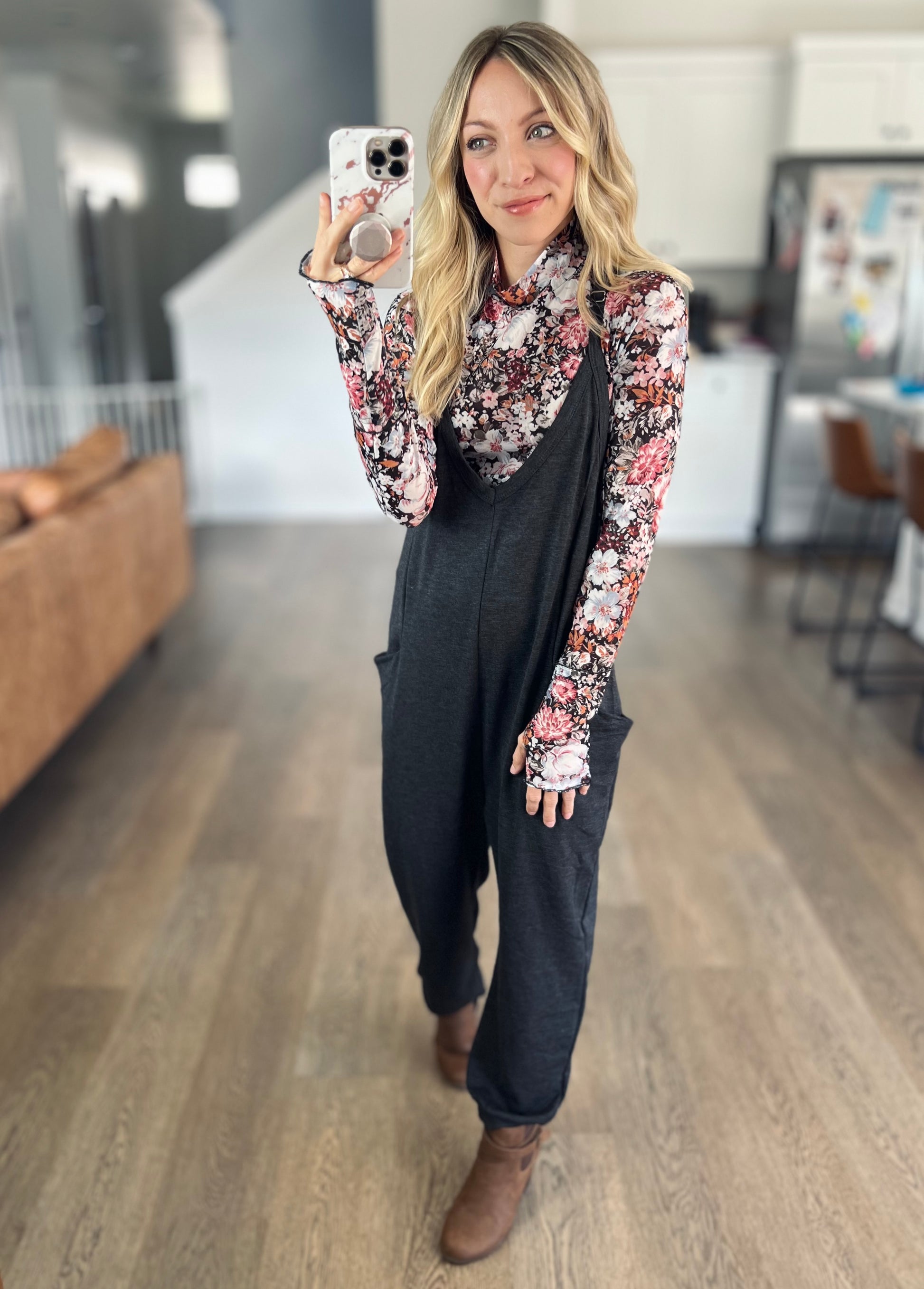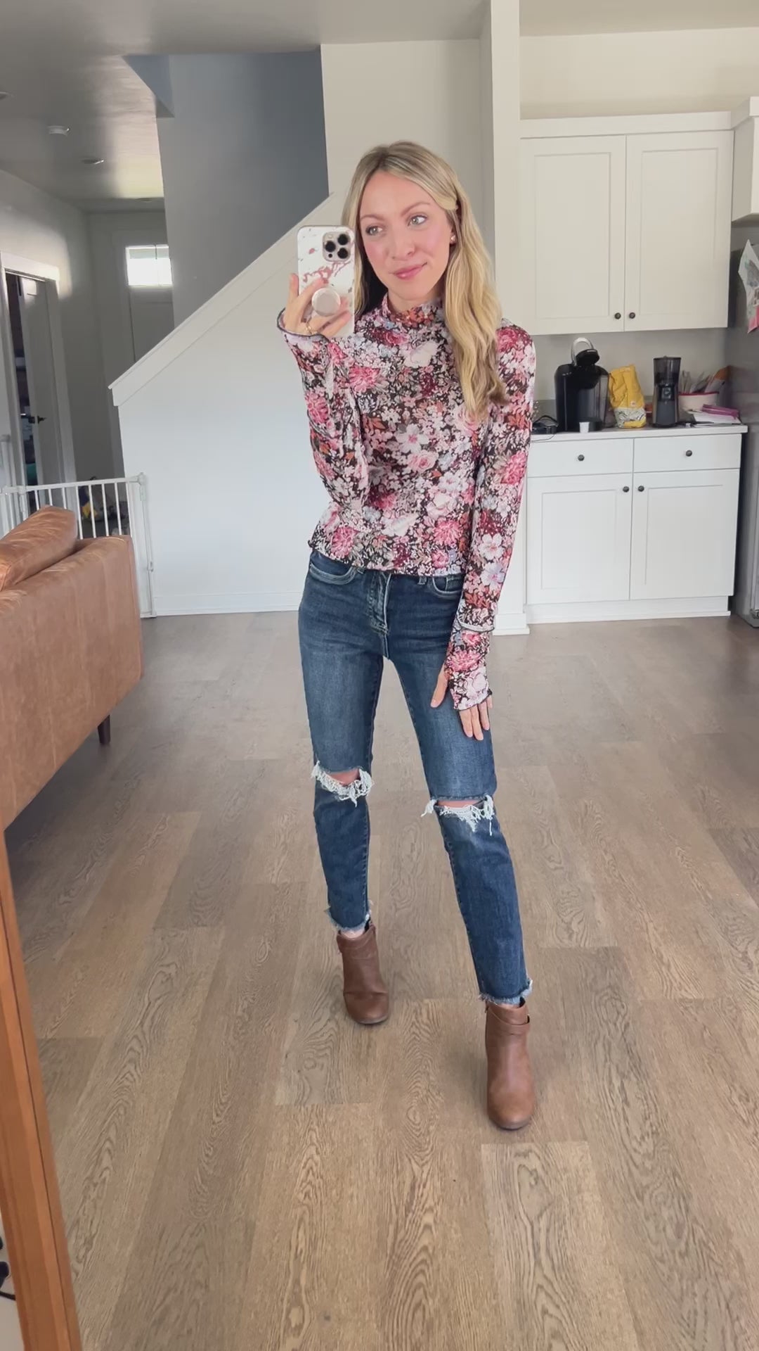 Quite possibly the prettiest floral we have ever had! To make it even better, it also has thumbholes! Wear it alone, under a romper, under a graphic tee, or under a cardi. It really is so versatile. It is the perfect length with high rise denim!