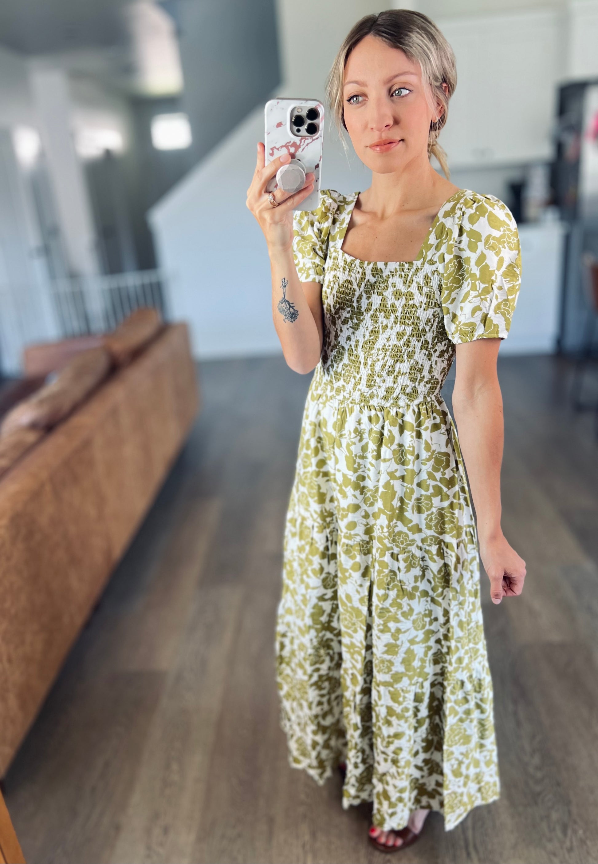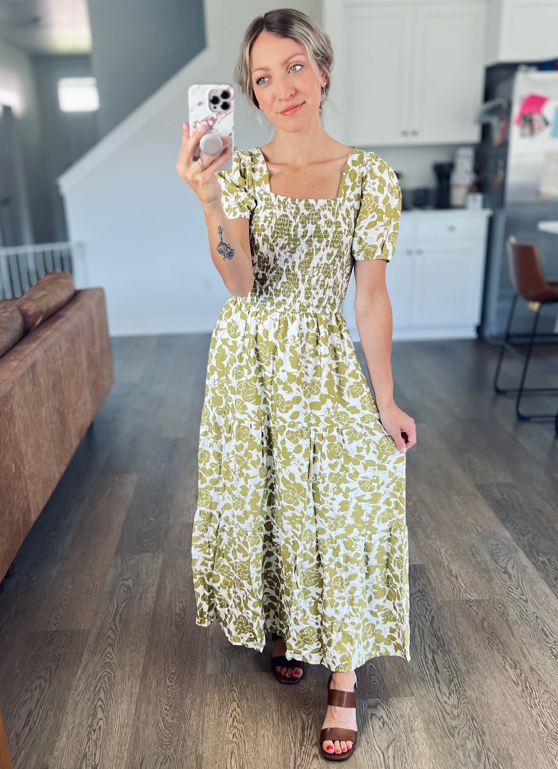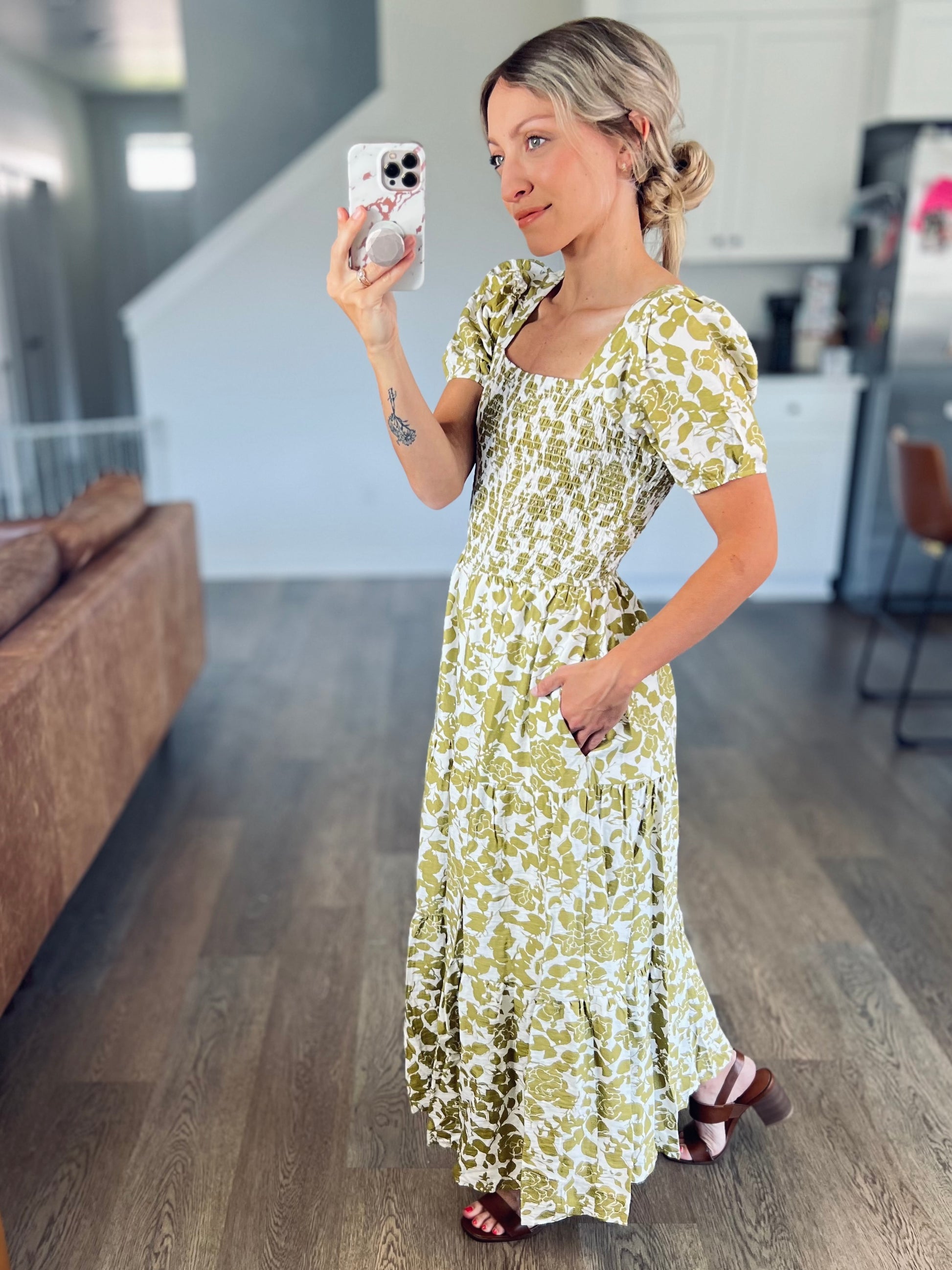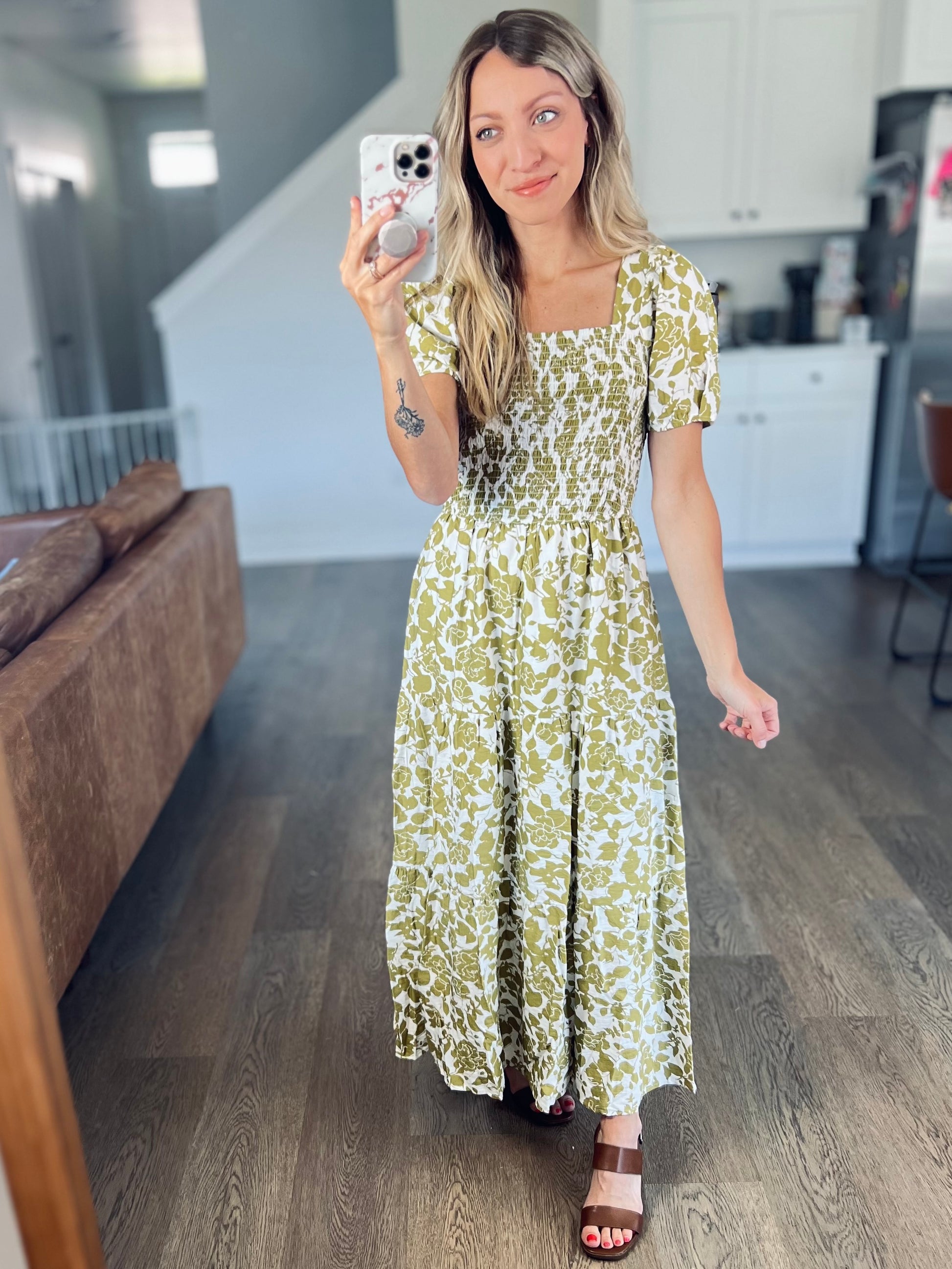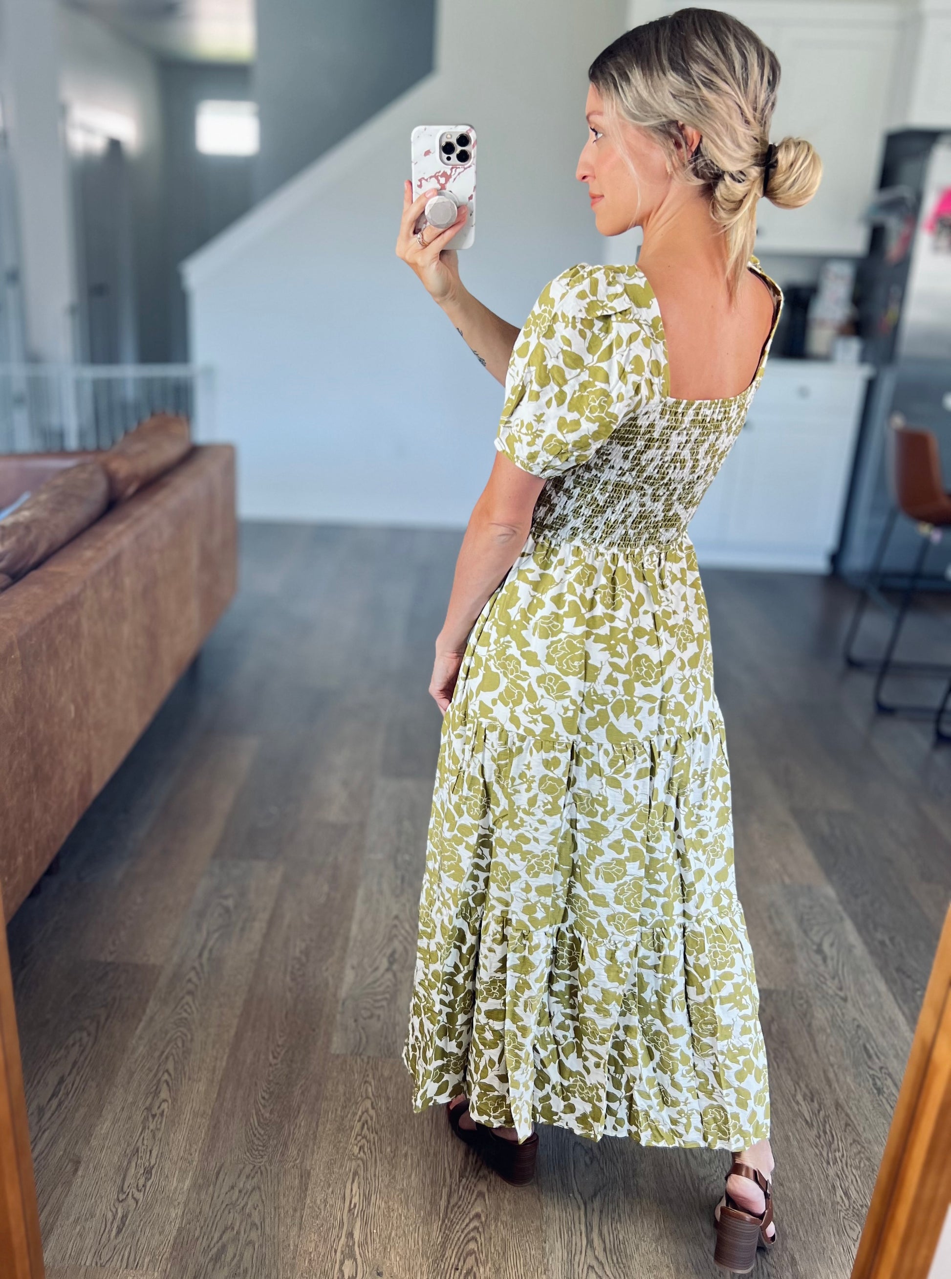This dress is stunning! I loved the square neckline and the smocked detail. The bust area is elastic so it has give but also is a flattering fit. This dress is a great option as we transition to fall. It would be perfect for fall family photos too!
