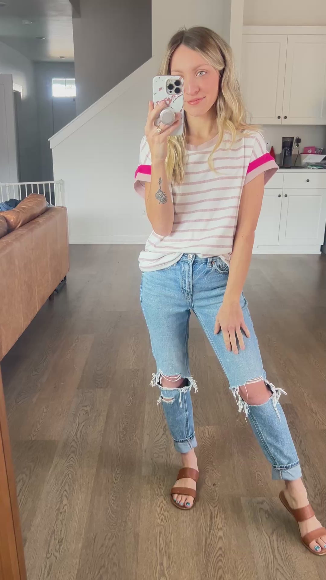 A cute take on a classic. Neutral stripe with pop f pink on the sleeves! Lightweight, skinny rin material & soft!