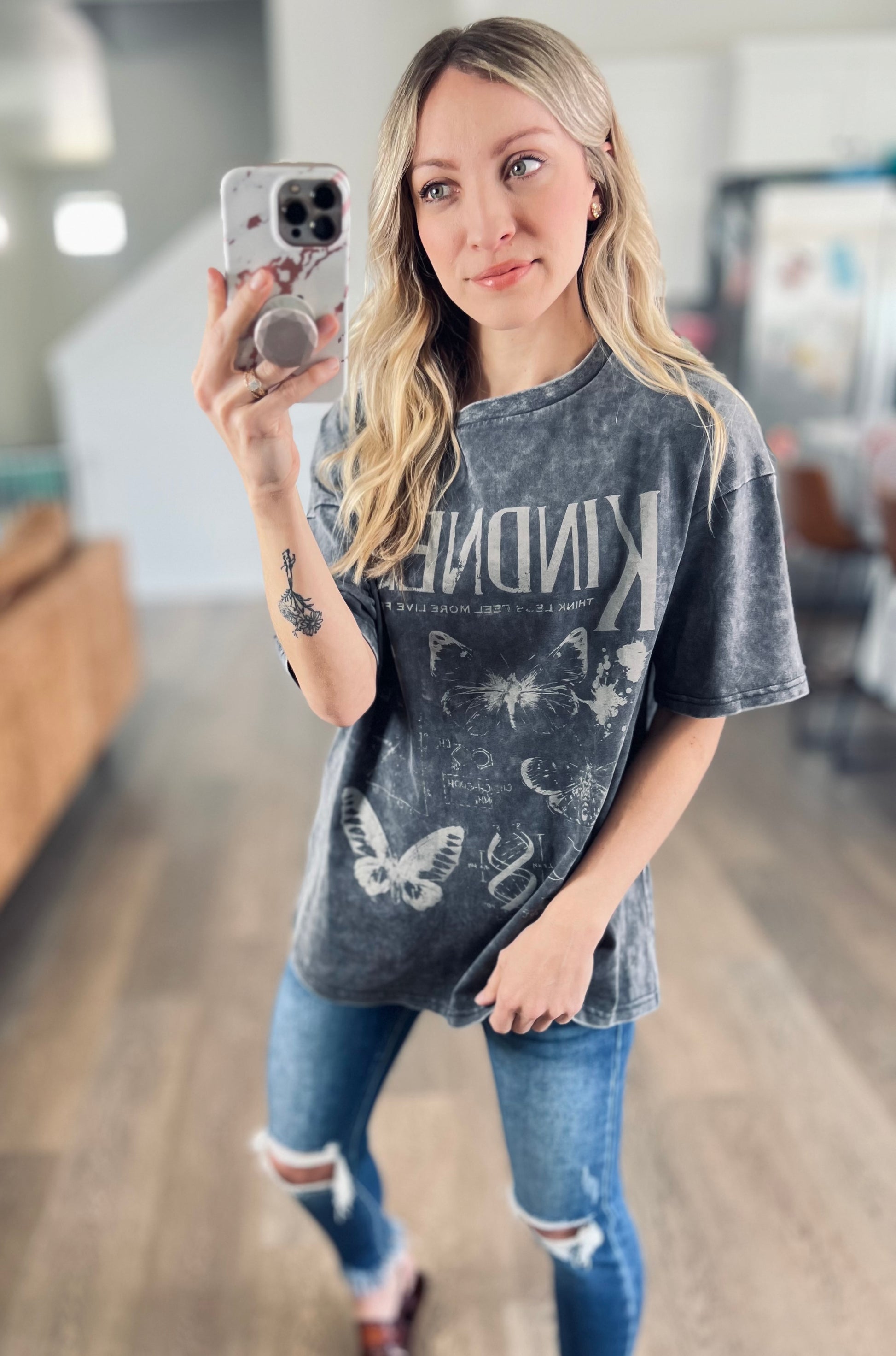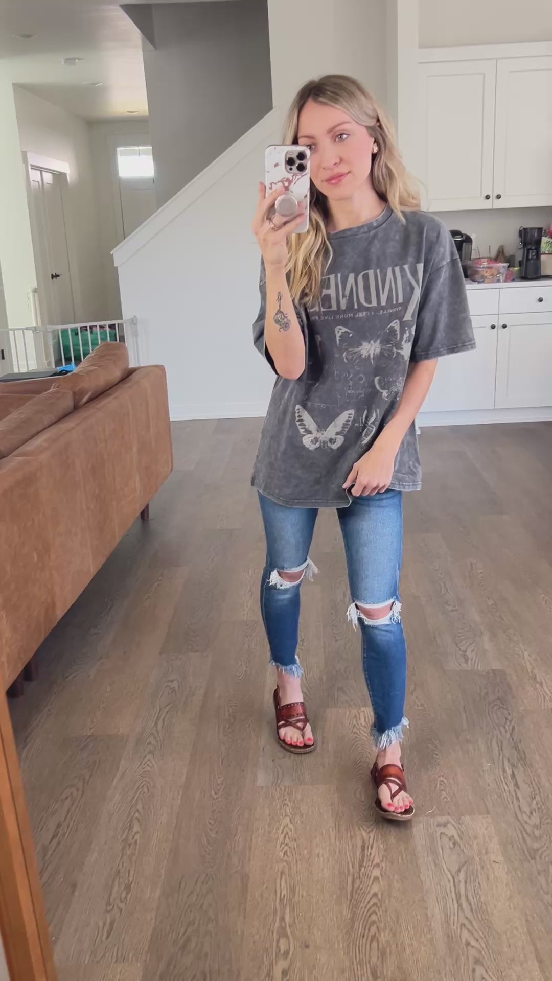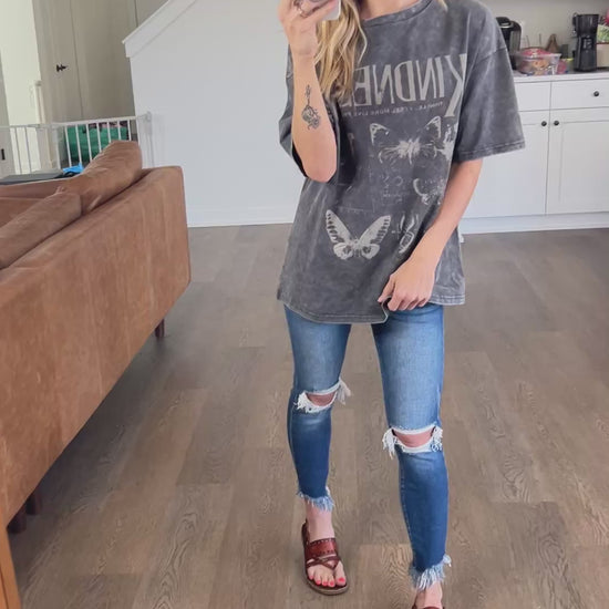 Vintage style graphic with a slight relaxed fit. I love the butterflies and the easy to wear style. This would be cute with biker shorts too!