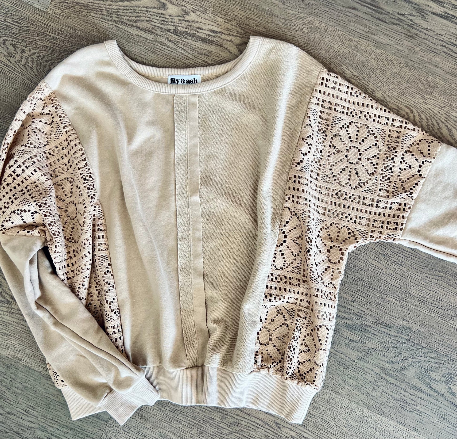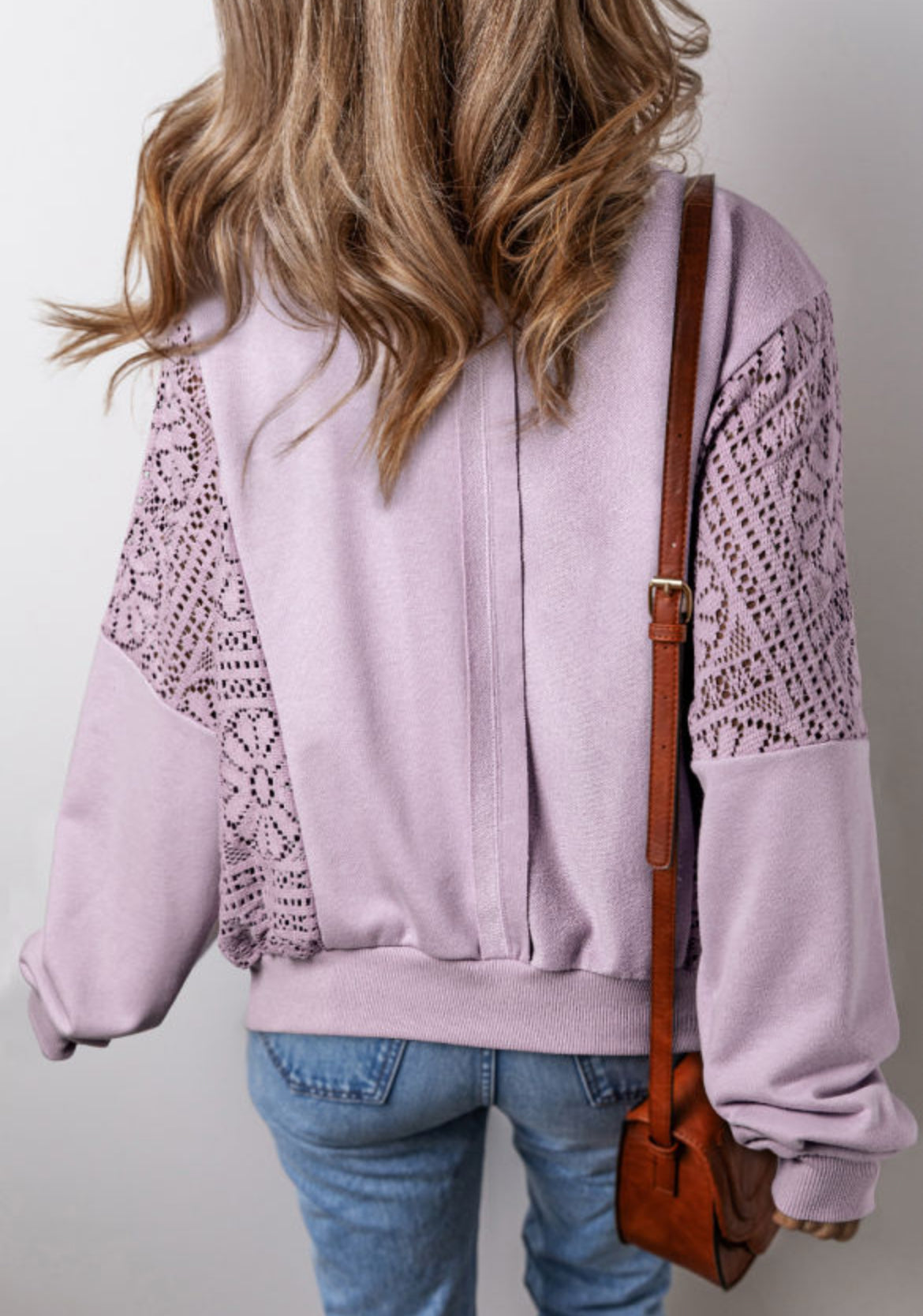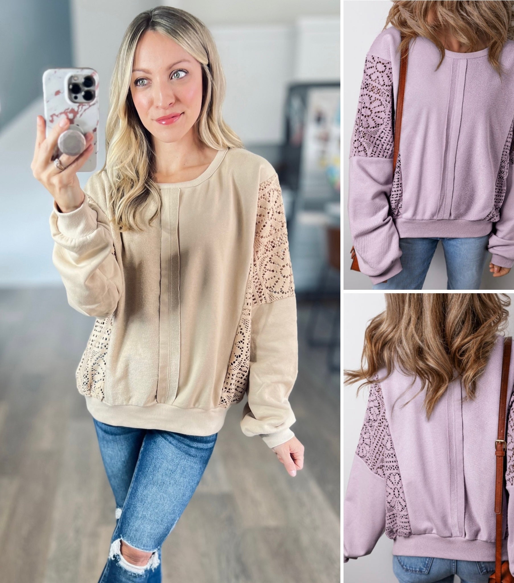 This pullover is the perfect mix of comfort with feminine details. It is a soft french terry material with lace on the sleeves. It's a relaxed dolman fit so it is really comfy to wear (but also looks polished and cute)!