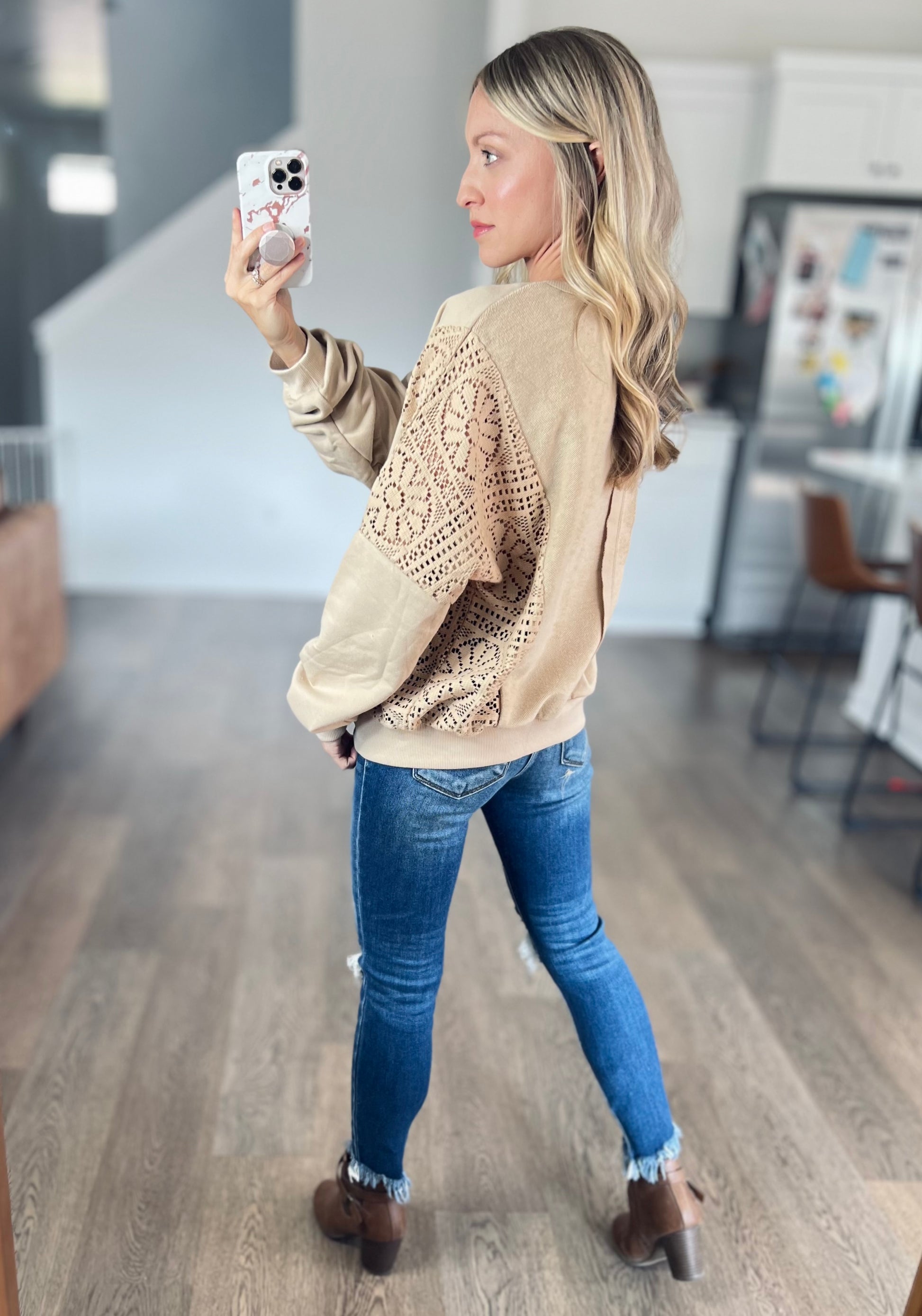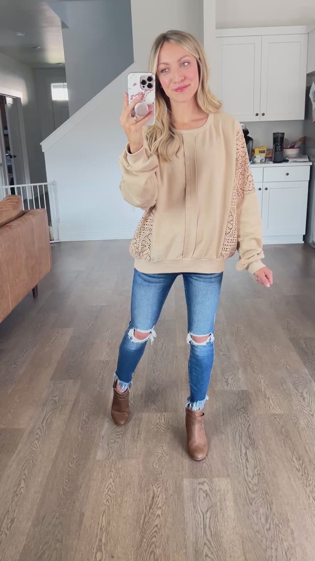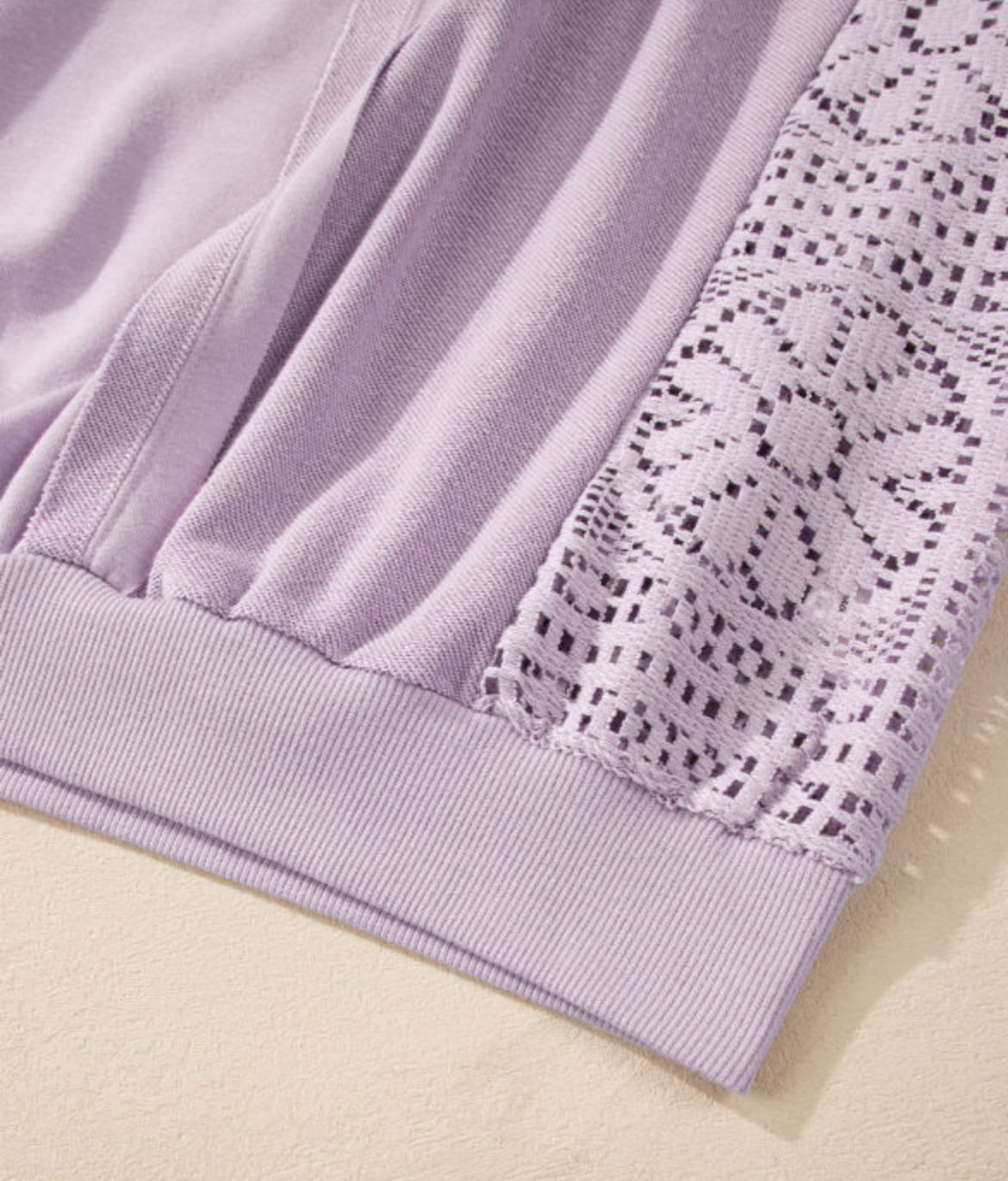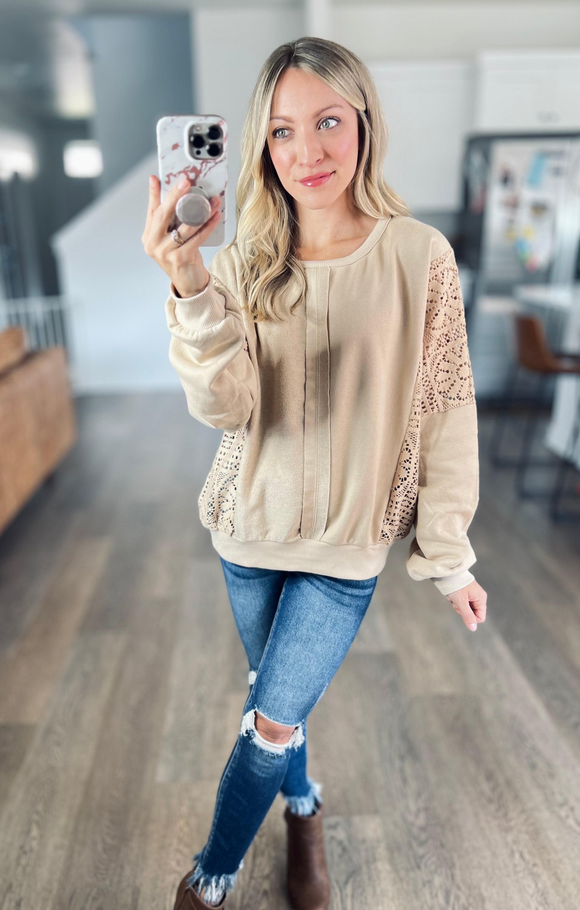 This pullover is the perfect mix of comfort with feminine details. It is a soft french terry material with lace on the sleeves. It's a relaxed dolman fit so it is really comfy to wear (but also looks polished and cute)!