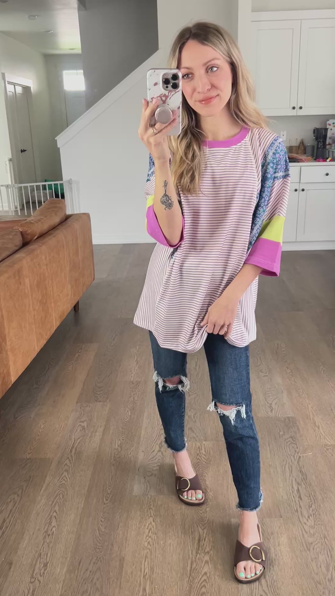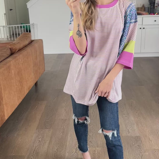Featuring fine stripes, floral panels, and bold sleeve accents in lime and fuchsia, this relaxed-fit top blends comfort with standout style. Finished with a crew neck and soft cotton blend fabric—perfect for laid-back days!