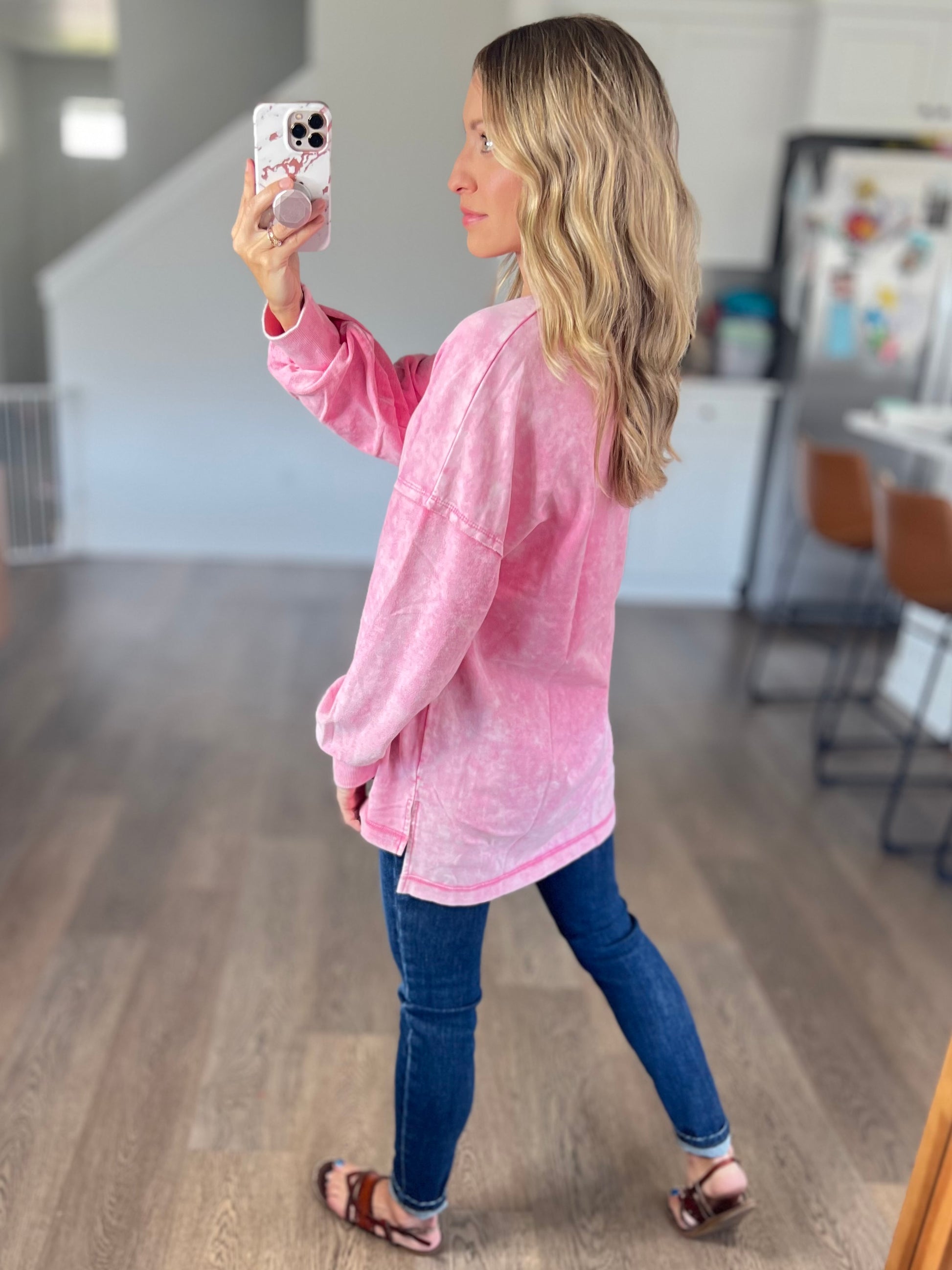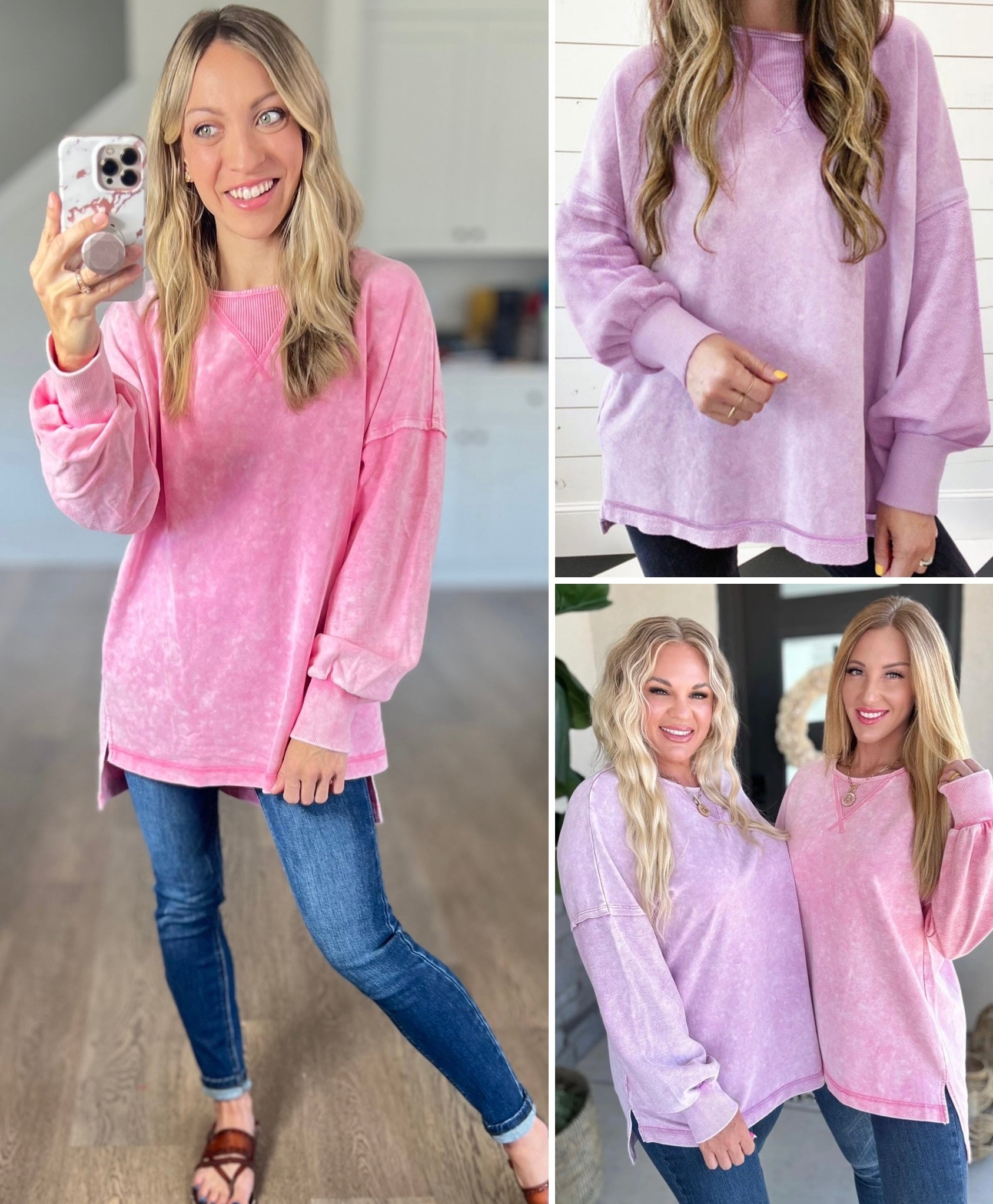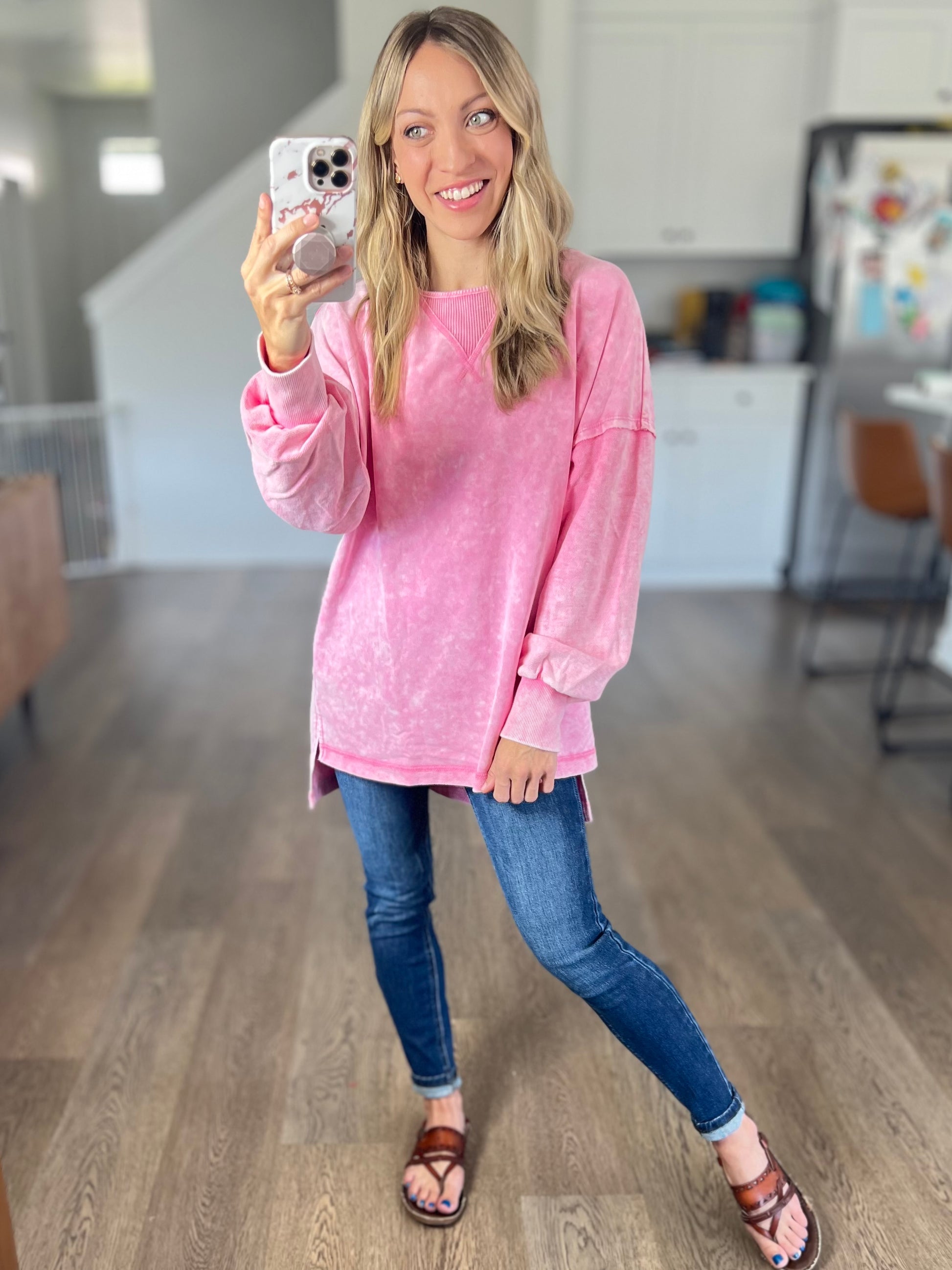 Made from soft french terry with a trendy mineral wash, this oversized pullover features drop shoulders, exposed seams, and a high-low hem. Available in two amazing colors, it pairs perfectly with bikers or leggings too! I love the v detail in the front.
