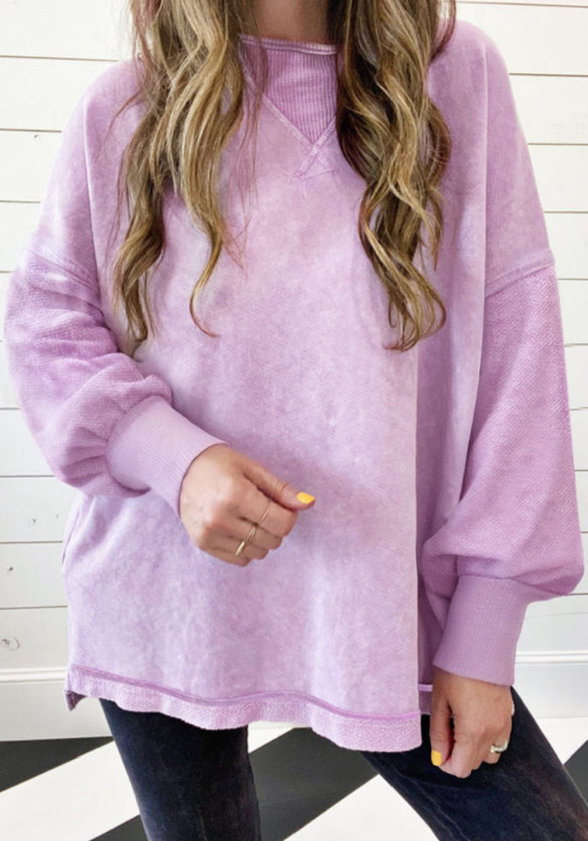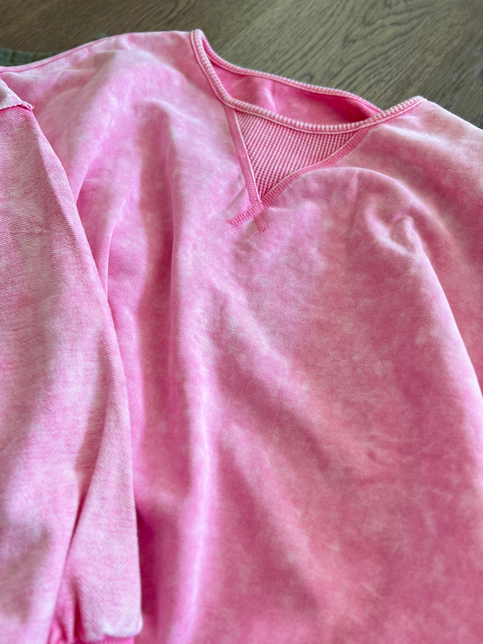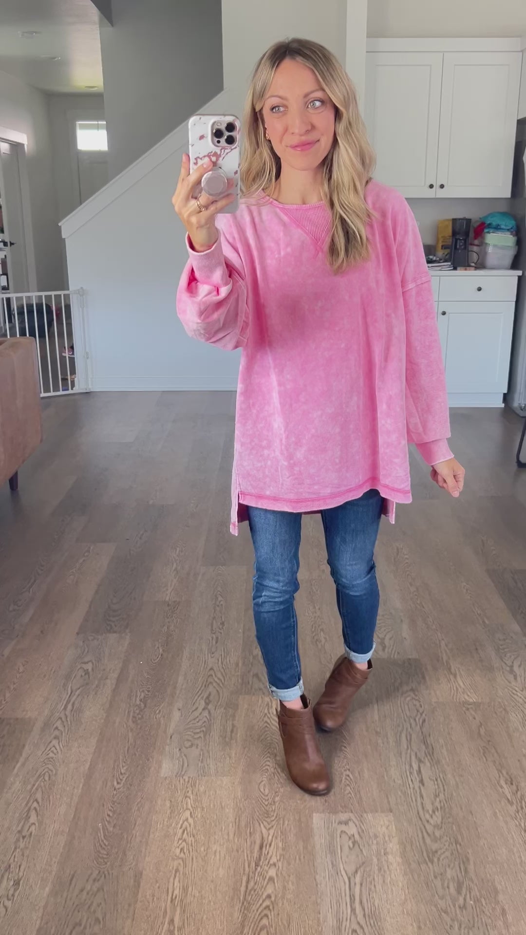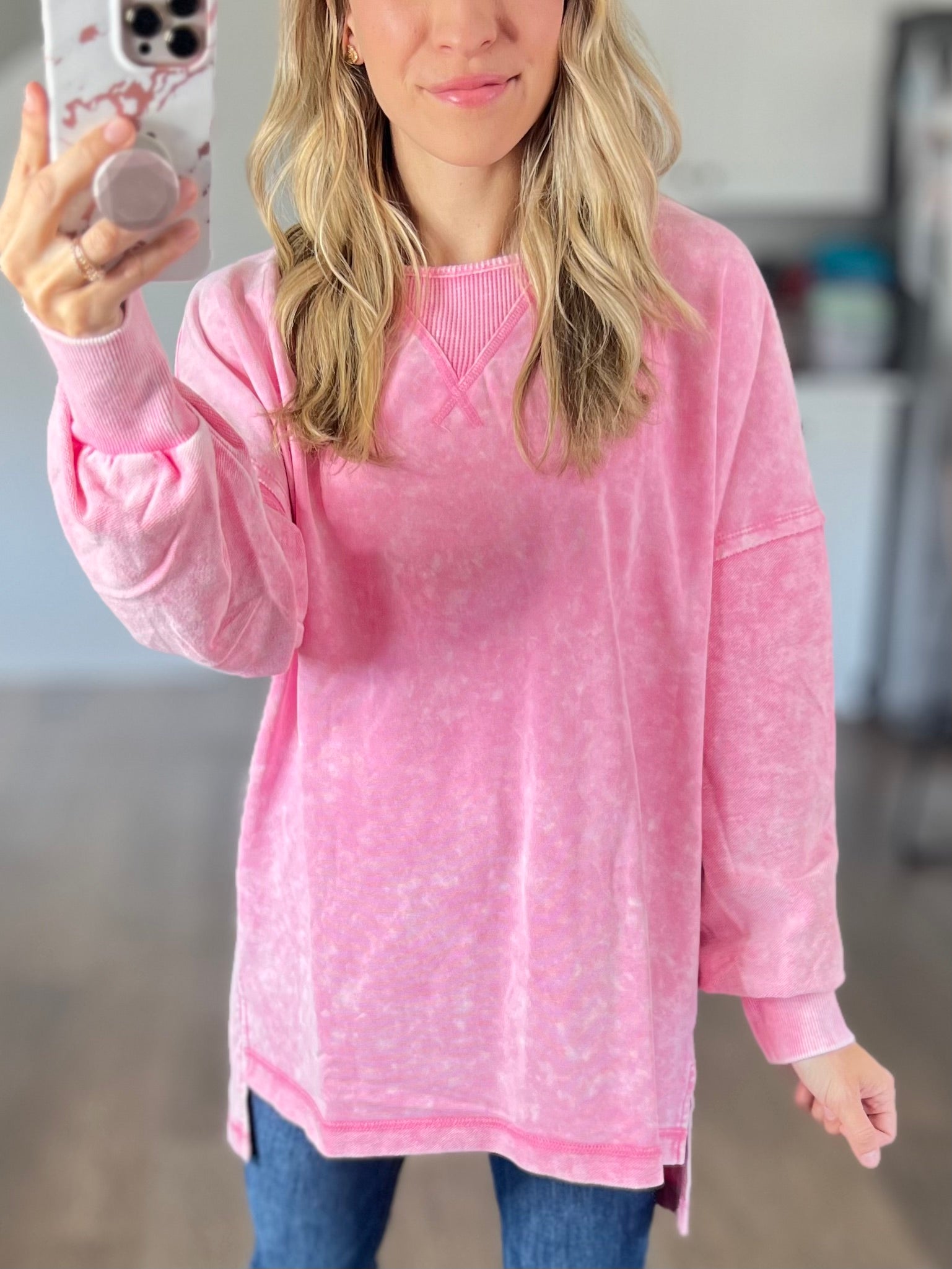 Made from soft french terry with a trendy mineral wash, this oversized pullover features drop shoulders, exposed seams, and a high-low hem. Available in two amazing colors, it pairs perfectly with bikers or leggings too! I love the v detail in the front.