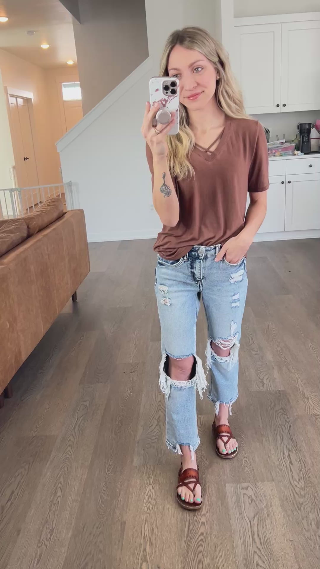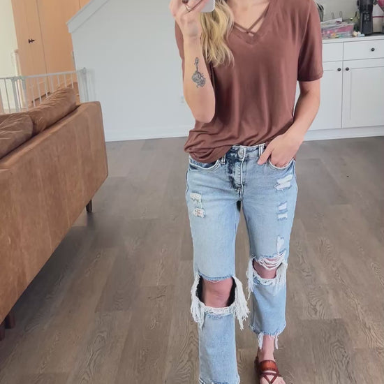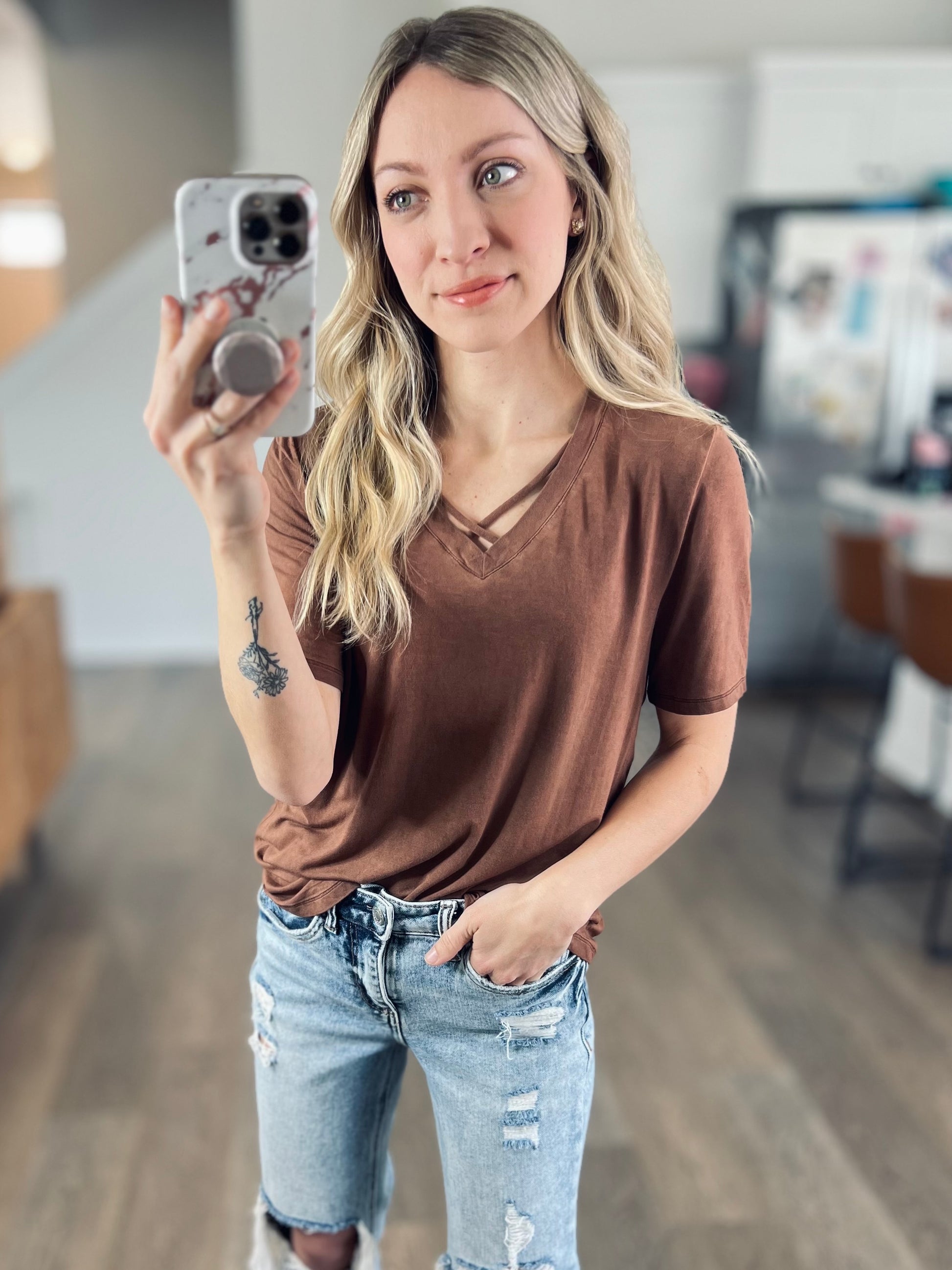 A vintage vibe with a modern twist. This elevated basic is both comfortable and cute! Featuring a soft vintage style jersey material with v neck, Something perfect for every day.