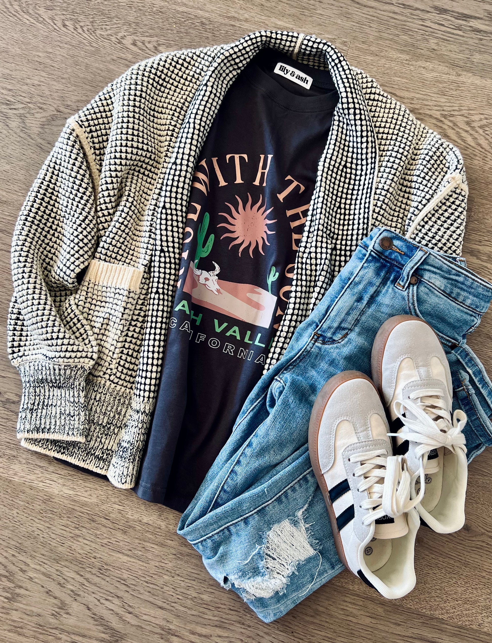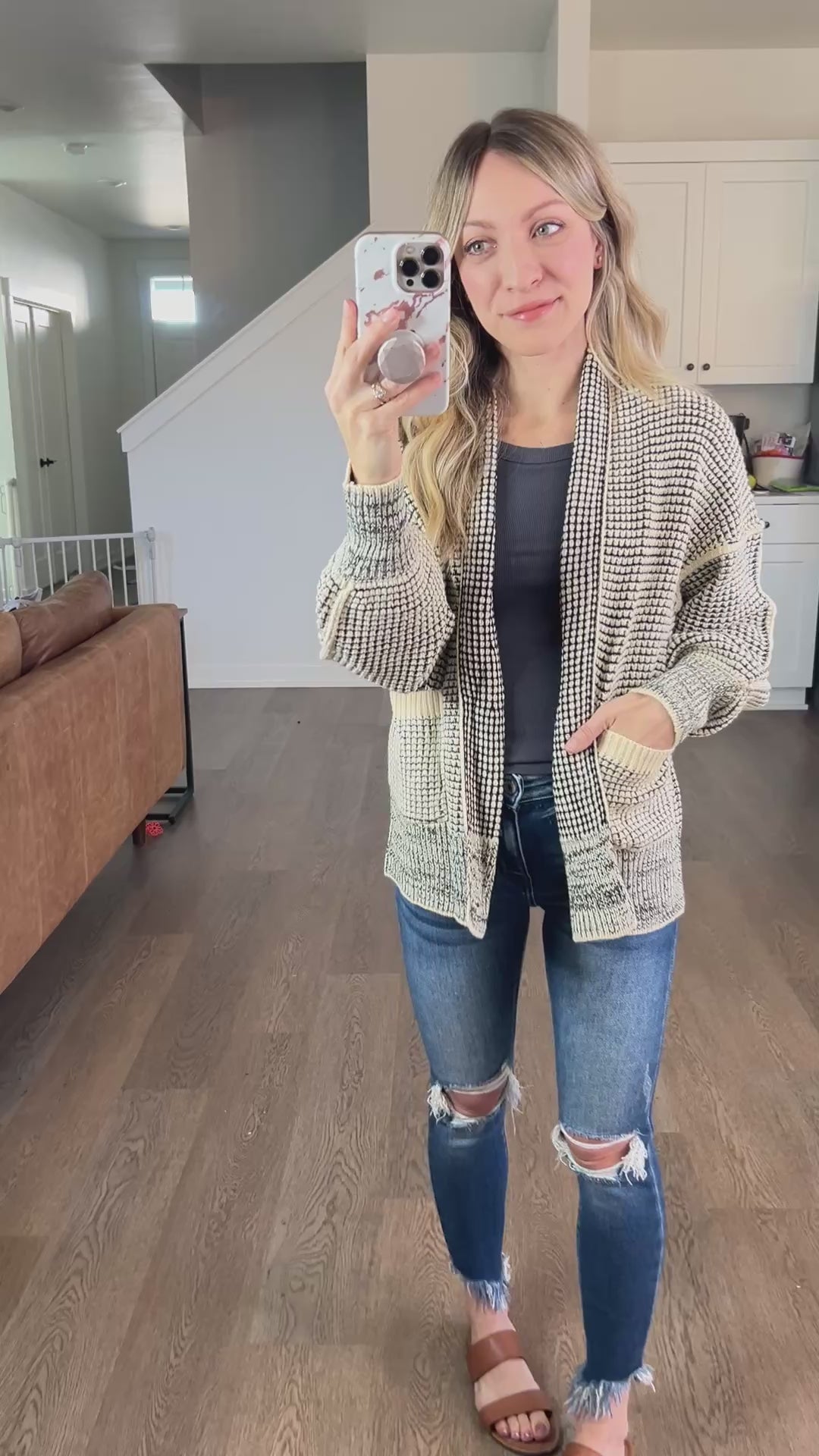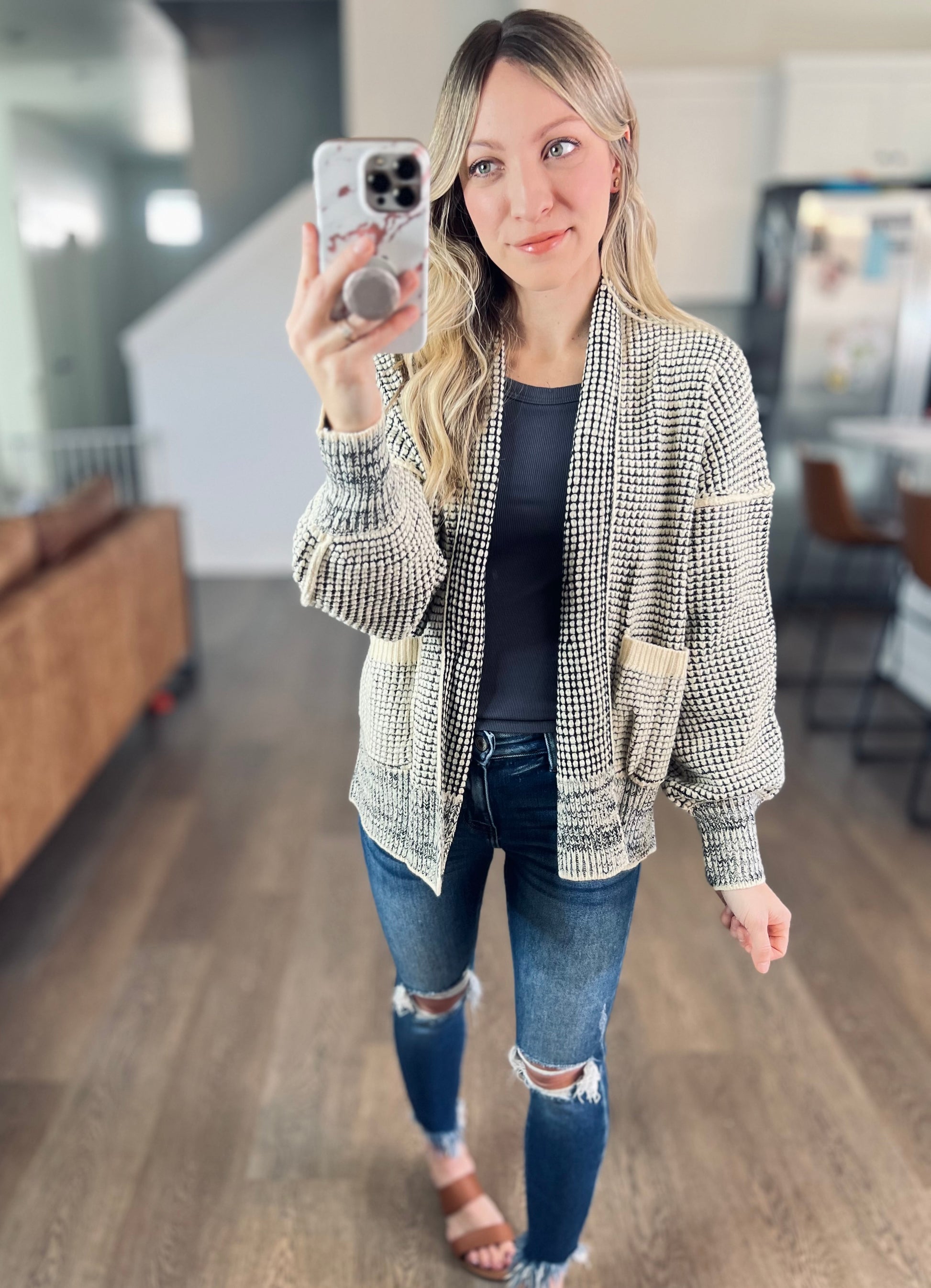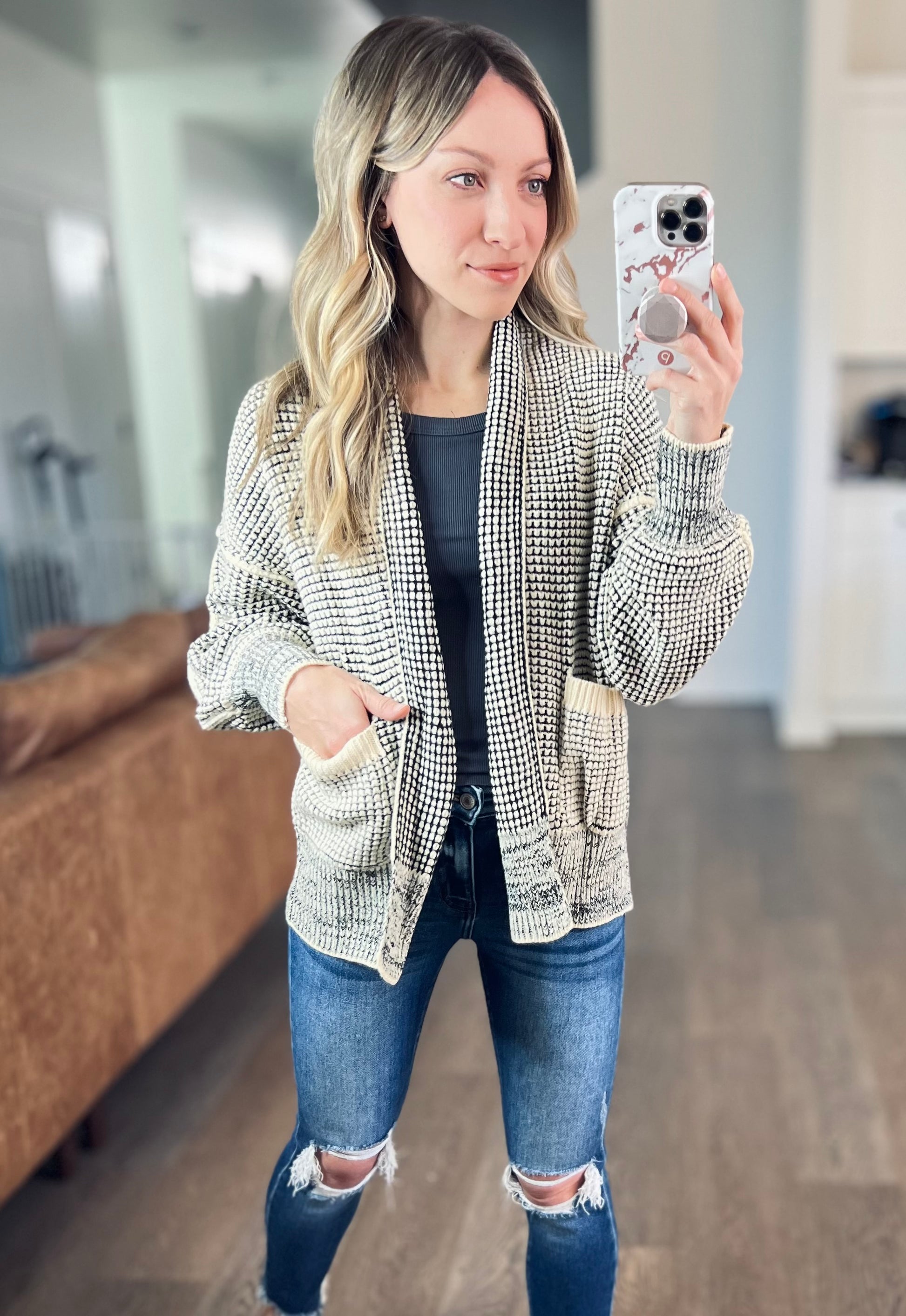 We always get asked about bringing in more cardis and this one is perfect! Pockets, medium weight, perfect not-too-long-not-too-short length, loving the variegated knit. Easy to pair with a cami, some jeans, and sneakers or dress it up a little!
