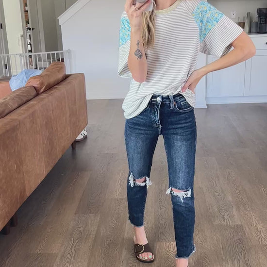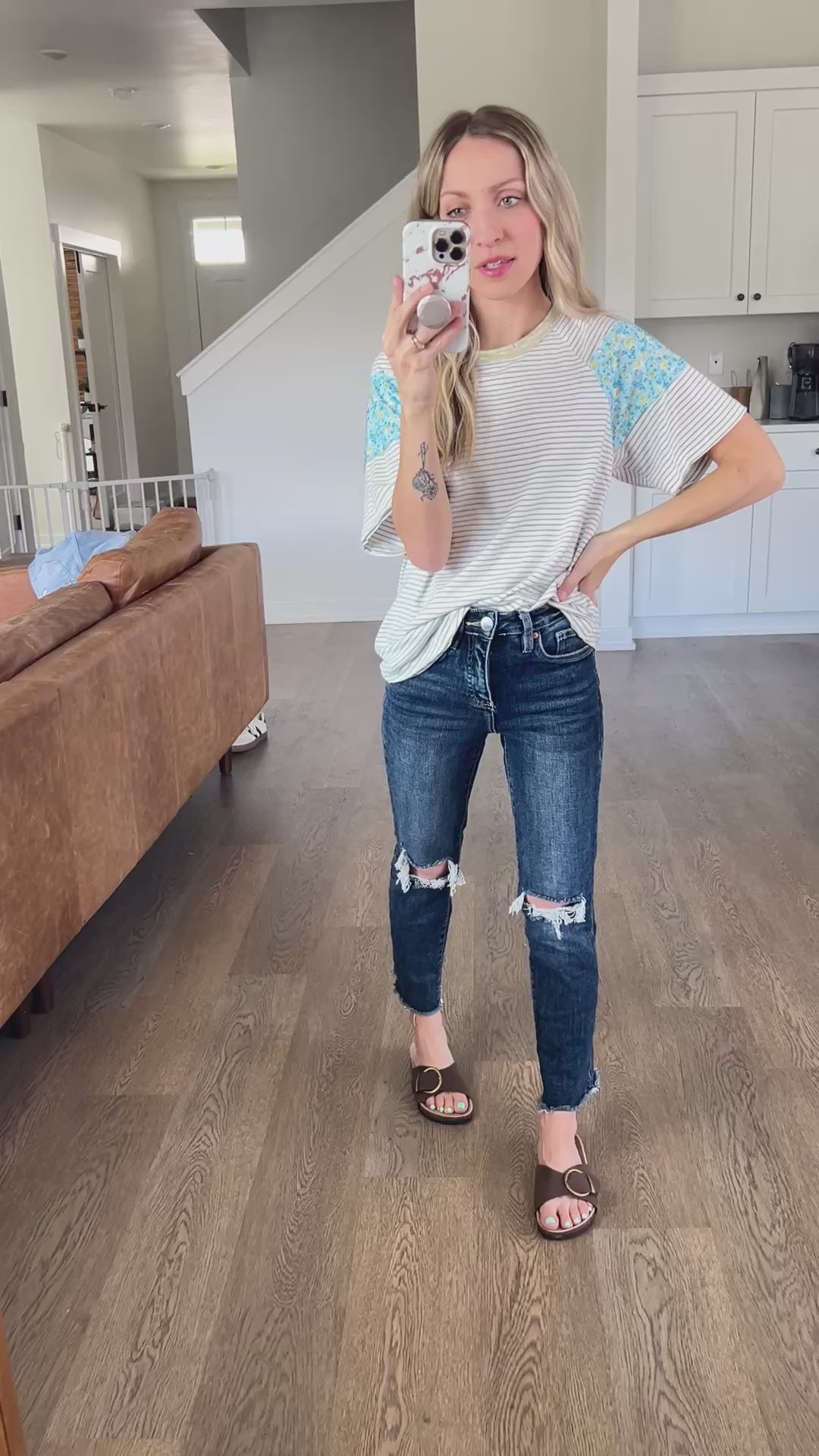Stripes and floral! My two favorite things. This is a relaxed fit style with cute details. Something you can wear every day and be comfy and cute in.