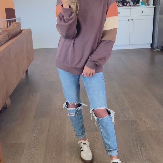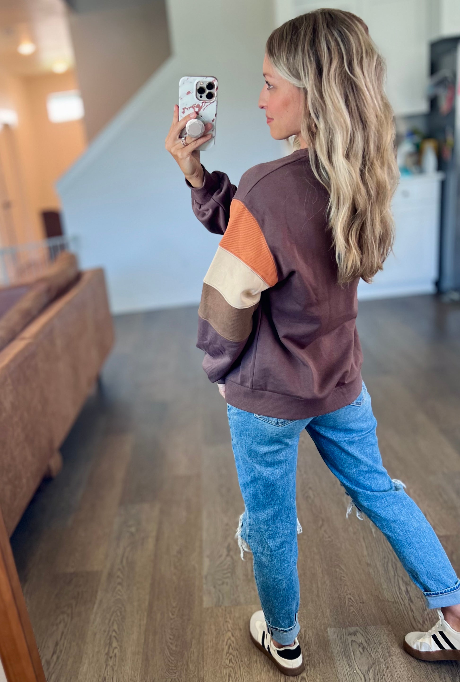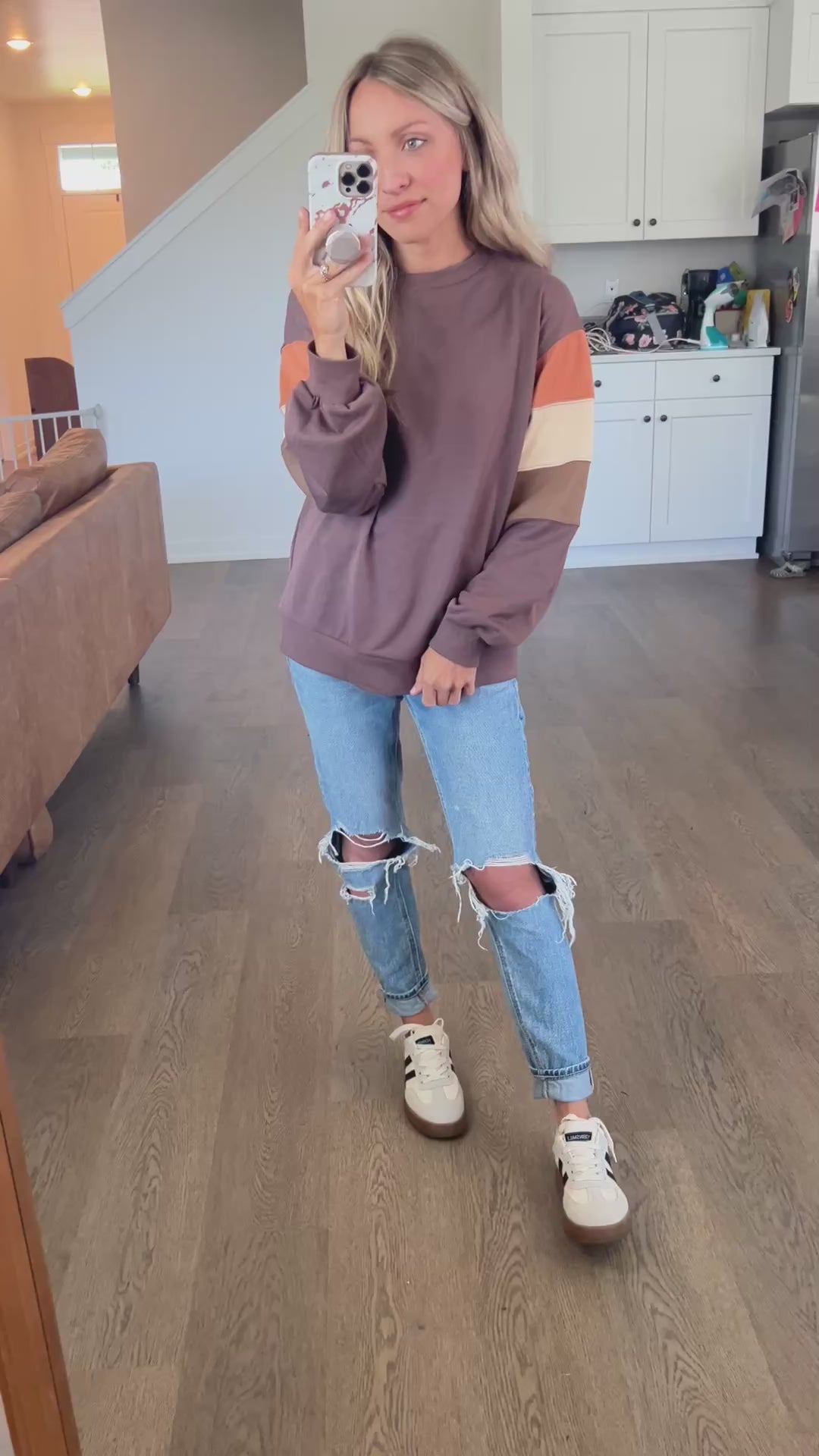 A little throwback vibe pullover. Medium weight, French Terry. Cozy colors. True to size.
