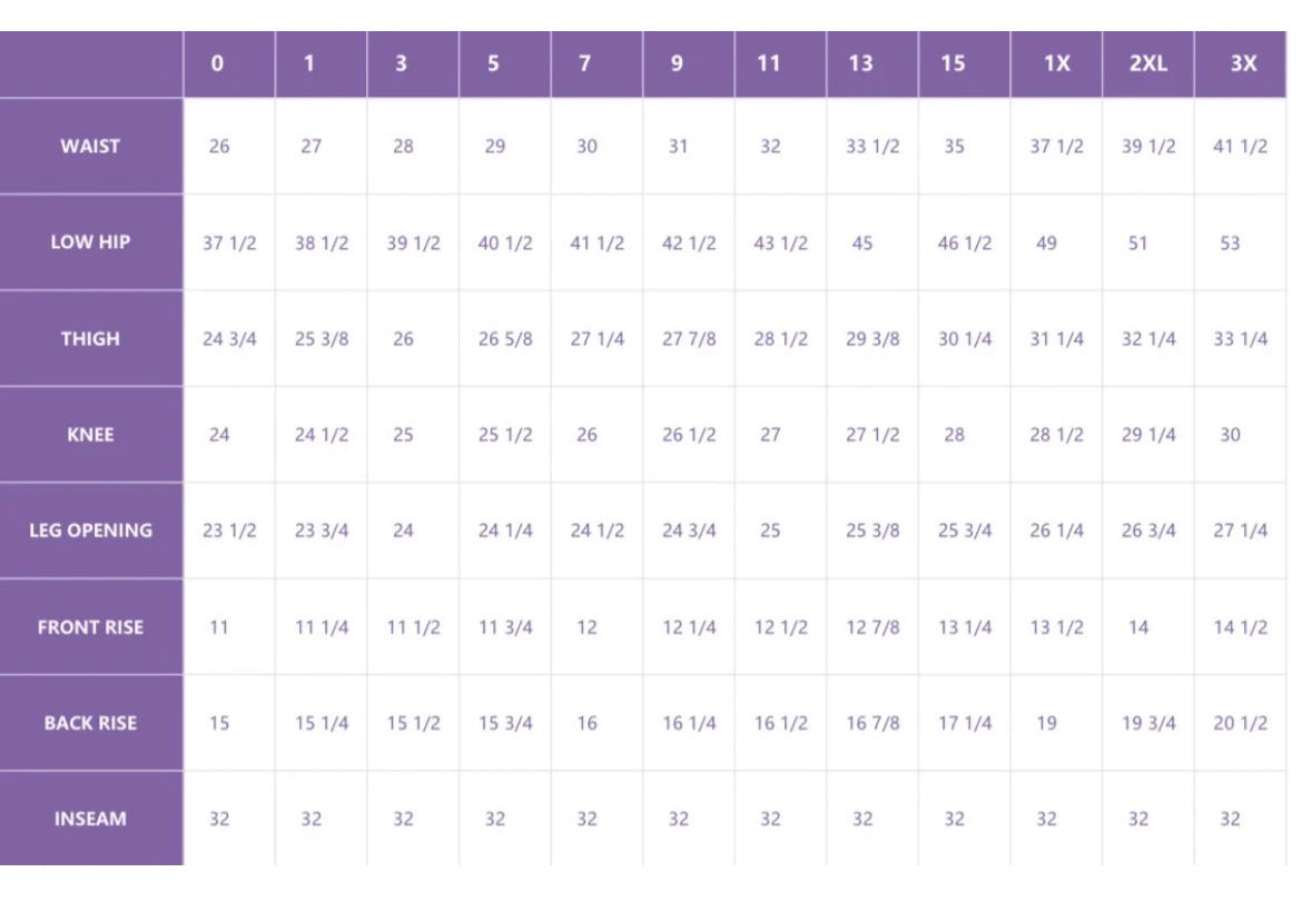 SIZE CHART W/MEASUREMENTS IN PHOTOS