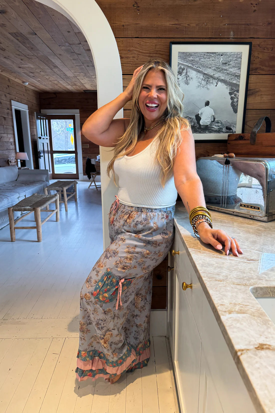 These are fun! Flowy bloomer pants featuring a soft floral print with a relaxed, easy fit. Designed with a comfortable elastic waistband and adjustable drawstring, plus tiered ruffle hems for a touch of romantic charm. Lightweight and breezy—perfect for lounging, brunching, or styling up with your favorite tanks and knits.