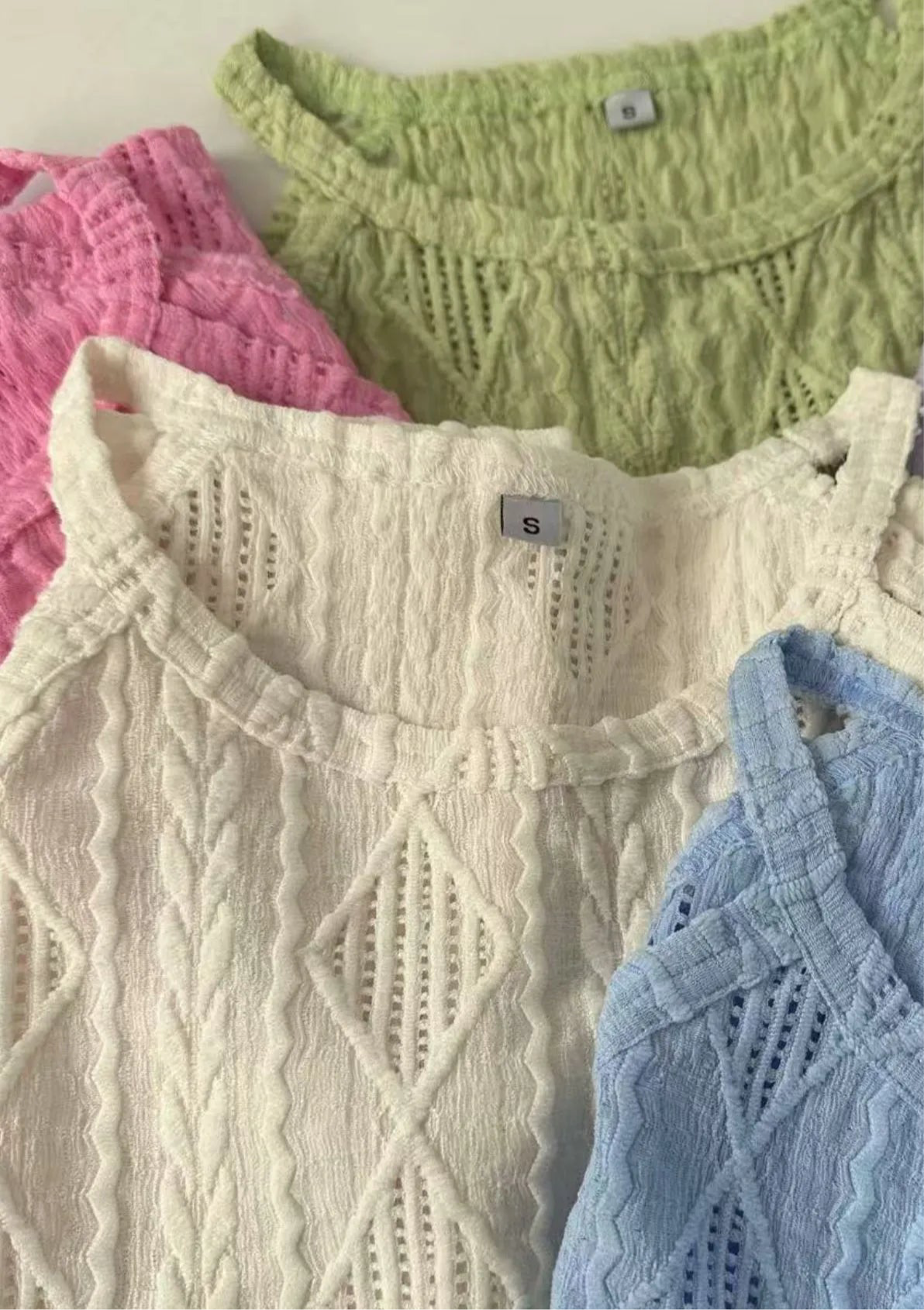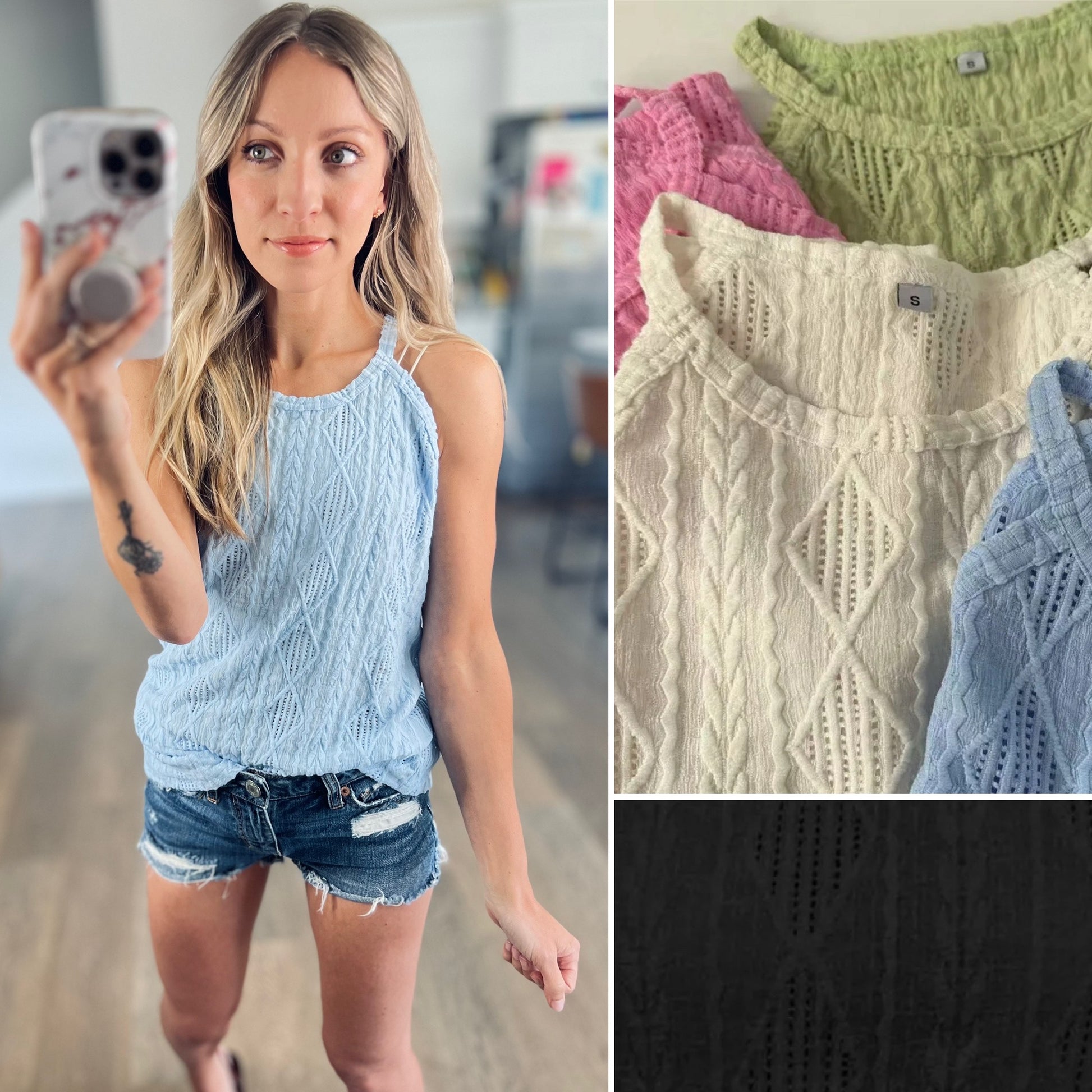 We have had this pretty weave material in a few tops and I have always loved it! These tanks are super cute alone but will be perfect to layer with a cardi come fall!