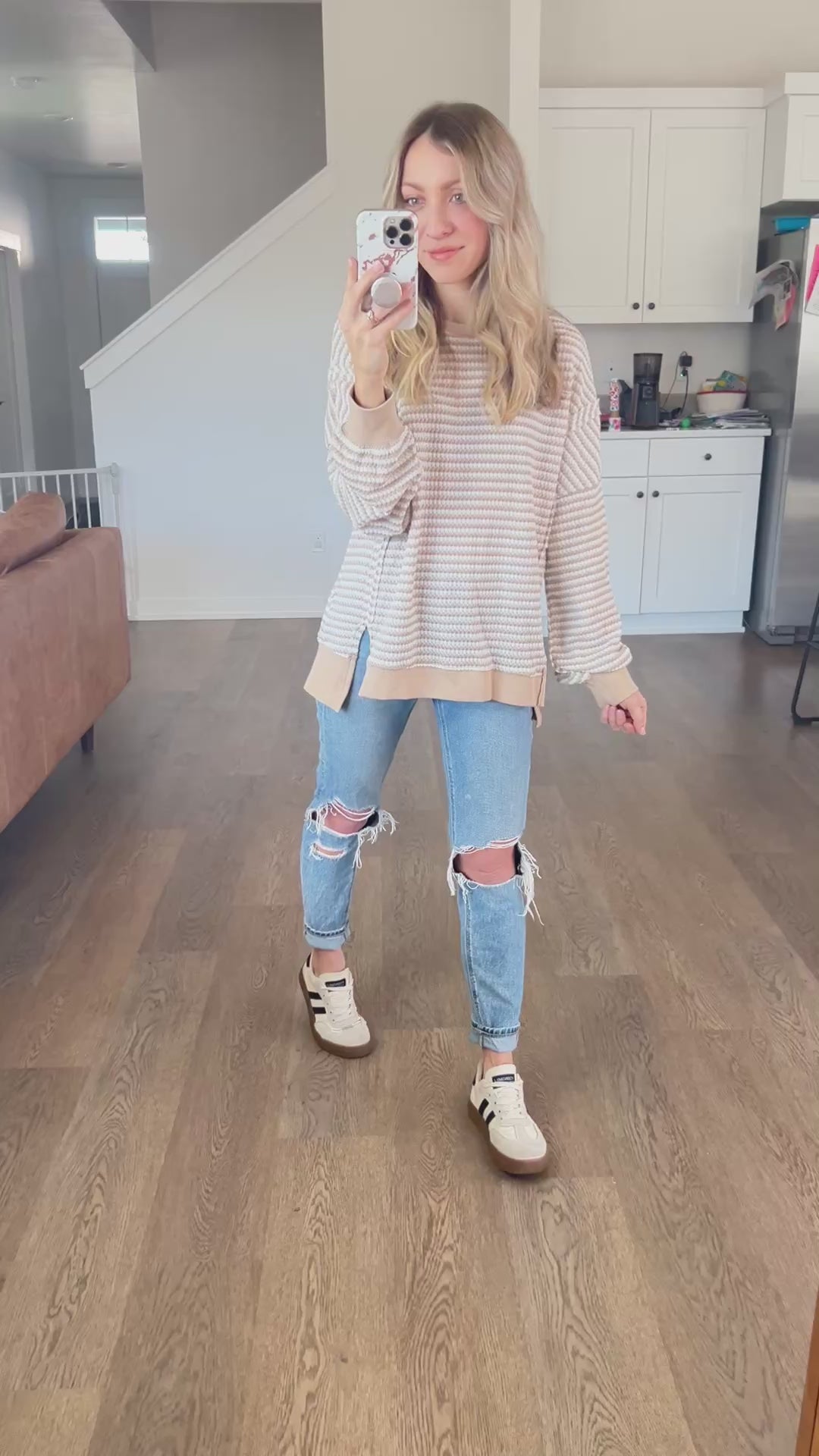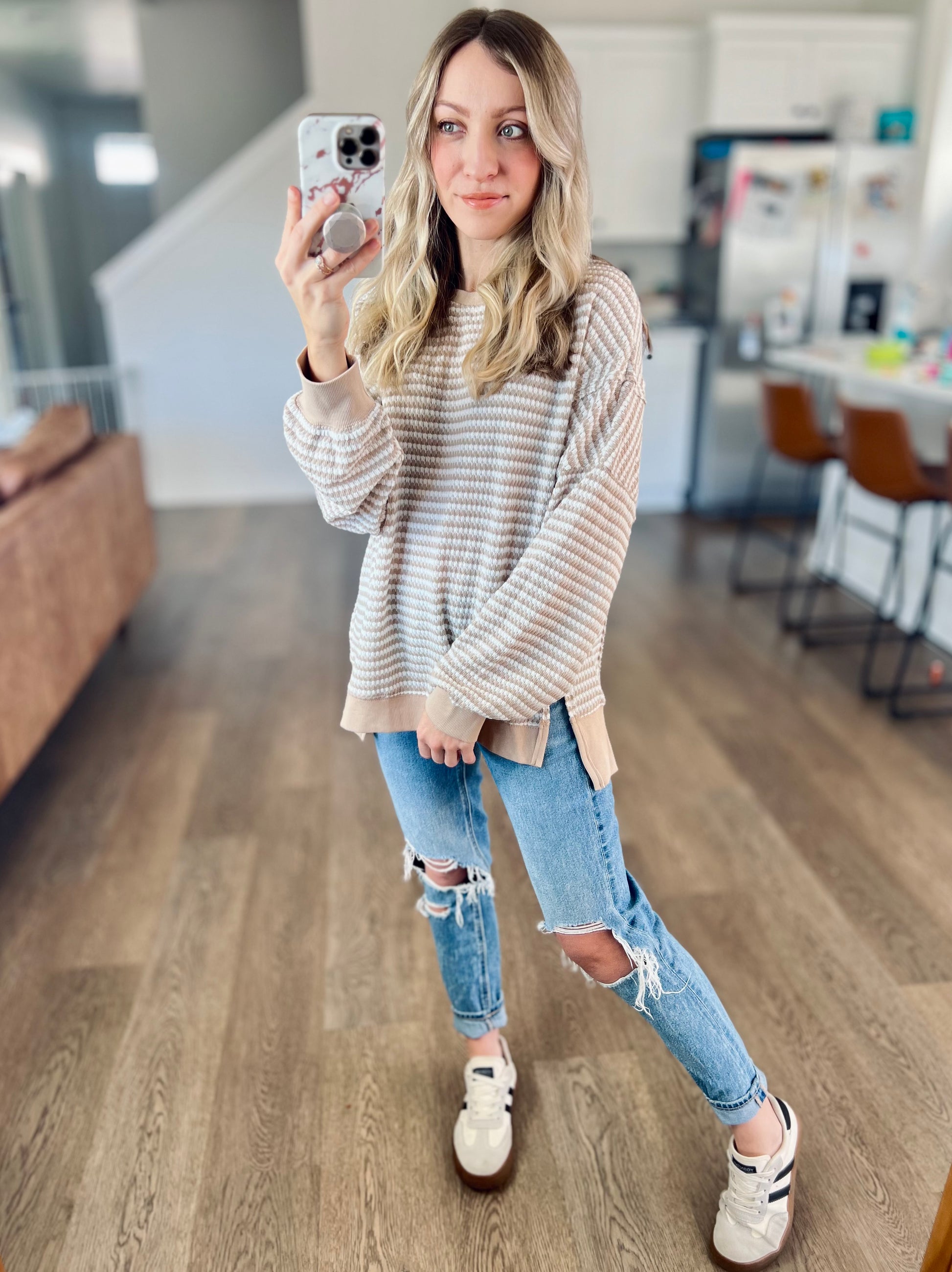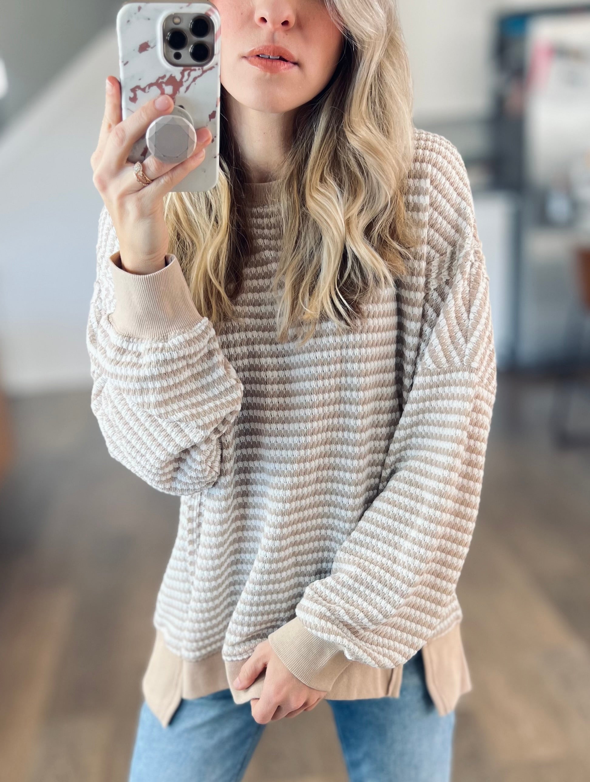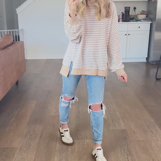 You loved the wine version we had before! A classic stripe in a comfy chunky waffle knit. It's a pretty neutral khaki color. Exposed seamline details and a hi-low style. Perfect for leggings and a cozy look!