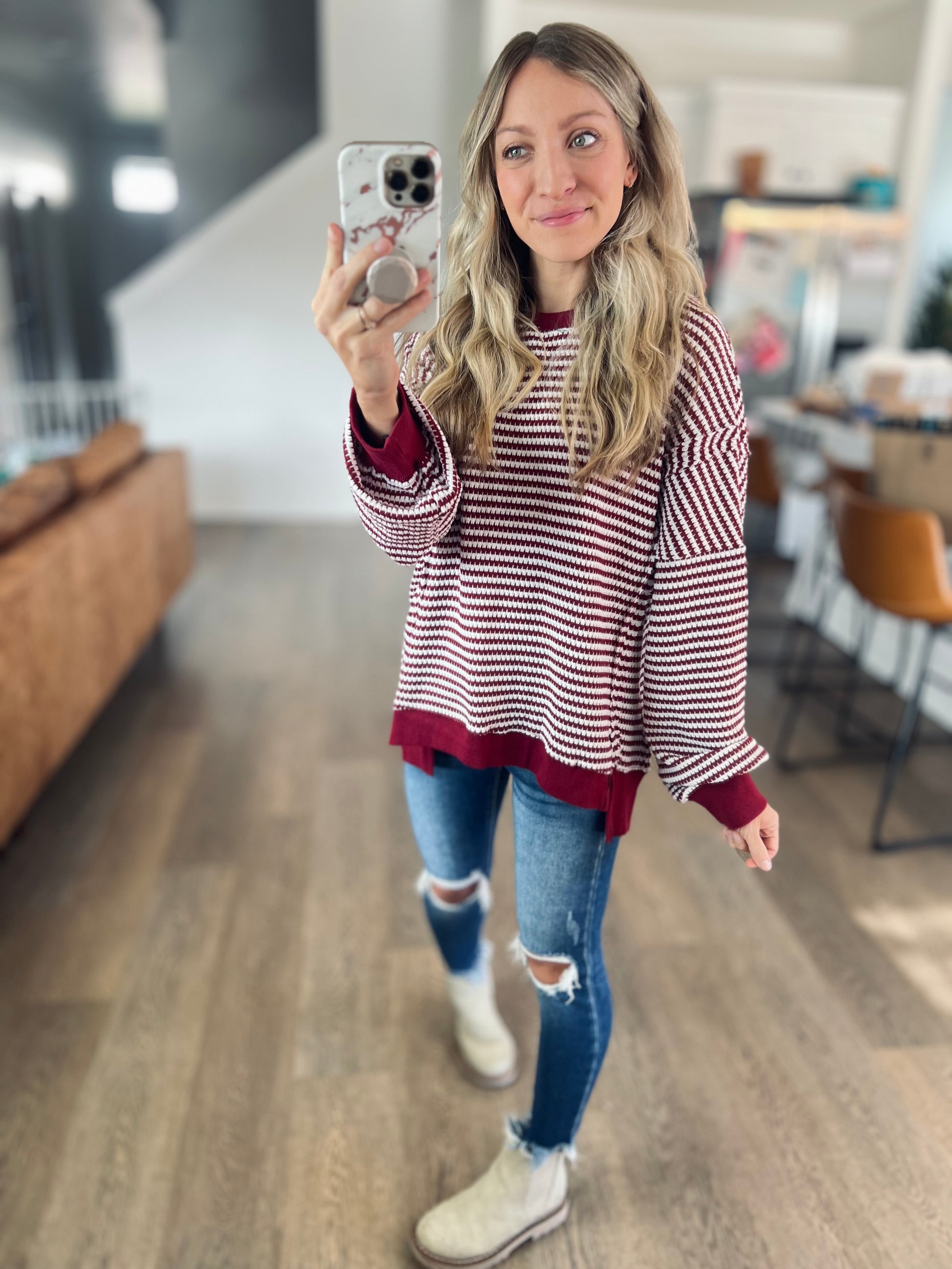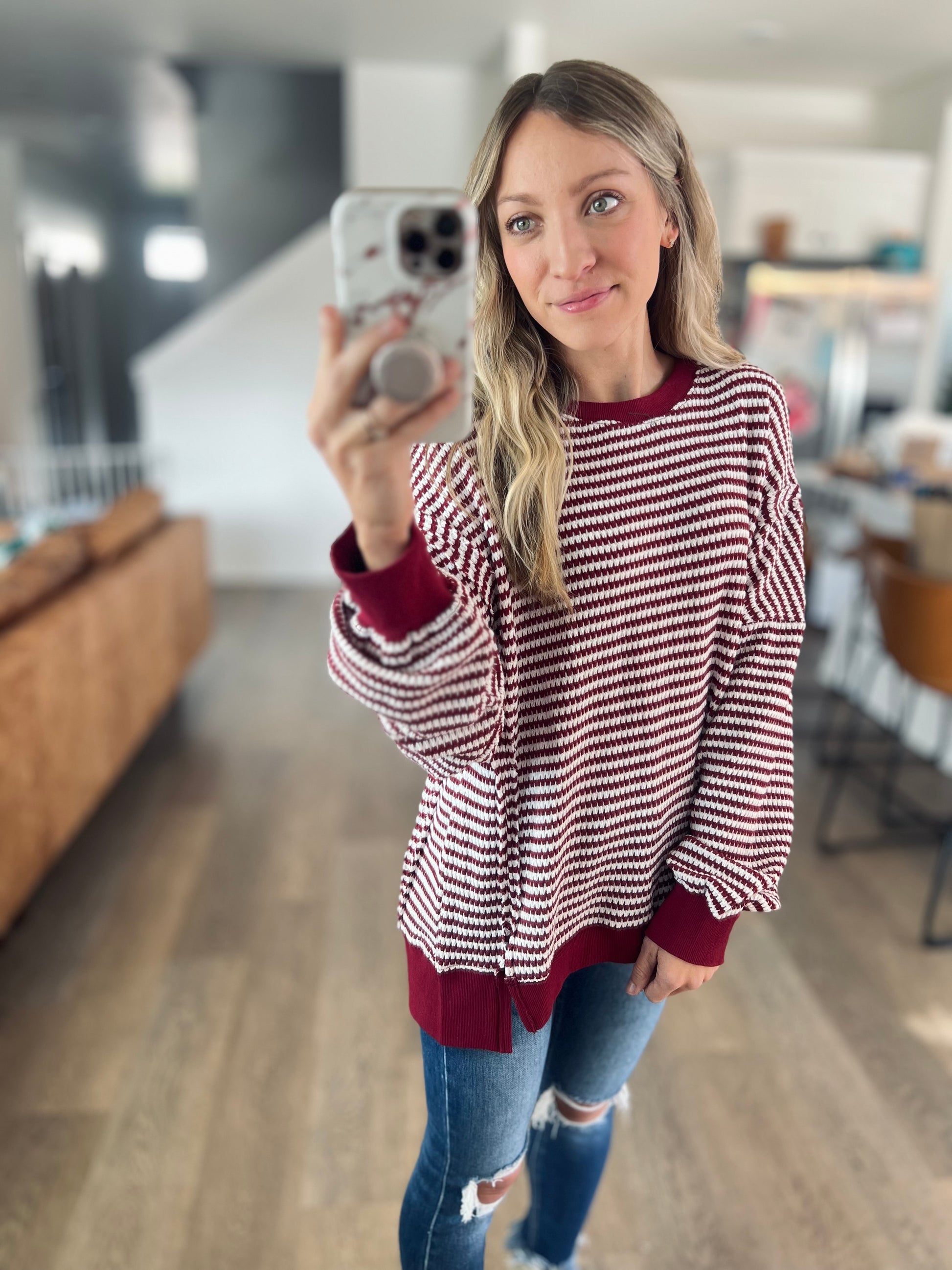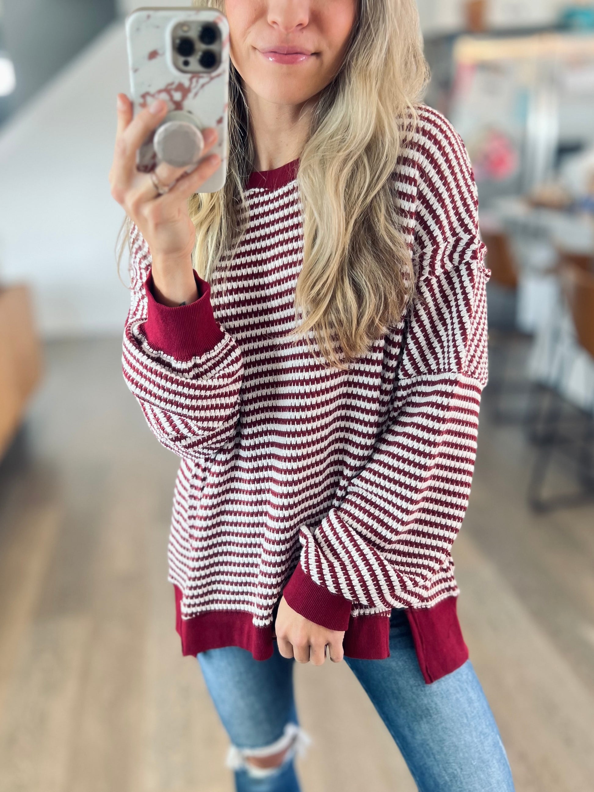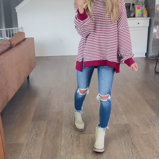 A classic stripe in a comfy chunky waffle knit. It's a pretty deep wine/red color. Exposed seamline details and a hi-low style. Perfect for leggings and a cozy look!