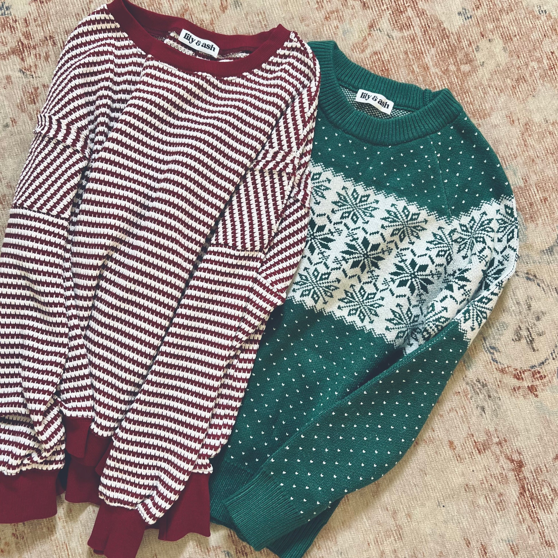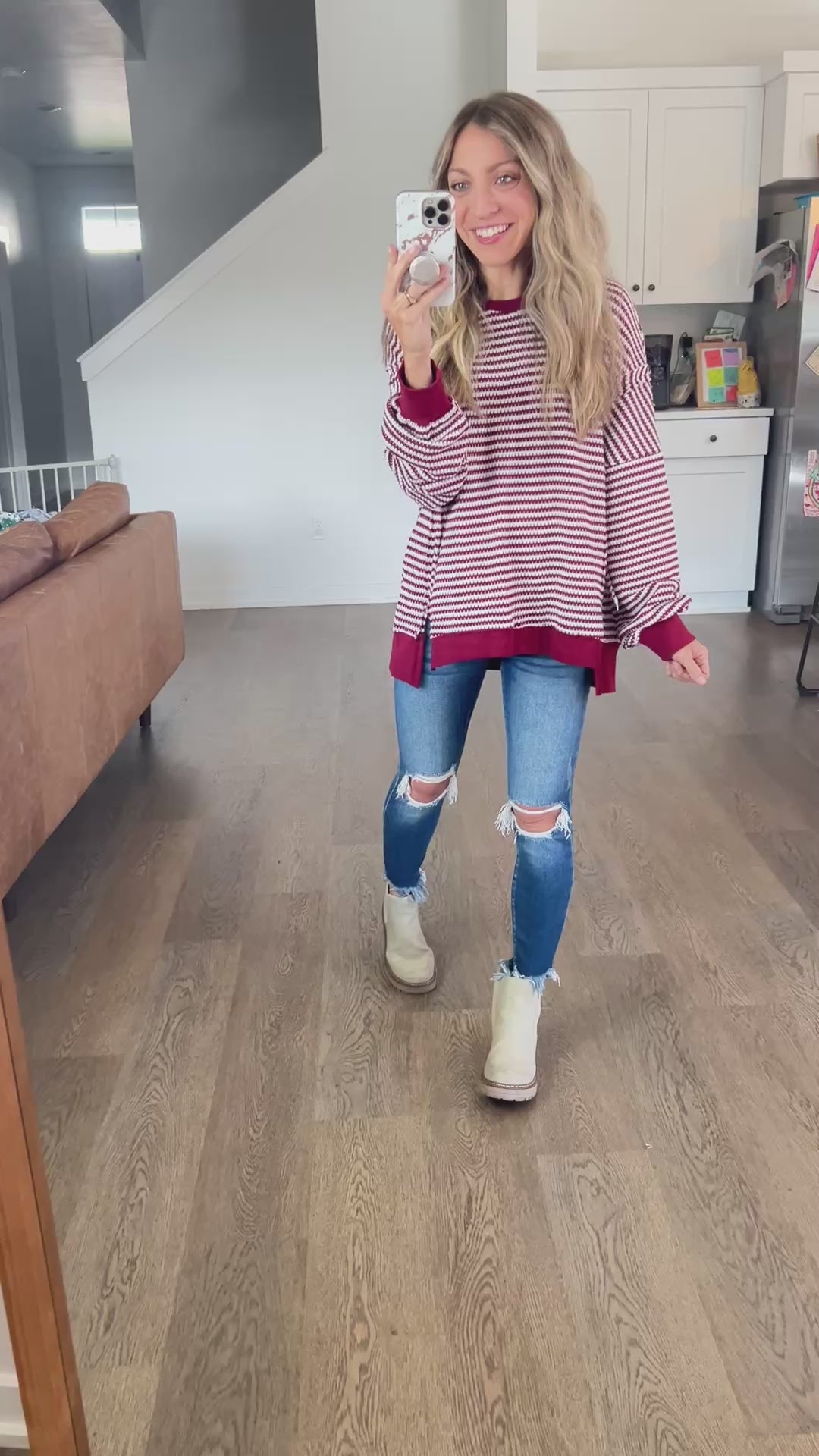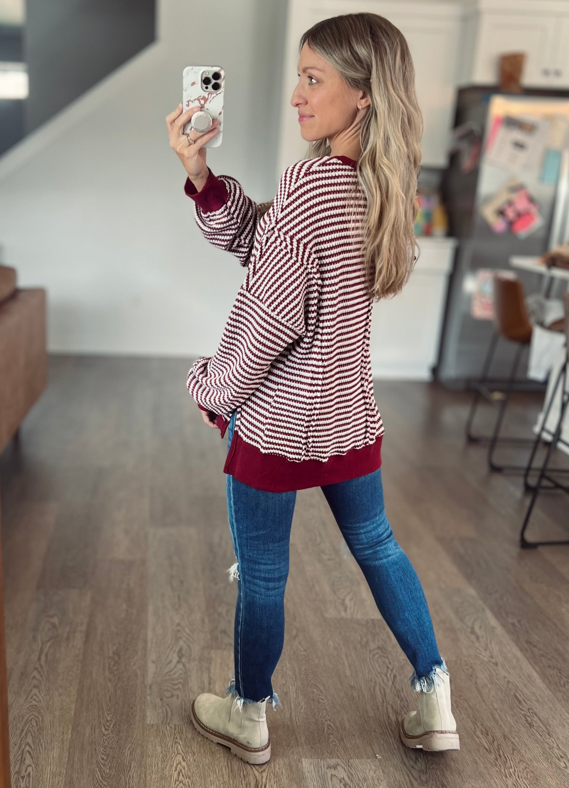 A classic stripe in a comfy chunky waffle knit. It's a pretty deep wine/red color. Exposed seamline details and a hi-low style. Perfect for leggings and a cozy look!