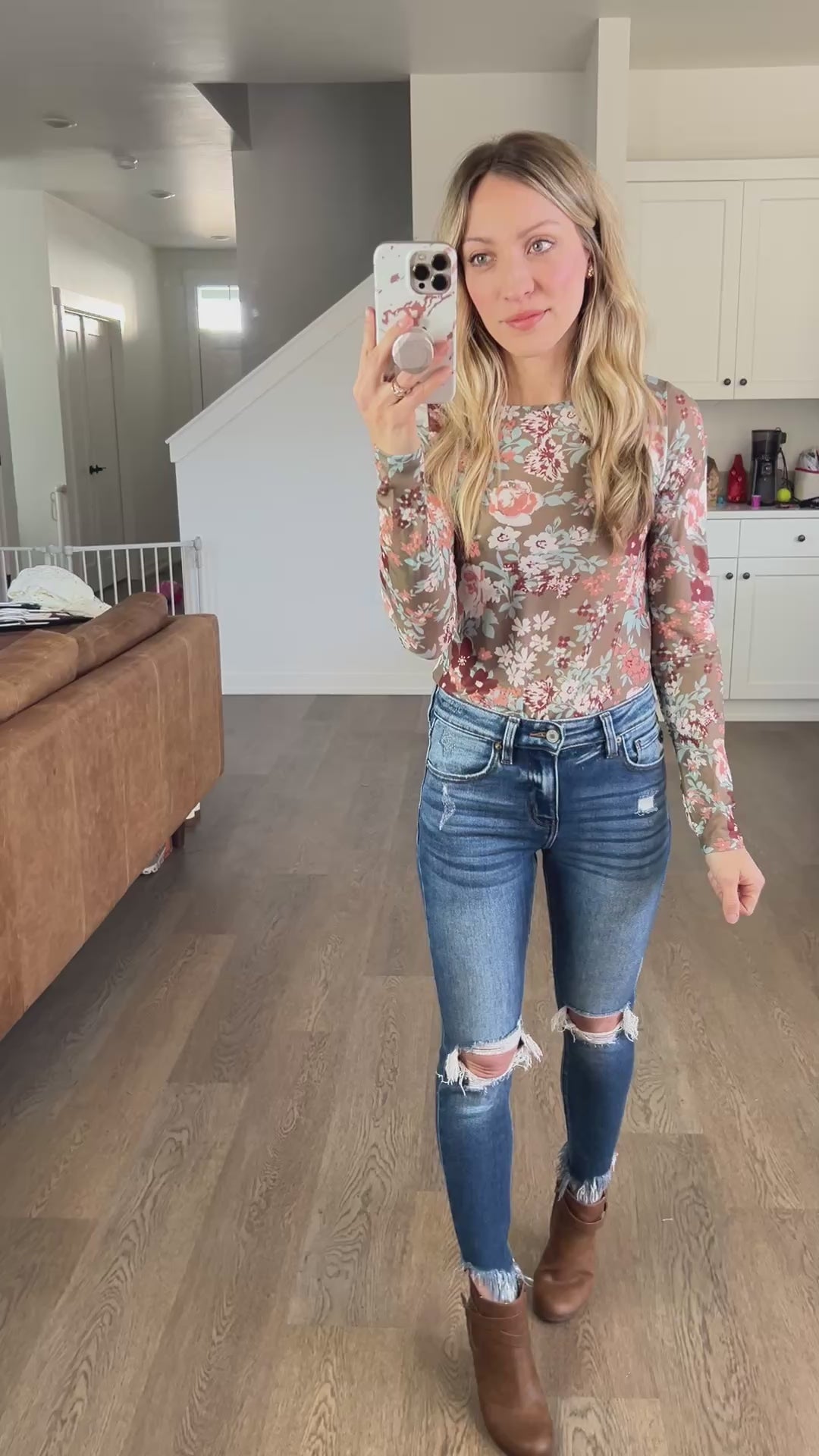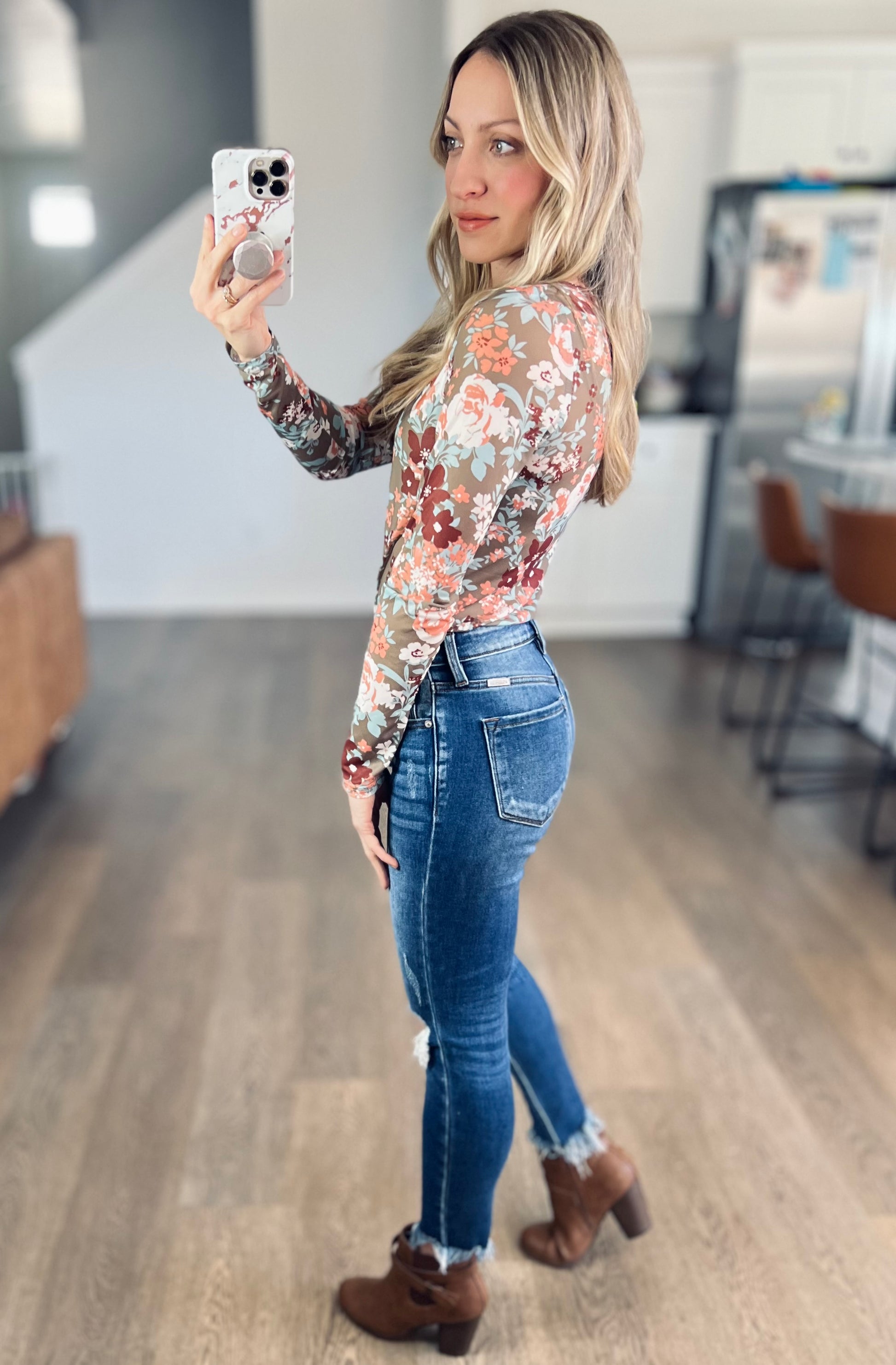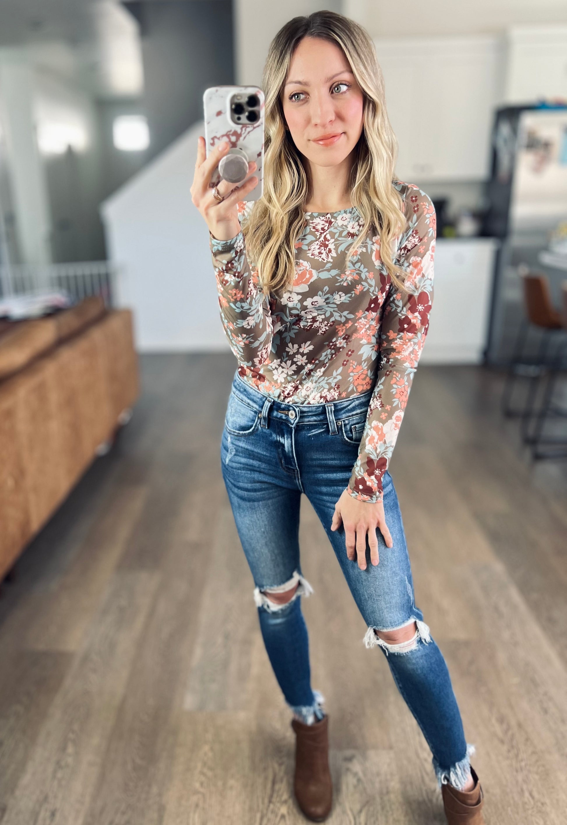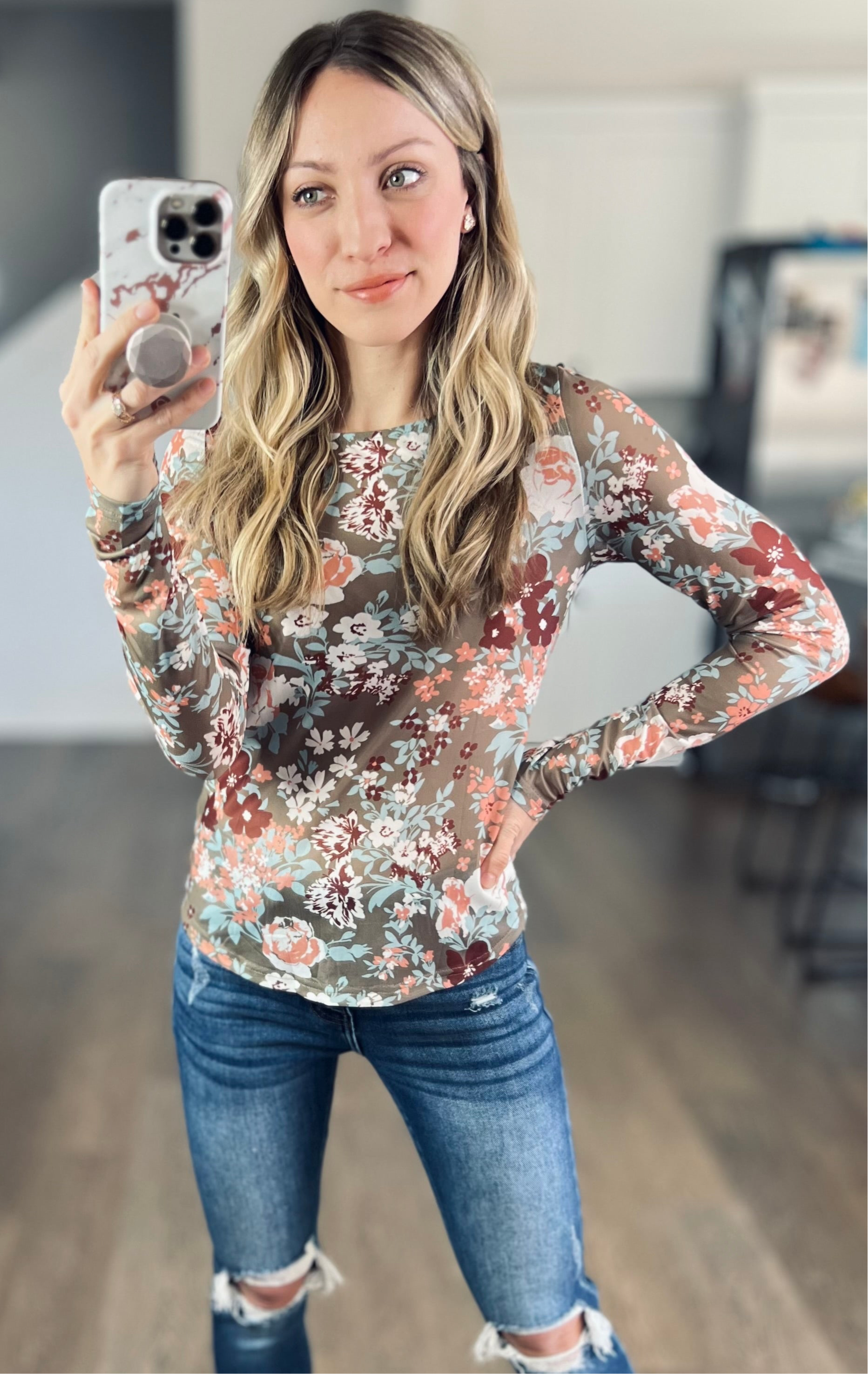 These mesh tops are so on trend this year and for good reason! This one is a sage with gorgeous florals. It’s a stretchy feel, more fitted, and perfect to wear alone, with a graphic tee over, a romper over, or tuck it in as a faux bodysuit!