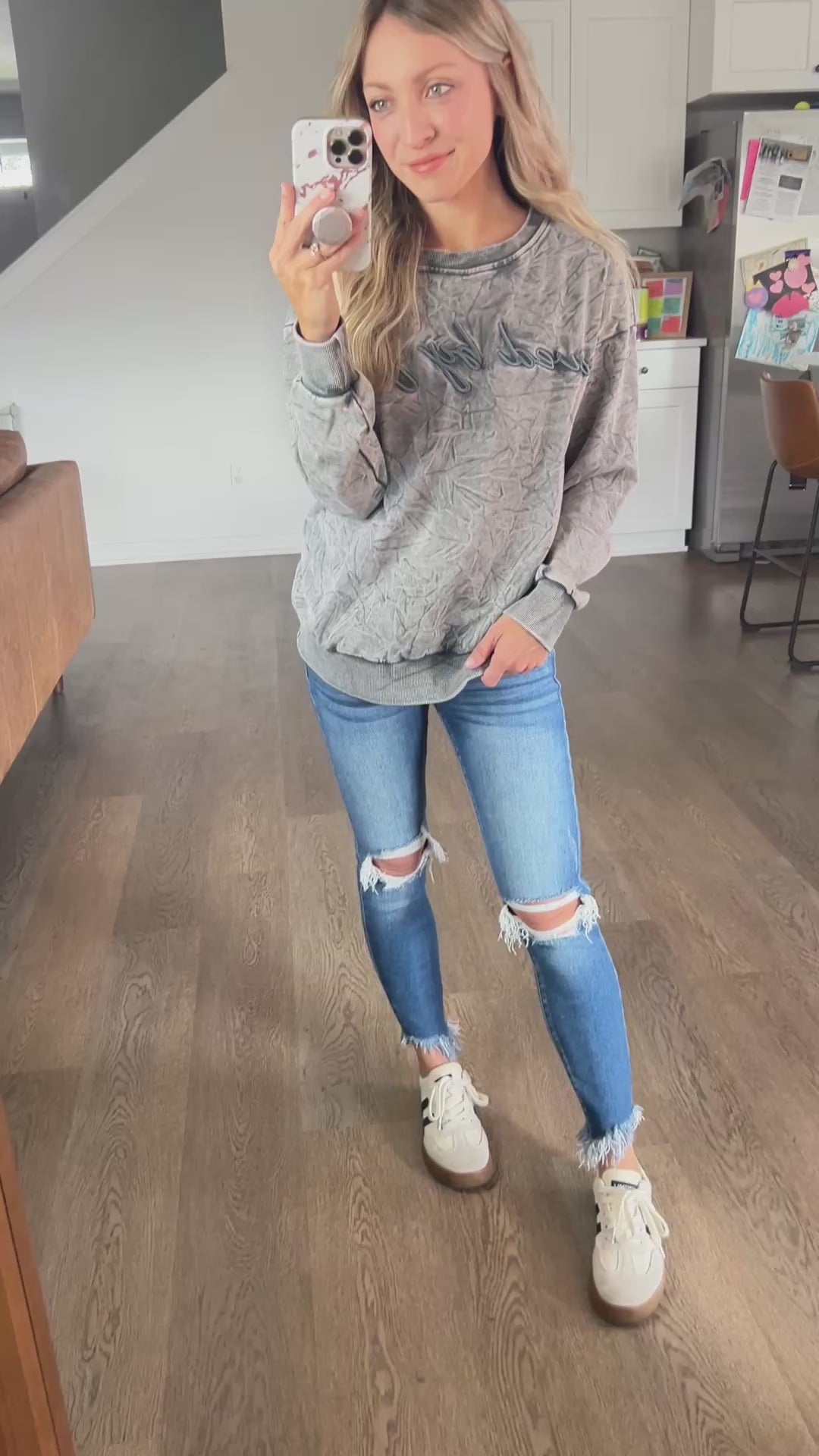 A fun take on a pullover! This is like an acid wash tie dye, almost camo look! Featuring “saved by grace” in embroidery. Medium weight French Terry. Color is like a dark charcoal with hint of blue.
