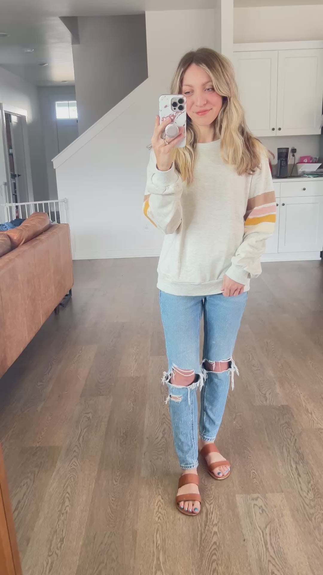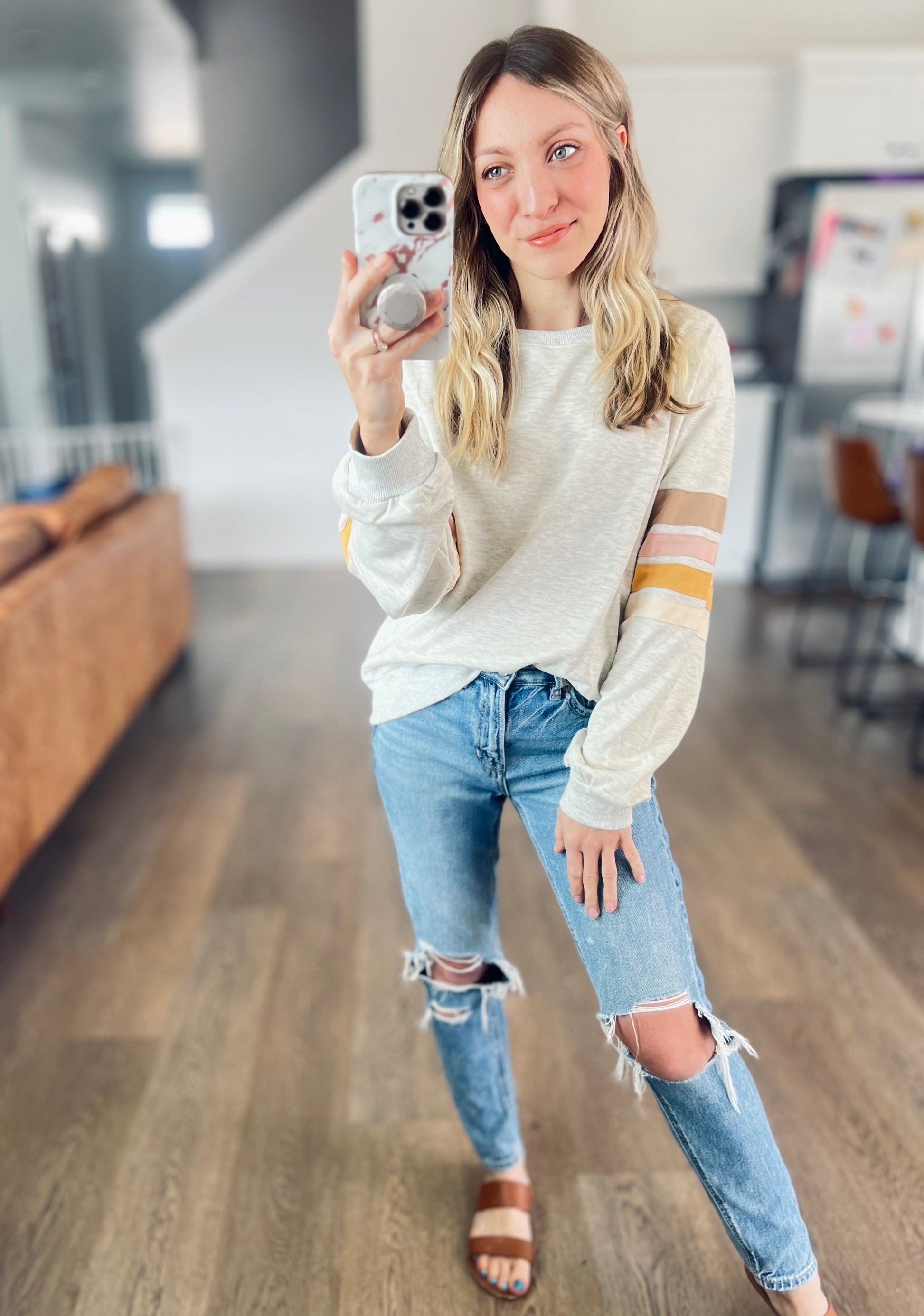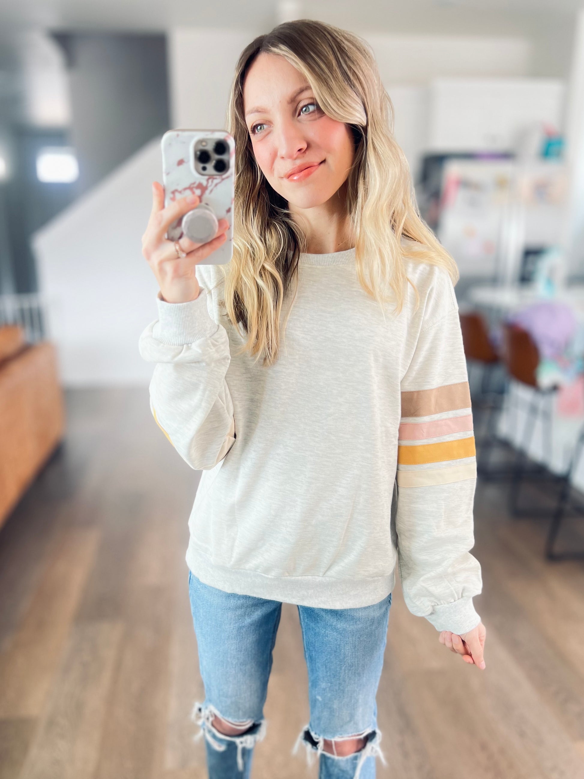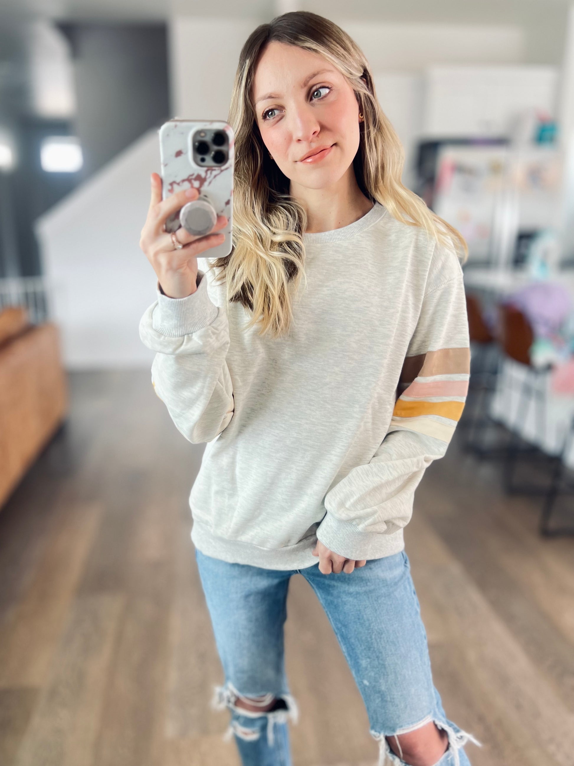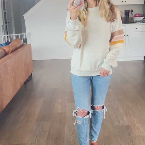 Simple but cute. This lightweight pullover goes a bit of a retro vibe while still being comfy and modern. Featuring a classic ash grey color with sweet stripes on the sleeves.